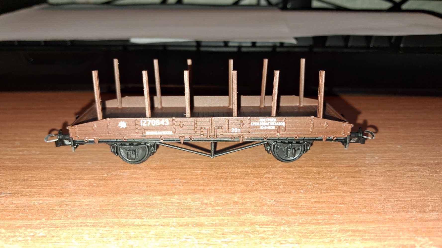 Платформа 20т с лесовозными стойками, пластик, сборка из кита, NEM шахты, тормоз Матросова (3d печать), 1000 грн