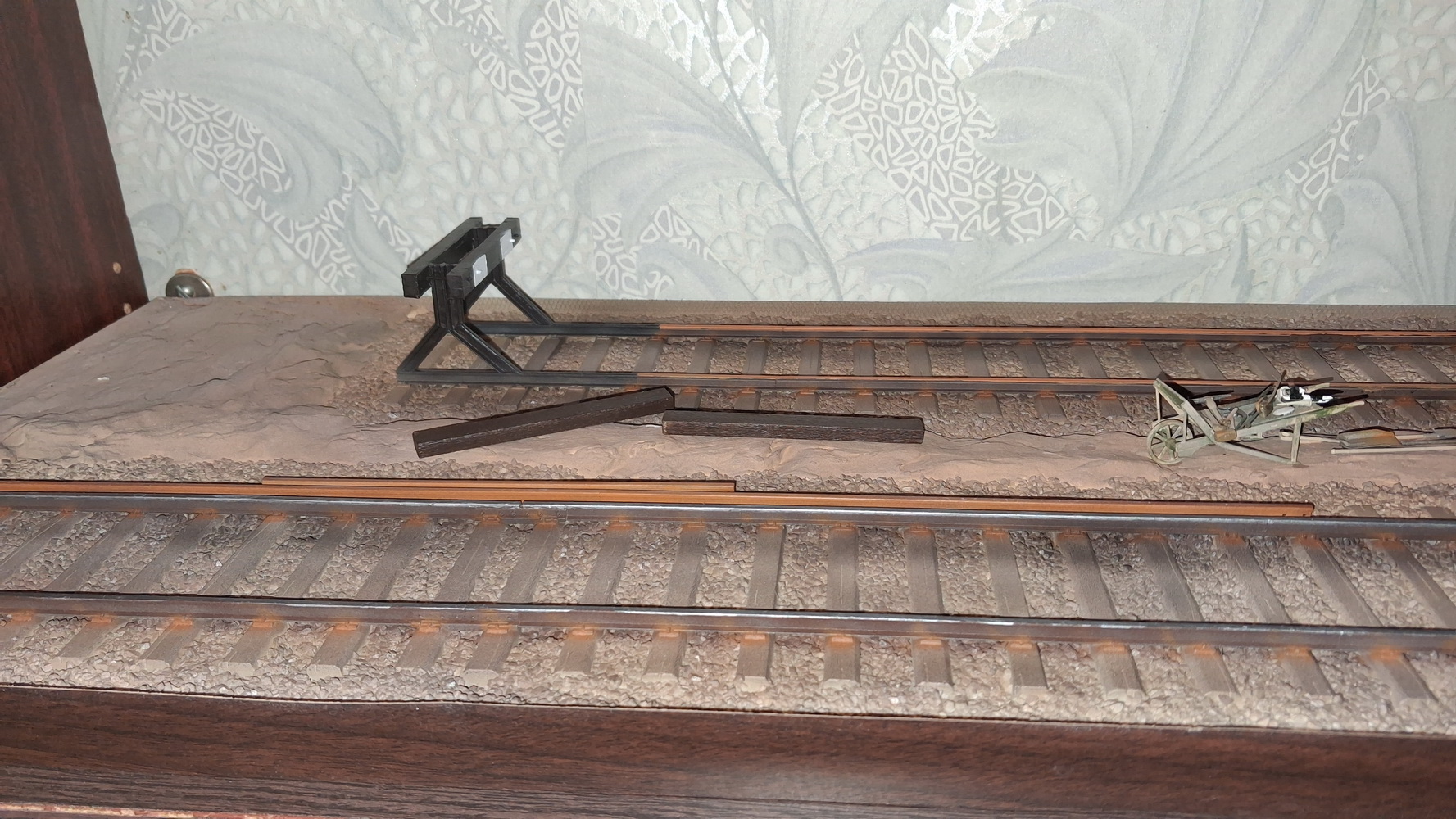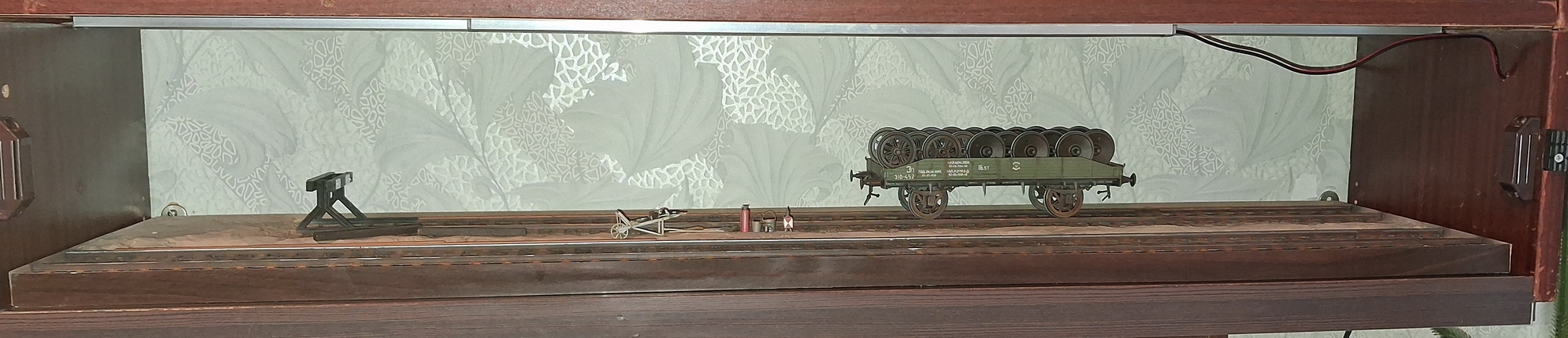 Діорама масштаб 1:35, 230х950 мм, 2 залізничні колії MiniArt 35565, одна з тупиком, набір путійського інструменту MiniArt 35572, платформа MiniArt 35303 з вантажем колісних пар MiniArt 35607. Діорама 1300 грн, платформа 2000 грн