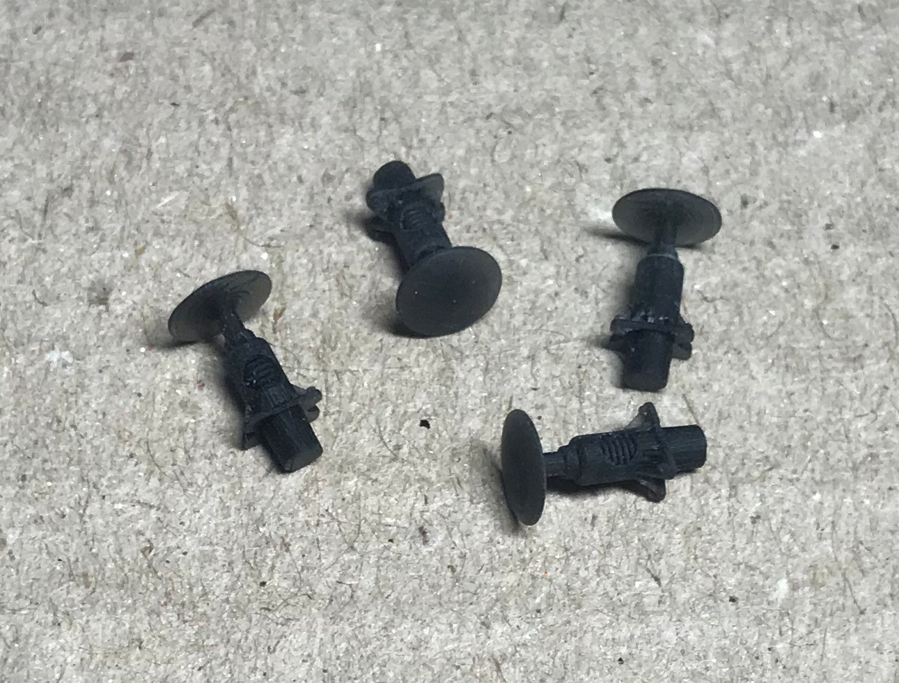 Боковини візочків 4-осного тендера до паровоза ОВ. Візочки вагонів типу "Даймонд". Зроблені з регулюємою довжиною зчепки, по потребі. Дахи до тепловозів BR-110 (V-100) старого PIKO. Ще дефлектори Чеснокова діаметром 320мм для вагонів і зчепки для заміни гачка Флешман на петлю Пико двох видів. Зчепки покажу згодом, як встановлю петлі.
