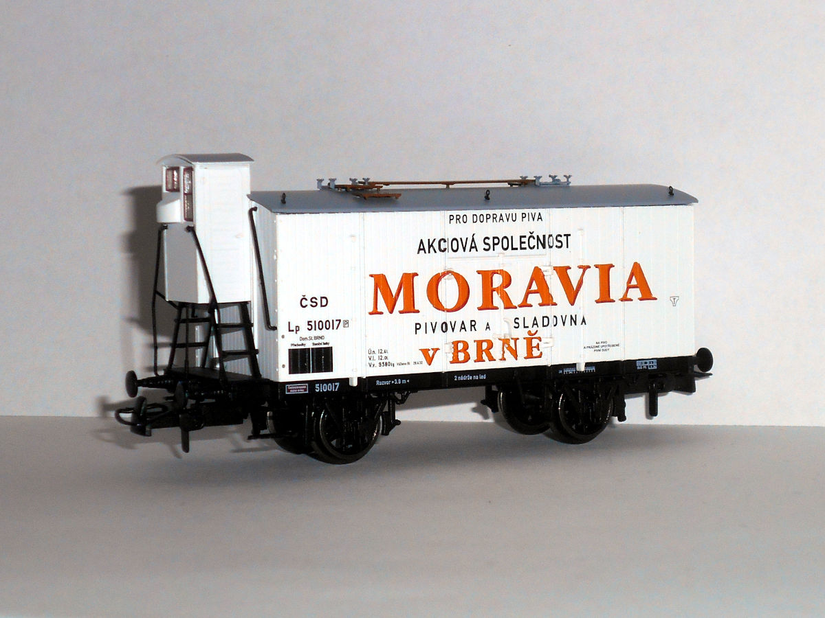 Кстати, о моравском пиве. Пивоварня, так и названная "Пивоварня Моравия в Брно", существует и работает по сей день. К сожалению, ни в одно из ее заведений не удалось попасть и оценить качество пива. Но удалось познакомиться с моделями ледников принадлежности этой фирмы. Выпускаются модели Heris (арт. 50032), соответствует прототипу II эпохи - но сам прототип находится на в Брно, а в Братиславе - вагон, в общем, знаком уже по Лужне у Раковника и Велке Бржезно, отличается только окраской, - и Brawa арт. 49777, на базе G10, III эпохи, со всеми ее атрибутами, но даты почему-то относятся к эпохе II.
