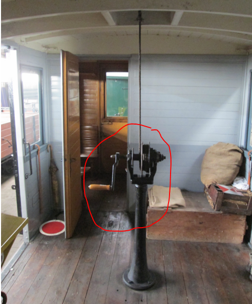 тормоза вагонов, данный вагон почтовый, спереди и сзади еще подцеплены пара, эта лебедка и управляет тормозами ручными трех вагонов.