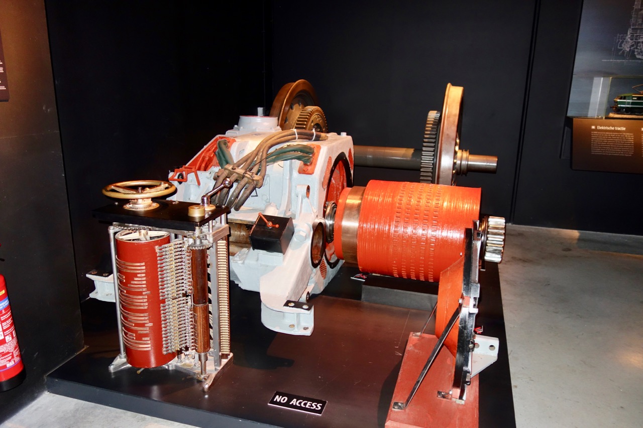 Электрификация в Бельгии произошла довольно поздно - такова цена государственной монополии. В 1935 году, день в день через 100 лет после поездки первого бельгийского поезда, открылось движение электропоездов между Брюсселем и Антверпеном. В составах было четыре вагона, из которых два крайних имели кабины. Вот как раз такой "крайний" вагон и представлен в музее. Называется он по-старинке "автомотрисой" (точнее, AM 35, где AM от слова "automotrice", а 35 - год постройки), хотя, конечно, ближе к электричке.
