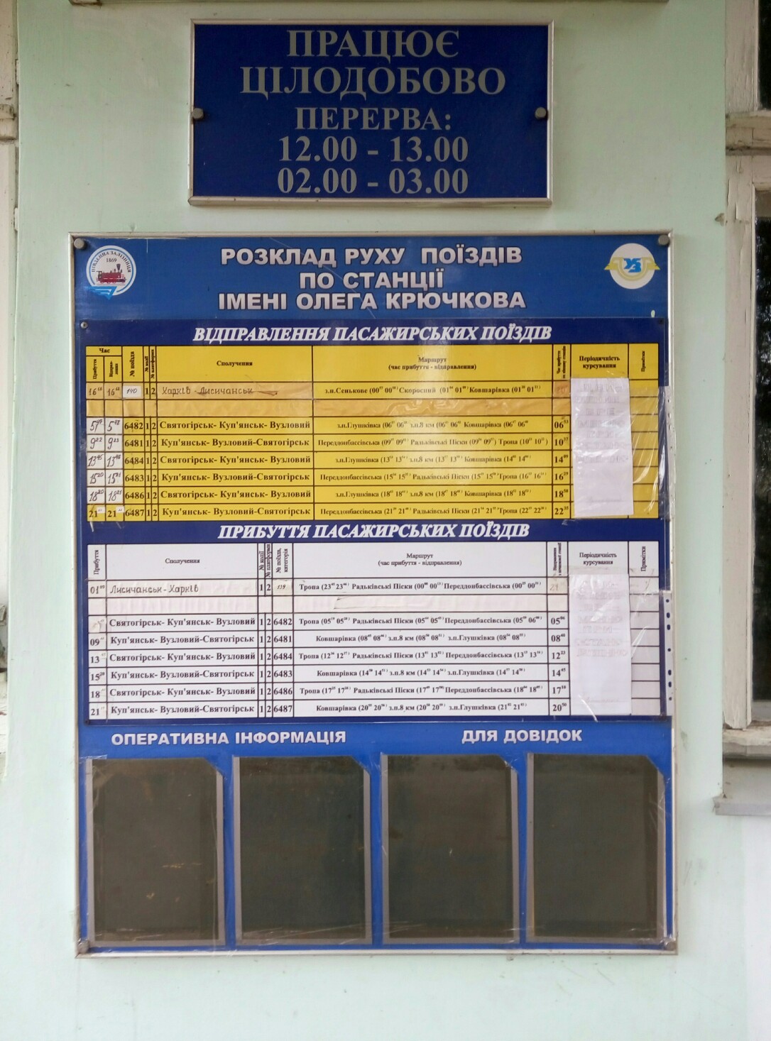 И немного “эксклюзива”. Это - замечательный участок Купянск - Святогорск. К восстановлению движения здесь только готовятся. А как напоминание о мирной жизни, здесь сохранилось довоенное расписание движения электропоездов и поезда Х - Лисичанск. А сама эта станция ранее называлась “Колхозная”. Около 15 лет тому назад я совершал автопоездку по этим местам, а позднее - электропоездом. И я никогда бы не подумал, что здесь придется побывать уже при совсем других обстоятельствах.