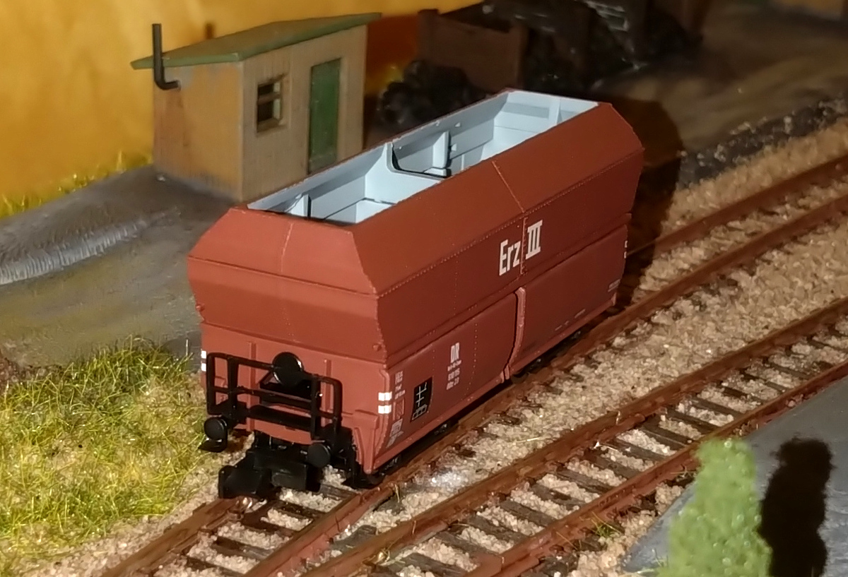 Также есть еще одна оговорка по поводу модернизаций данного вагона. Существовало три варианта загрузочной высоты в зависимости от плотности груза. Стандартный вагон - ErzIII - с полным использованием габарита. Однако для некоторых грузов он был слишком высоким, т.к. плотность перевозимого материала не позволяла загрузить вагон доверху без превышения нагрузки на ось. Соответственно, были варианты со сниженным бортом (ErzIId) и - специально для железной руды - с низким бортом, чуть выше уровня петель разгрузочных крышек - ErzId. Последних было выпущено 45 экземпляров, они имели ограничение по скорости 55 км/ч, и использовались только на одном маршруте и только для руды. Буква "d" в обозначении говорит о наличии тележек (т.е. у вагона ErzIII - 4 оси в жесткой раме, у ErzIIId - две тележки)