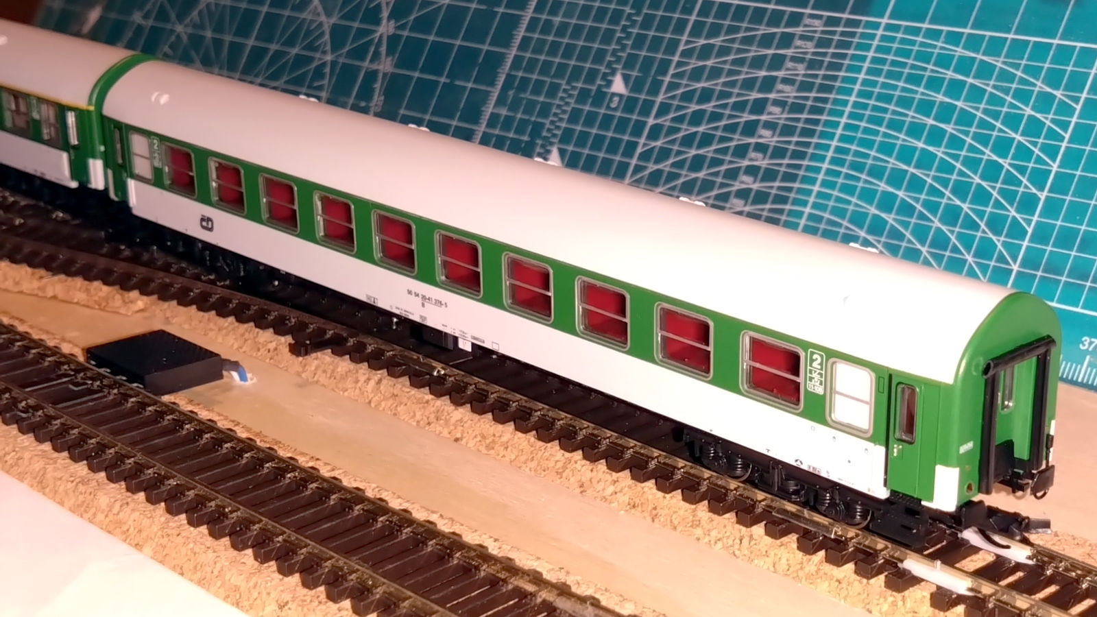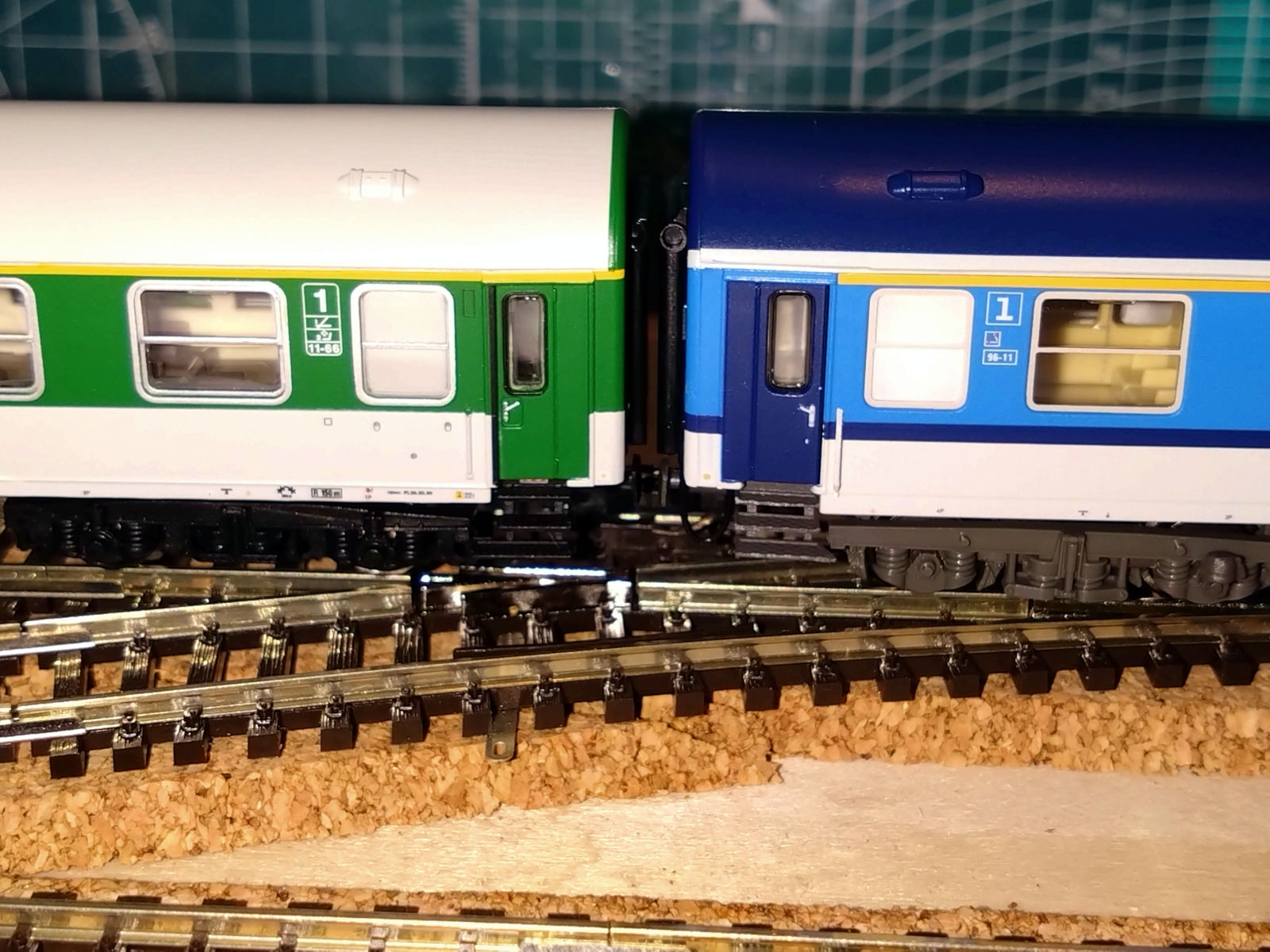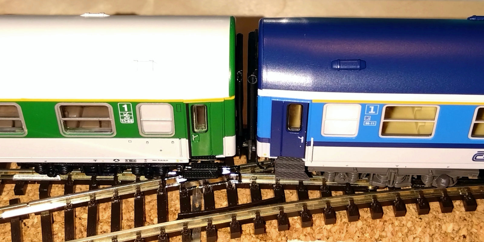 Рядом Роко и Тиллиг в одном составе смотрятся несколько странно. Если не приглядываться - вполне органично, только и того, что небольшой зазор между ними (видимо, зазор от расположения сцепки на Тиллиге, поскольку два вагона Роко стоят почти вплотную, не совсем понятно, насколько это хорошо для поездок на макете, тем не менее). Но у них несколько отличается геометрия крыши (полмиллиметра на корпусе в одну сторону и столько же на торце в другую дают о себе знать) и при одинаковой окраске эффект может быть не совсем приятный. В любом случае, явного и нарочитого несоответствия у моделей нет, есть только мелочи, но дьявол прячется в деталях, а их набралось, как видите, довольно много.