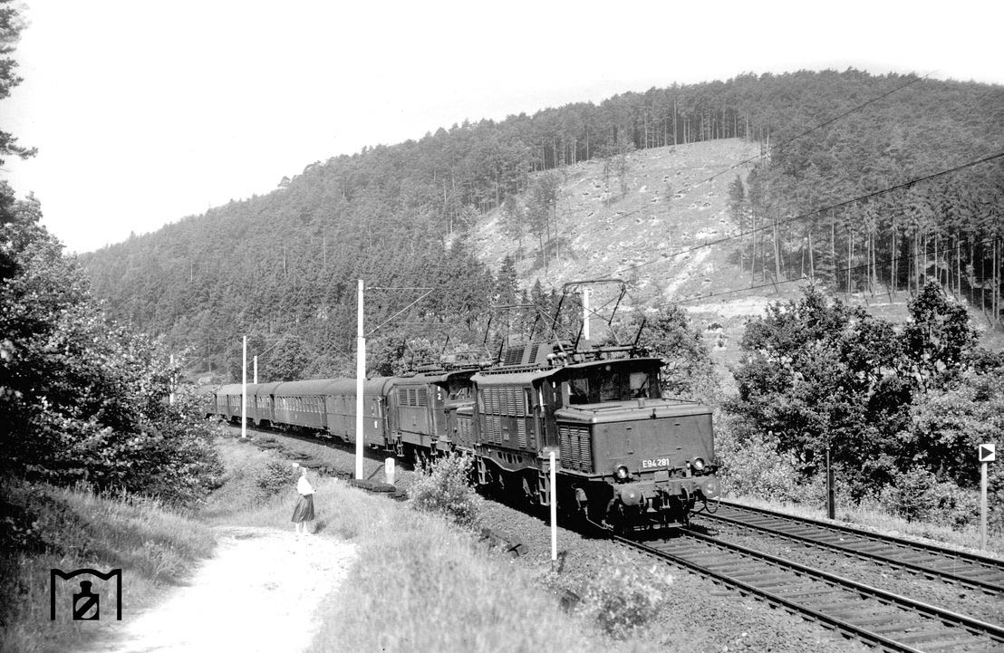 Можу припустити, що це все ж таки межзонний (Interzonenzug) пасажирський потяг, бо в составі проглядаються вагони типу BD4yg або щось подібне, котрі також використовували у Interzonenzug. На "важкому" профелі колії дуже часто чіпляли допоміжну тягу для здолання, наприклад, підйому в горах. Таким чином можемо припустити що Е44 068 приписки DR, що базувався у Лейпцизі, тягнув межзонний потяг і на окремій ділянці на території ФРН для проходження гір йому прийшов на допомогу Е94 281 приписки DB.