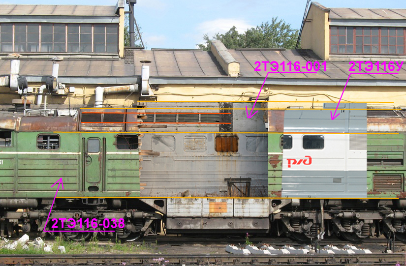 Так, ну вот добрался я до компьютера, имеем результат. Сравнивал боковины 2ТЭ116-001, 2ТЭ116-038, 2ТЭ116У. Как и ожидалось, крыша на 001 была такой же высоты, до которой ее наращивали отдельными частями на 2ТЭ116У/УД/УР. Решетки тоже ожидаемо оказались одной высоты на 001 и 038. В общем, если остались вопросы, попробую ответить