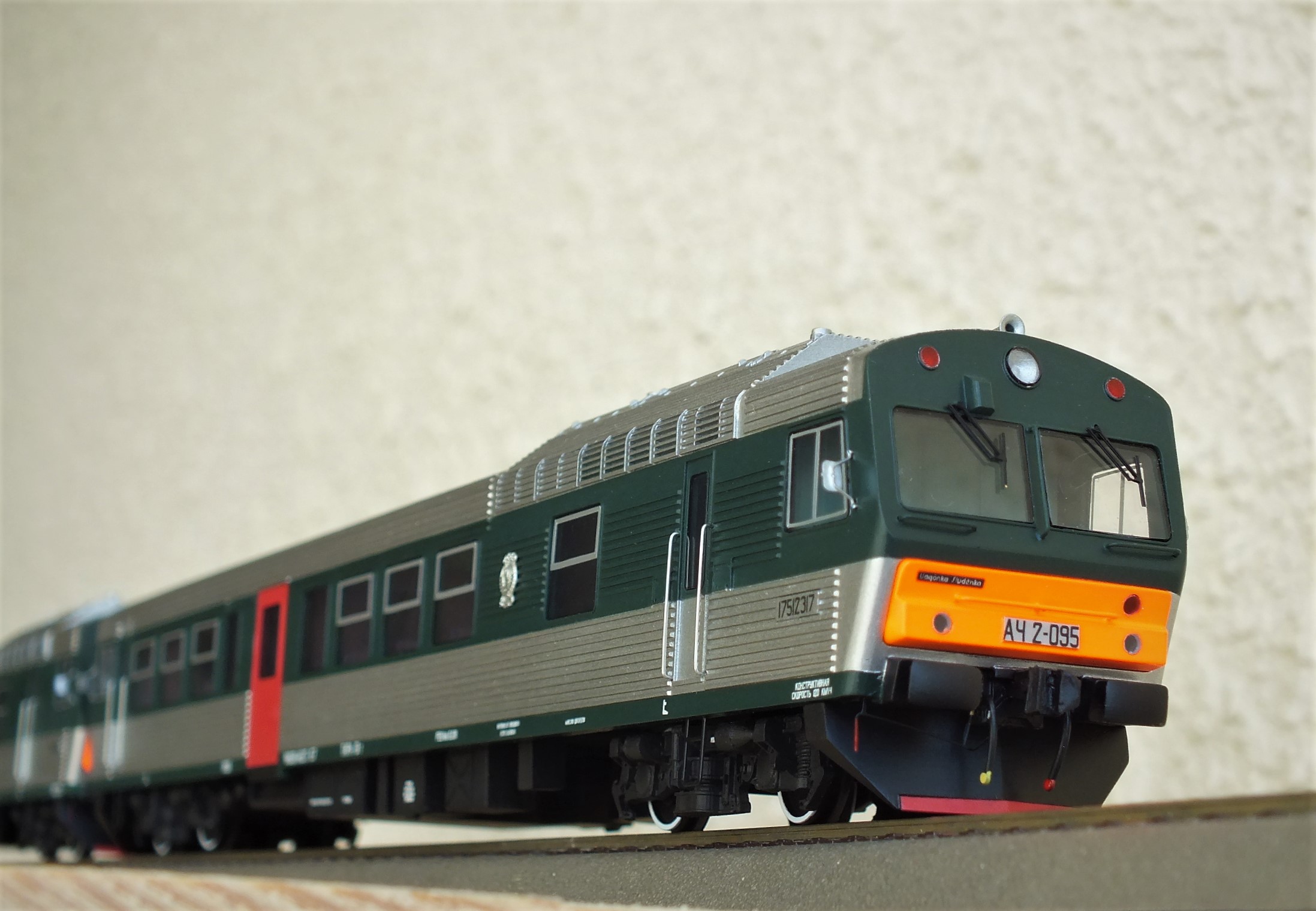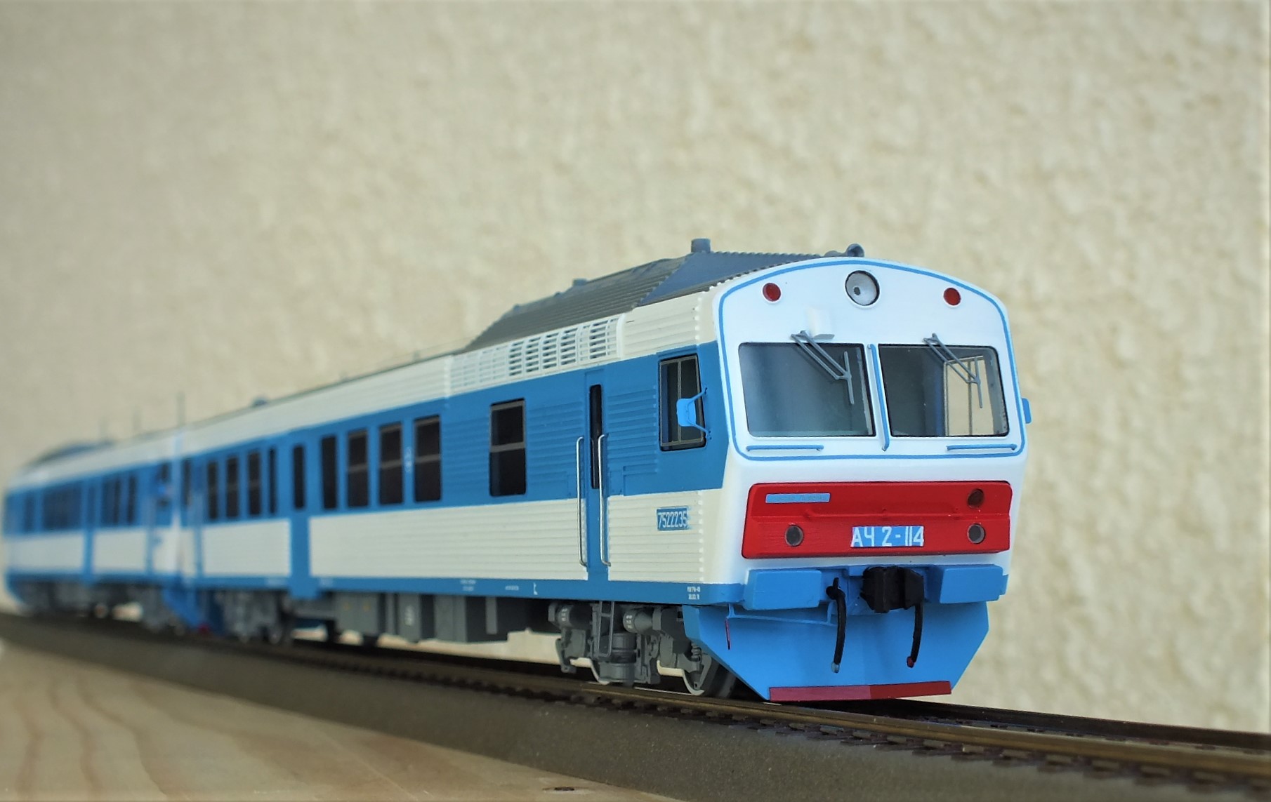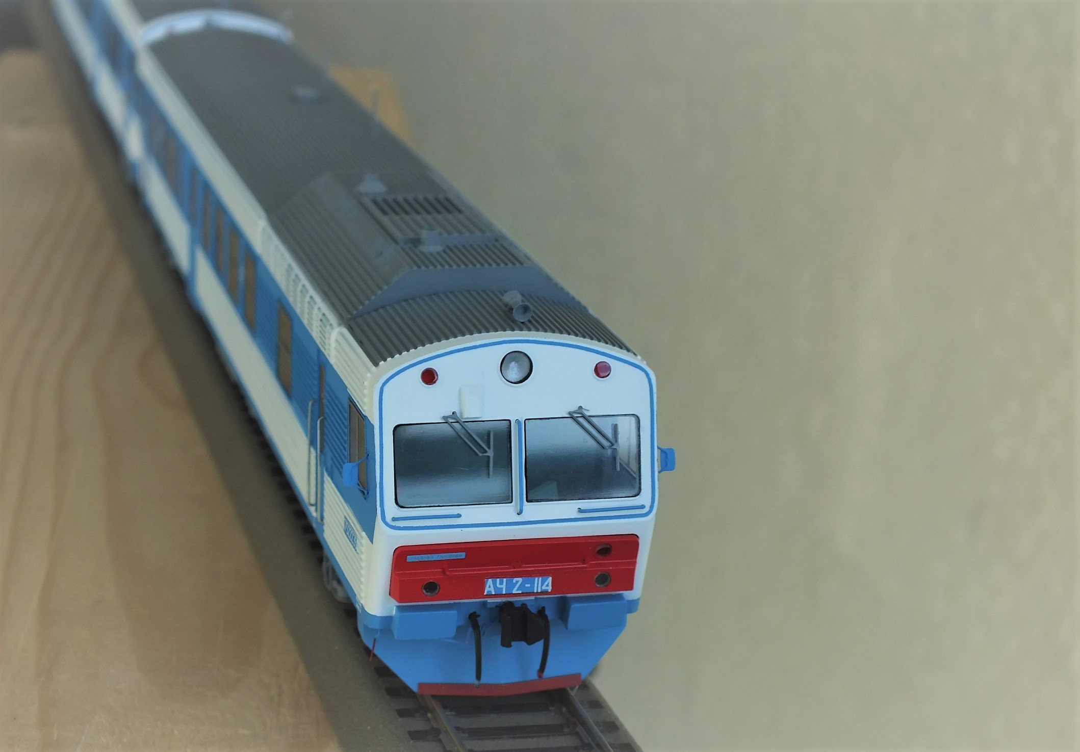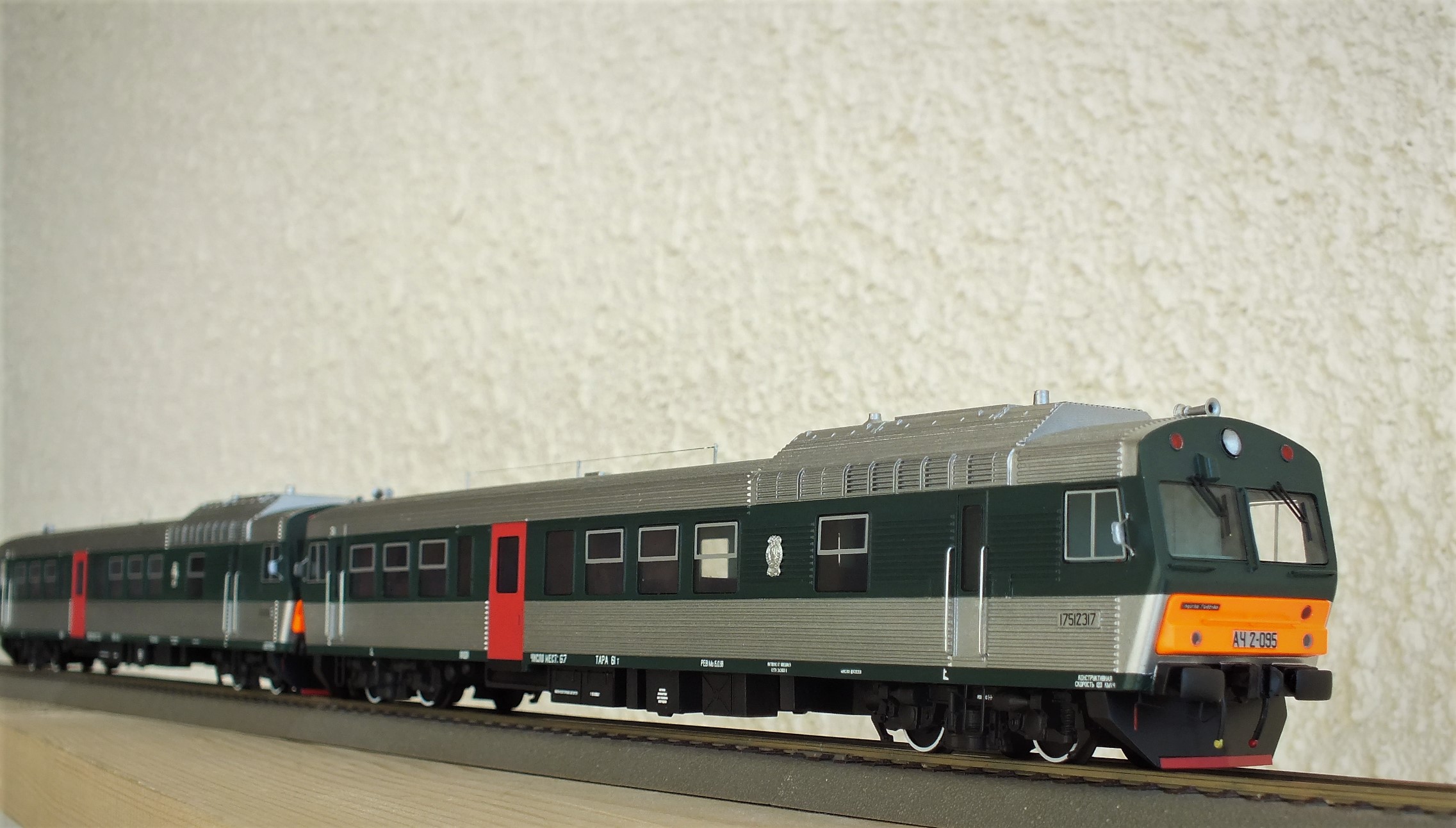 Дизельпоезд состоящий из автомотрисы АЧ2-092 (1989 года постройки), автомотрисы АЧ2-095 (1989 года постройки) и двух прицепных вагонов АПЧ2-084-2 и АПЧ2-084-4. Модель выполнена в заводской окраске периода СЖД. С серебряными "неокрашенными" кузовами из нержавейки.