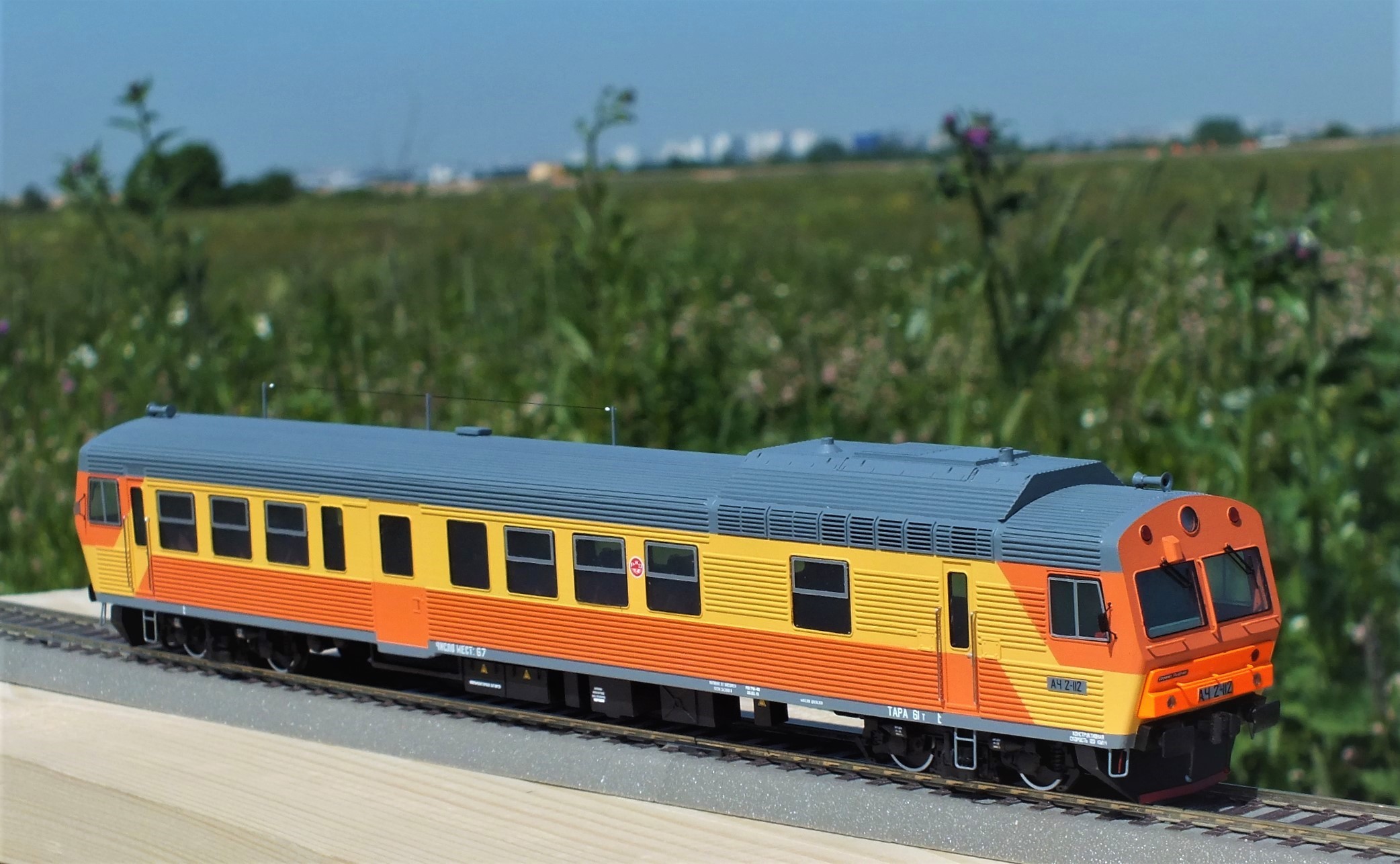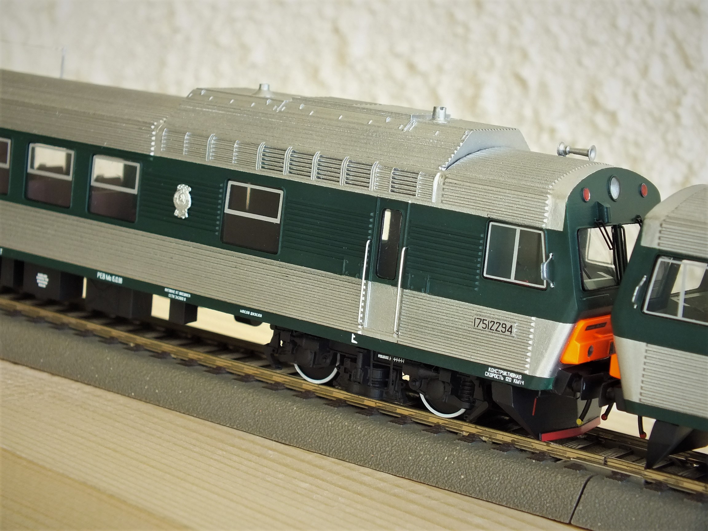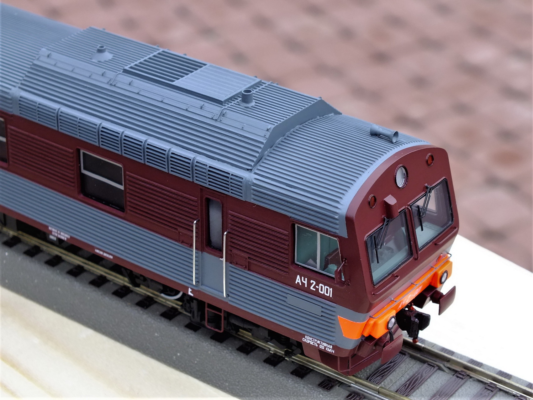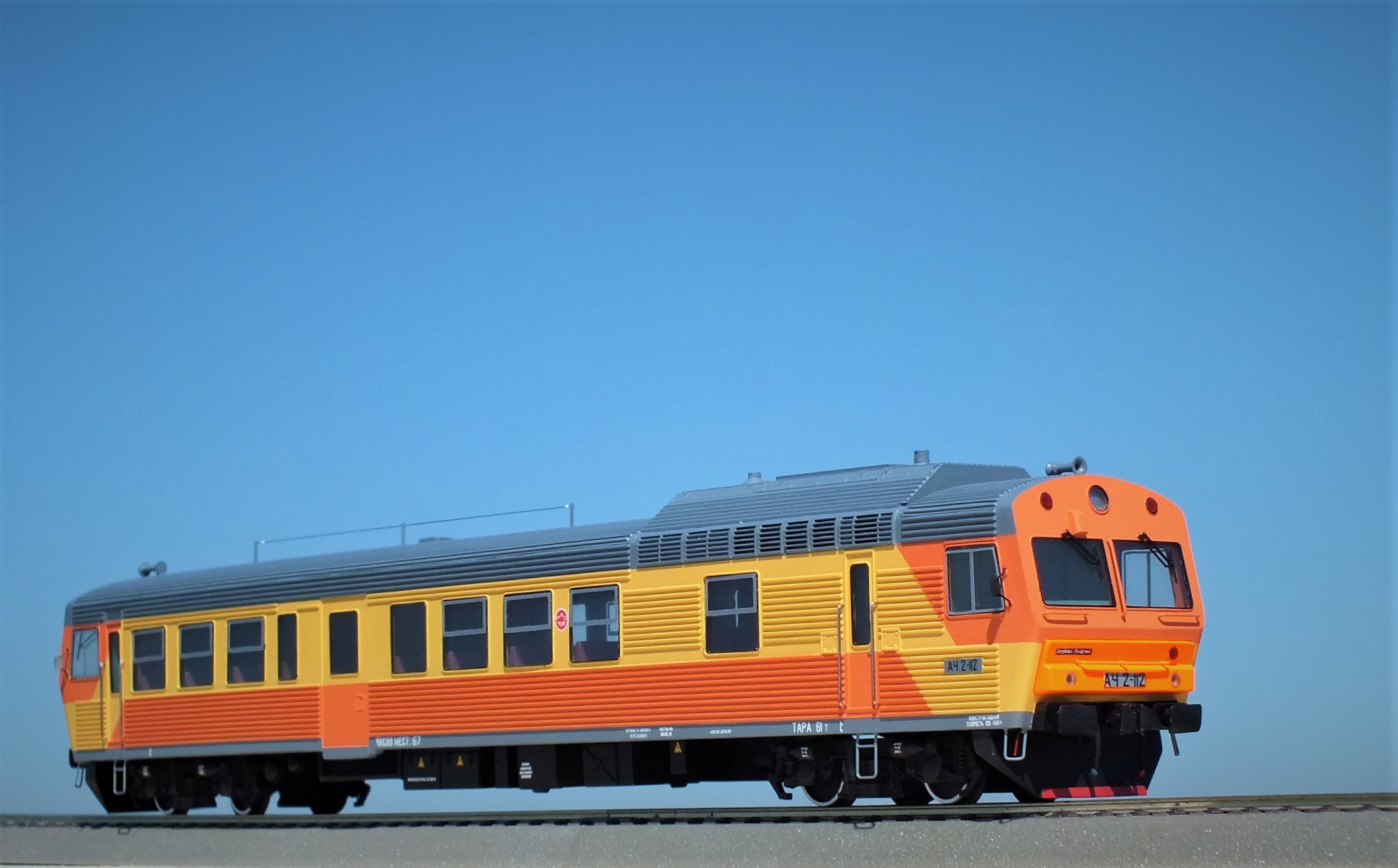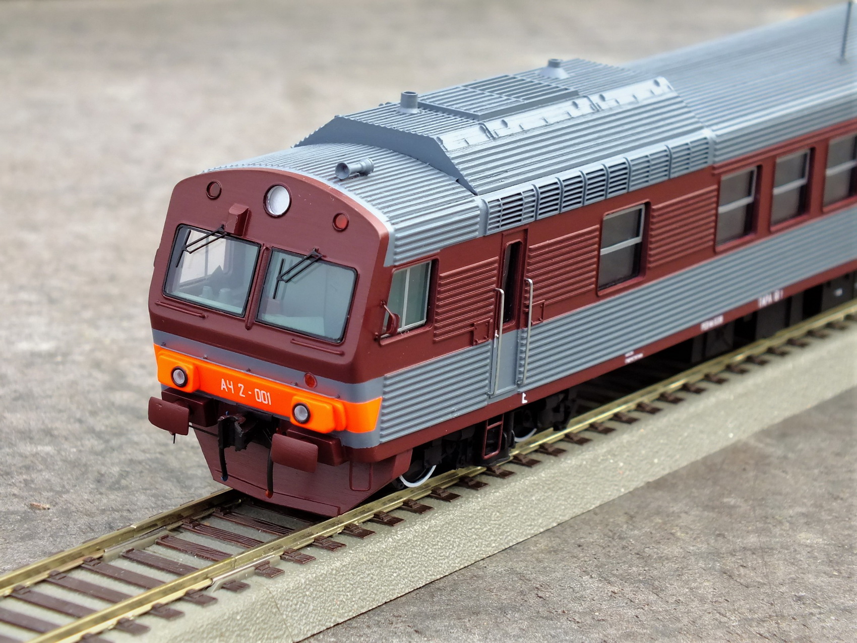 Дизельпоезд состоящий из автомотрисы АЧ2-092 (1989 года постройки), автомотрисы АЧ2-095 (1989 года постройки) и двух прицепных вагонов АПЧ2-084-2 и АПЧ2-084-4. Модель выполнена в заводской окраске периода СЖД. С серебряными "неокрашенными" кузовами из нержавейки.