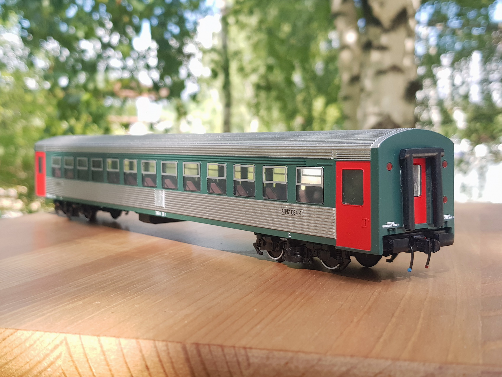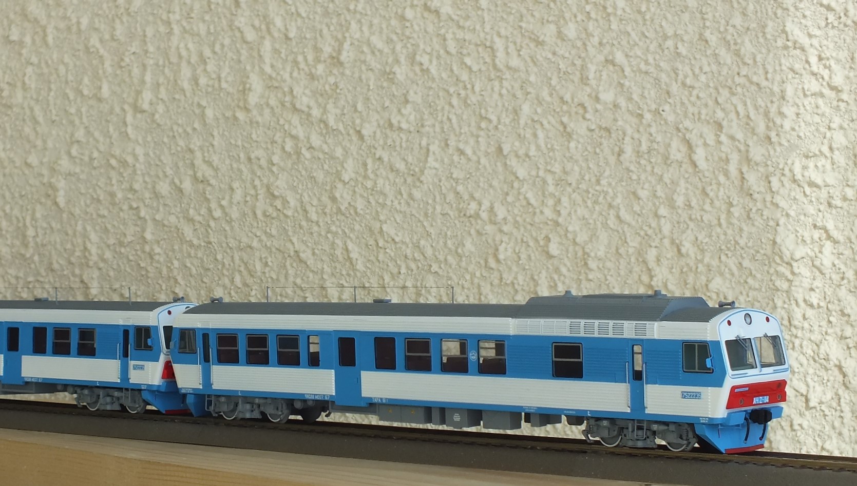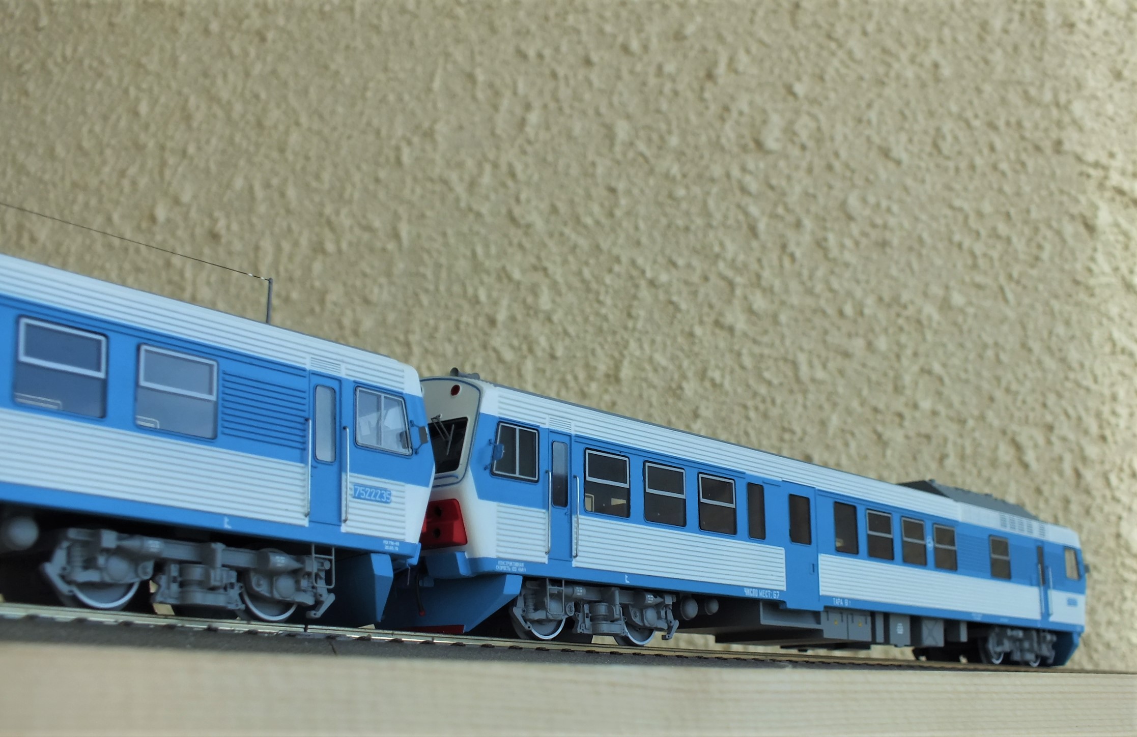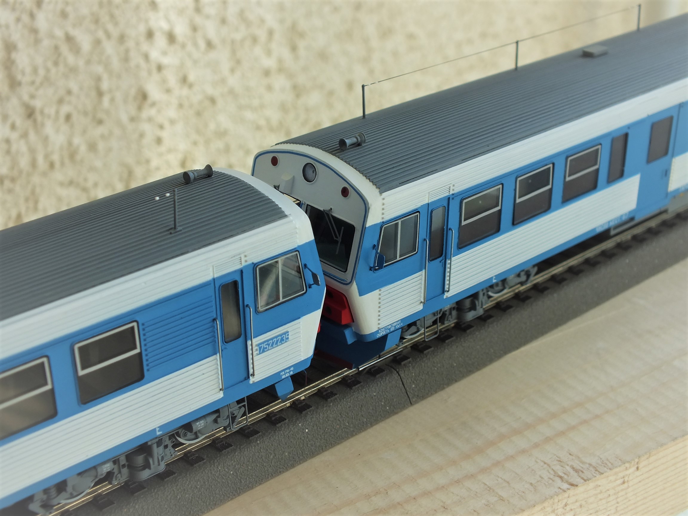 Дизельпоезд состоящий из автомотрисы АЧ2-092 (1989 года постройки), автомотрисы АЧ2-095 (1989 года постройки) и двух прицепных вагонов АПЧ2-084-2 и АПЧ2-084-4. Модель выполнена в заводской окраске периода СЖД. С серебряными "неокрашенными" кузовами из нержавейки.