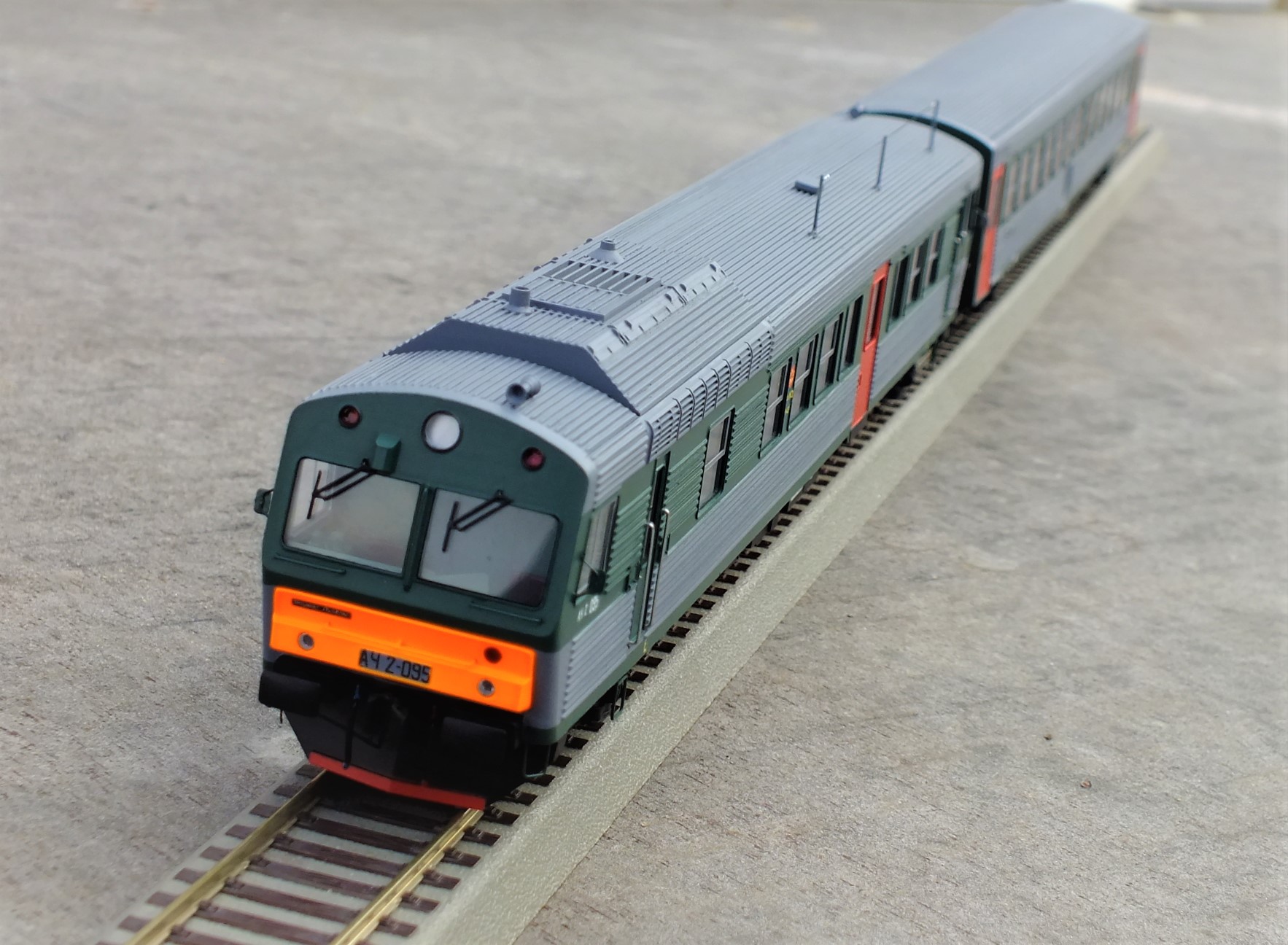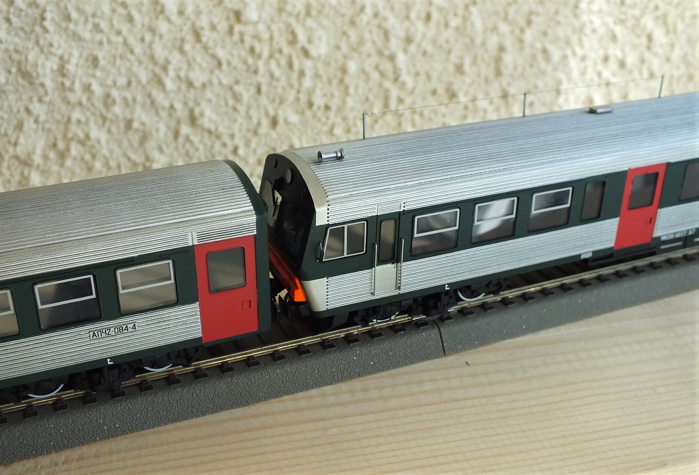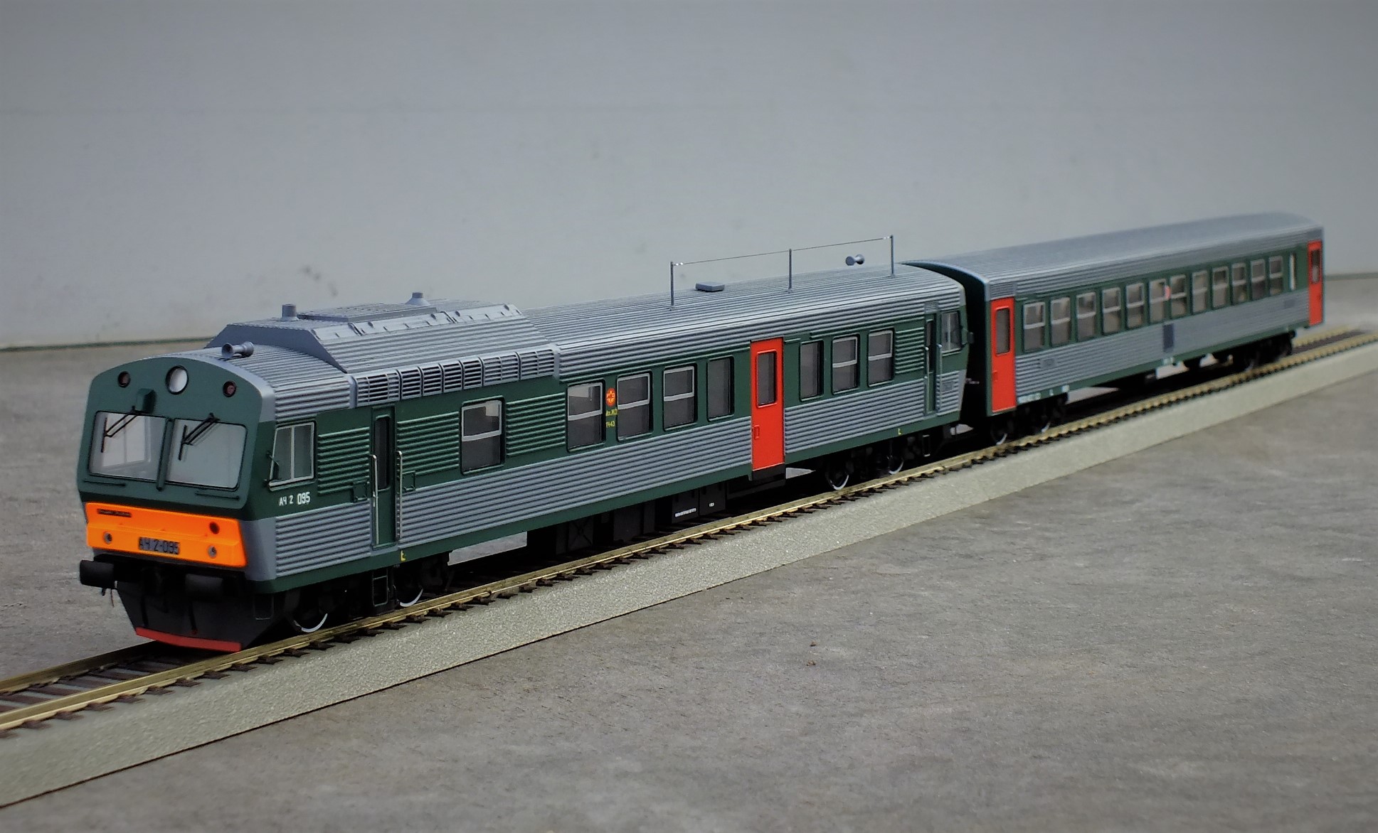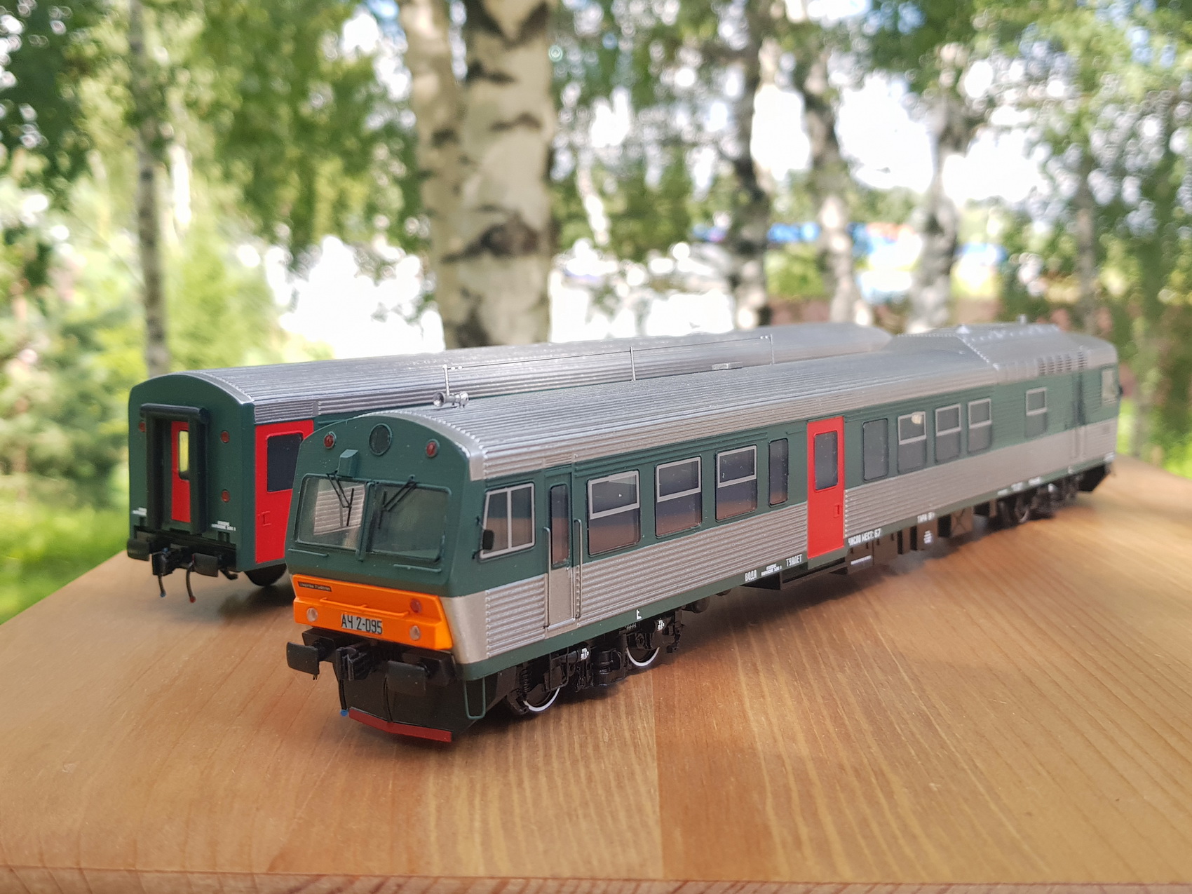 Дизельпоезд состоящий из автомотрисы АЧ2-095 (1989 года постройки) и прицепного вагона АПЧ2-084-4. Модель выполнена в заводской окраске периода СЖД. С серебряными "неокрашенными" кузовами из нержавейки.