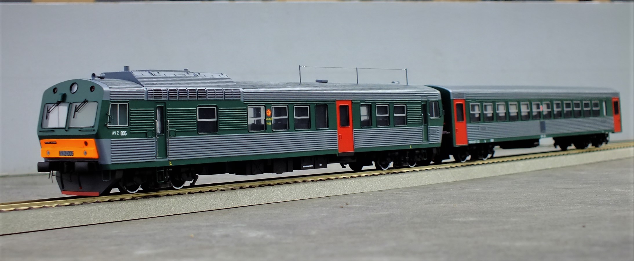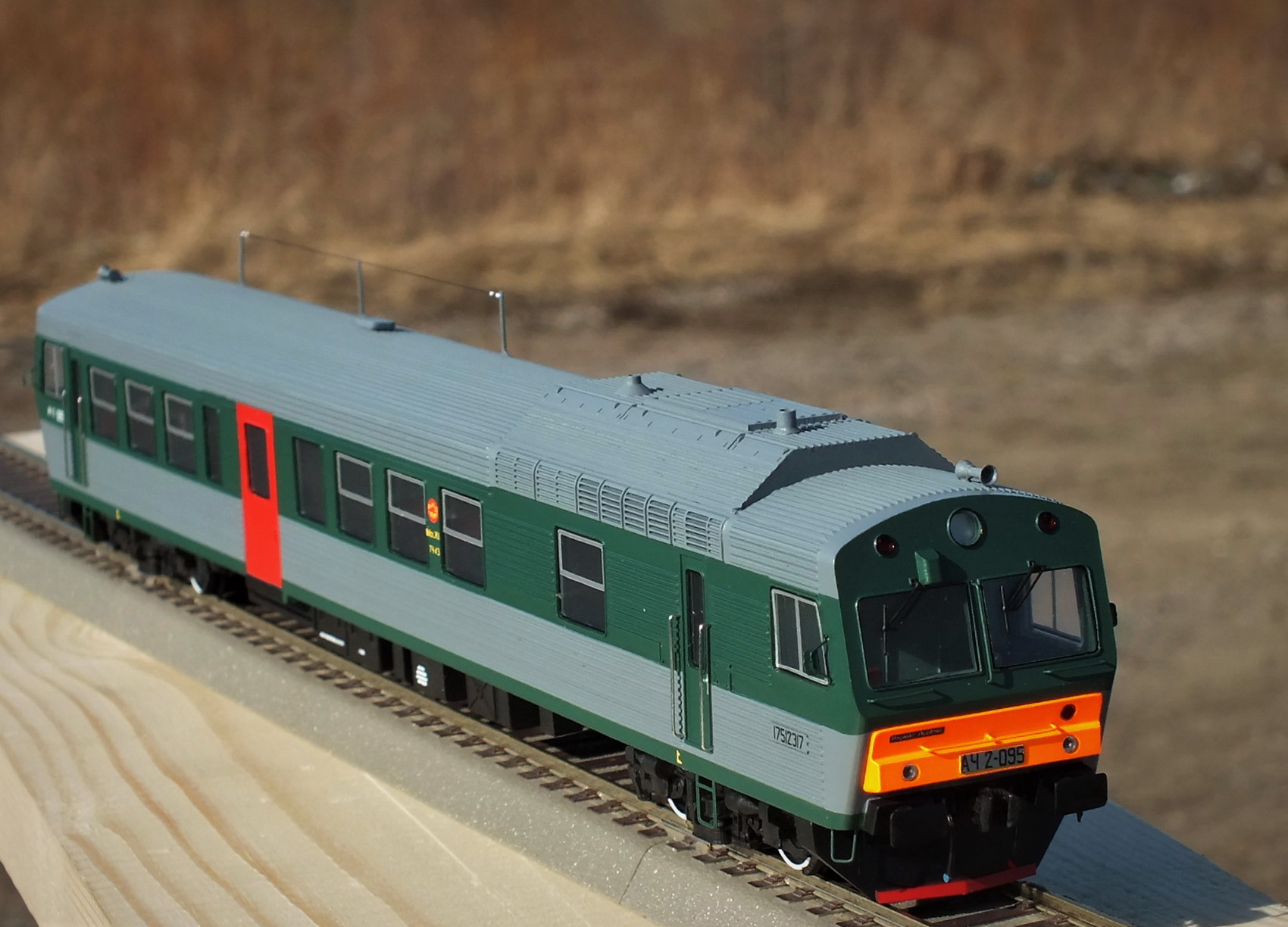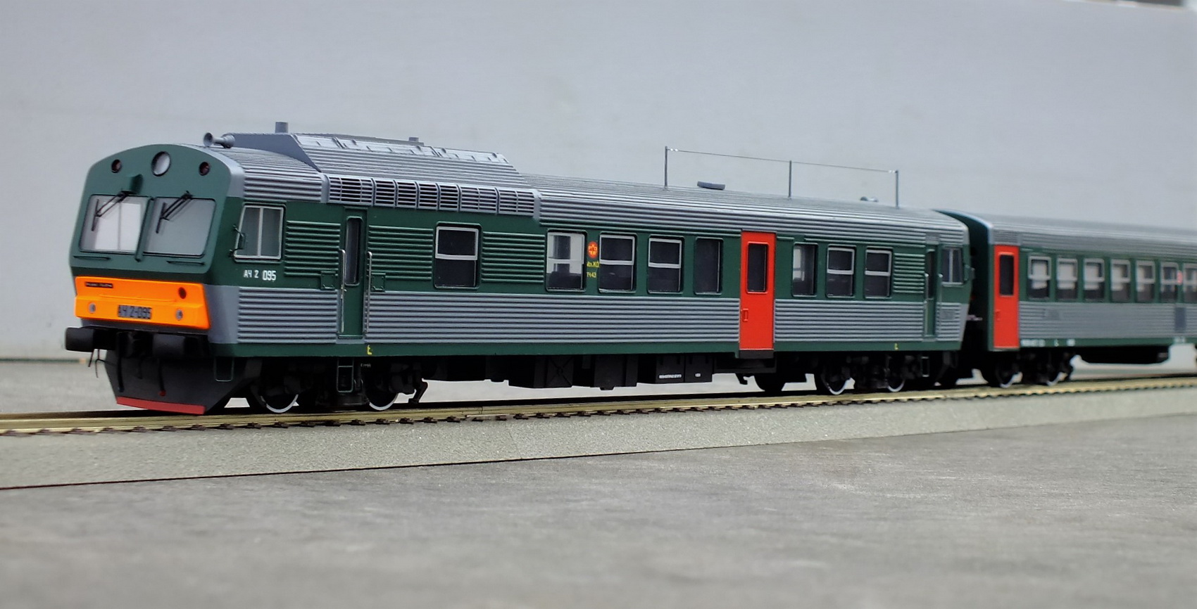 Дизельпоезд состоящий из автомотрисы АЧ2-095 (1989 года постройки) и прицепного вагона АПЧ2-084-4. Модель выполнена в заводской окраске периода СЖД. С серебряными "неокрашенными" кузовами из нержавейки.