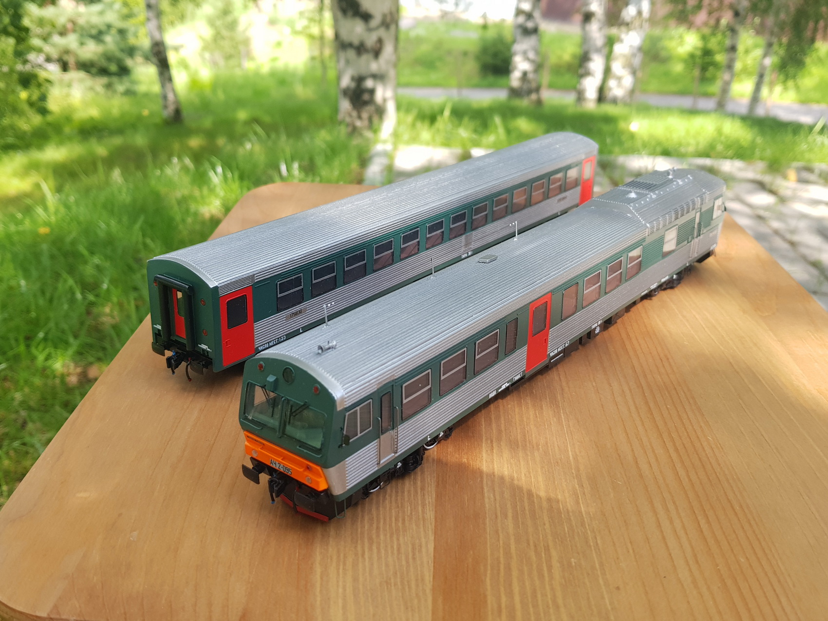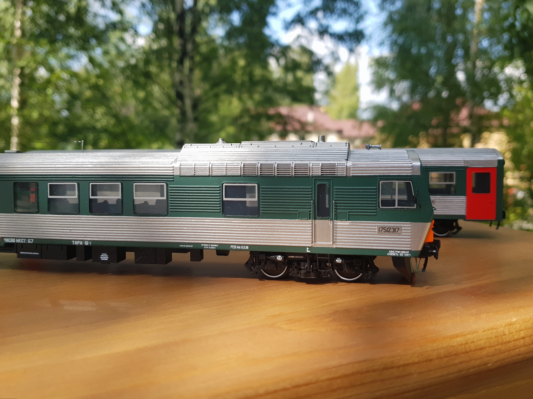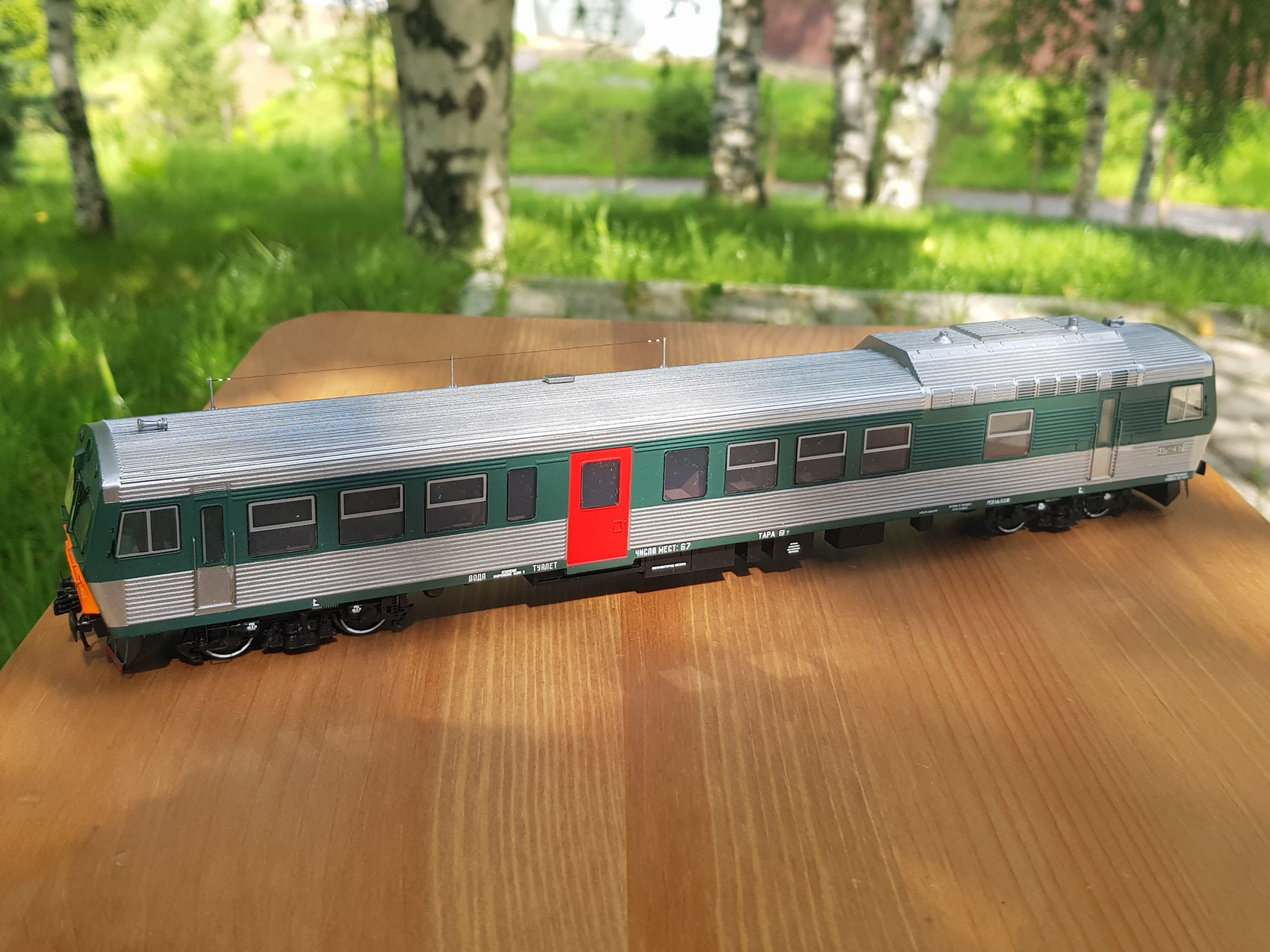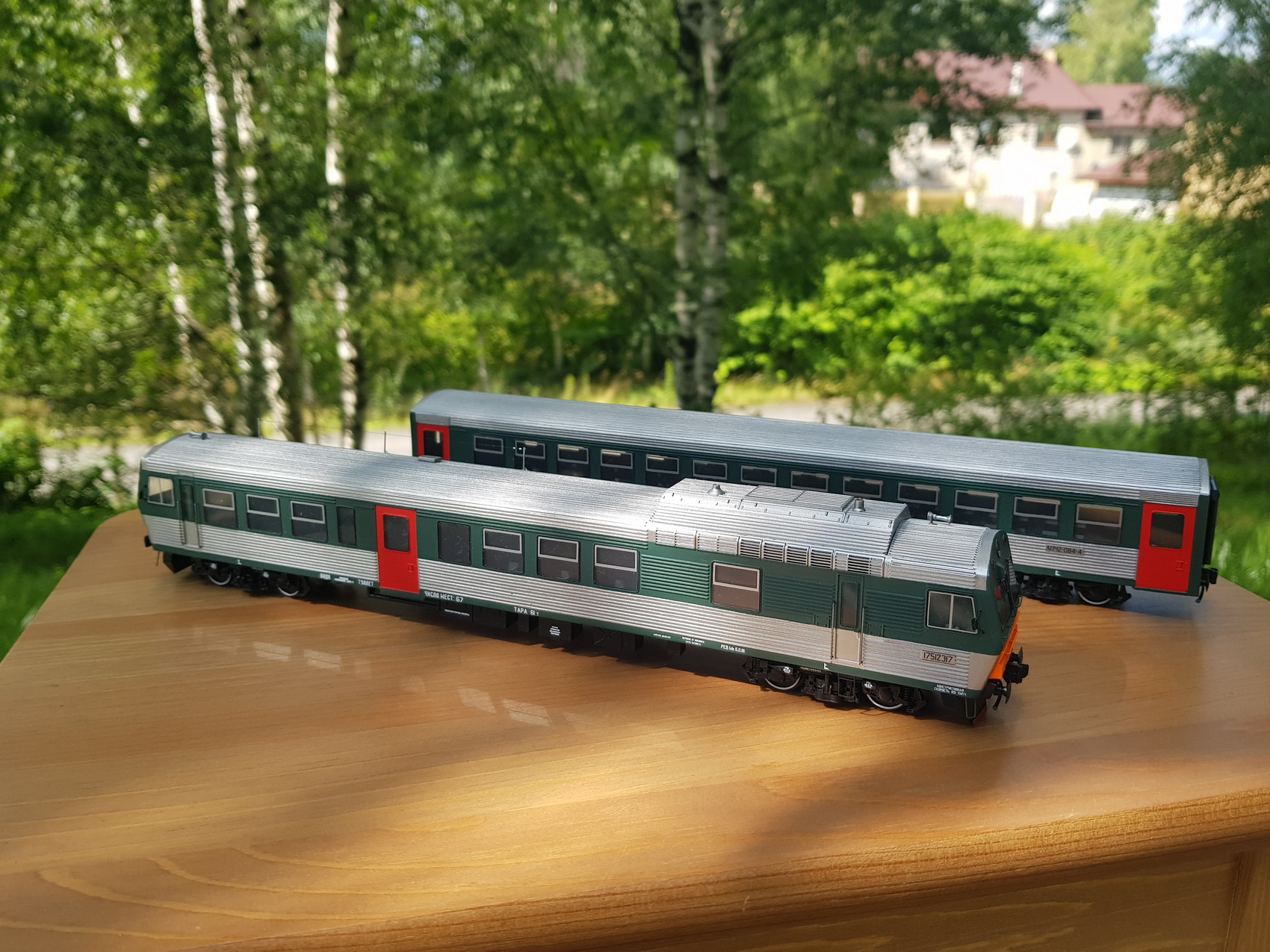 Дизельпоезд состоящий из автомотрисы АЧ2-095 (1989 года постройки) и прицепного вагона АПЧ2-084-4. Модель выполнена в заводской окраске периода СЖД. С серебряными "неокрашенными" кузовами из нержавейки.