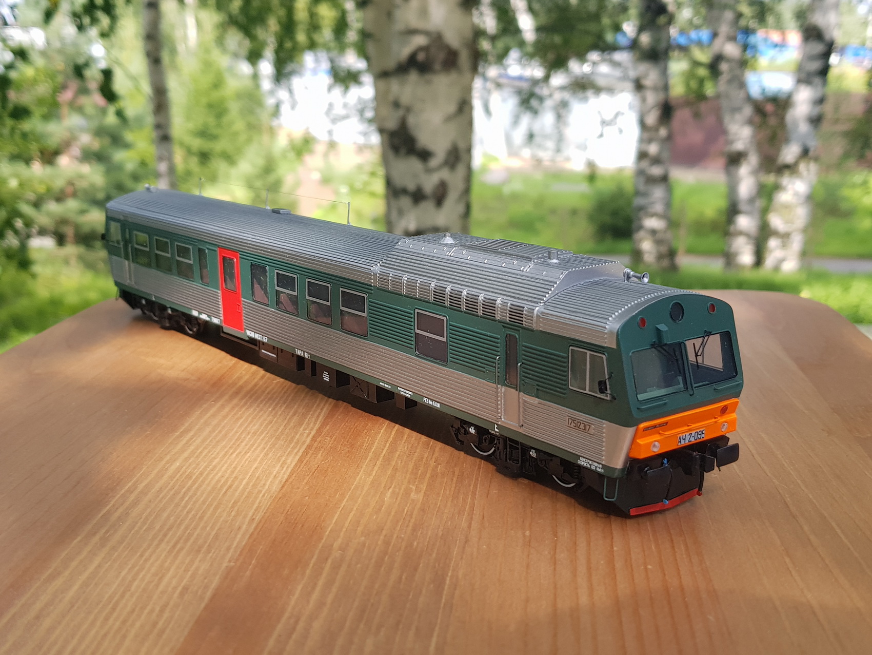 Автомотриса АЧ2-095 1989 года постройки приписана ТЧ-43 Смоленск-1 Московской железной дороги. Модель выполнена в заводской окраске периода СЖД. С серебряными "неокрашенными" кузовами из нержавейки.