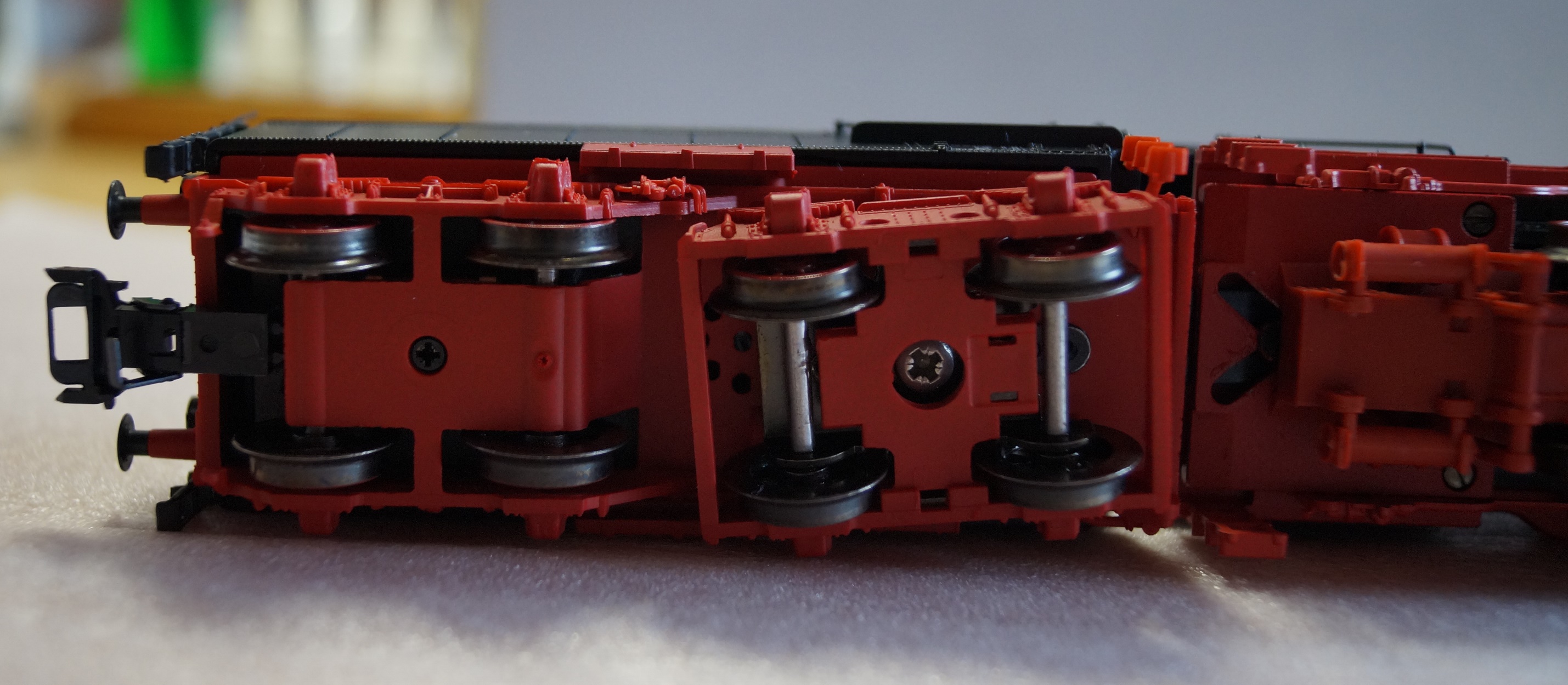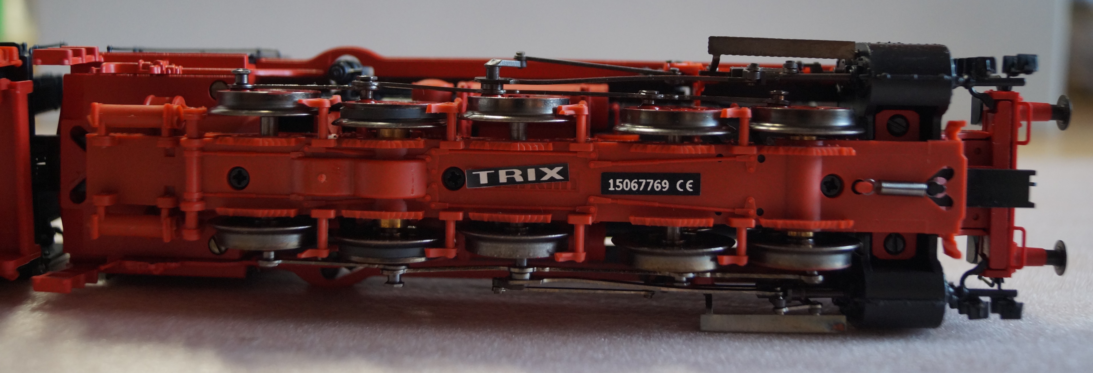 Модель этого саксонского красавца до этого видел только у мелкосерийщиков и у Брава, но у последней была версия с 3-х осным тендером в 1-й эпохе. Но в 2015 году TRIX анонсировала данную модель и я тоже стал обладателем одного экземпляра в ливрее DB 3-й эпохи. Модель детализирована очень неплохо. Я бы даже сказал - замечательно. В лучших традициях TRIX - сделан прототипичный тендер - как и у прототипа первая тележка тендера подвижная, а вторая является частью рамы. Обвес мелкими деталями самого паровоза выполнен тоже очень хорошо - особенно ярко выражена передняя часть локомотива. Много накладных деталей выполнены из металла, что тоже очень хорошо - внушает доверие. Однако немного слабовато реализована деталировка будки машиниста - как по мне - нехорошо для открытой к обзору части паровоза. У современного Лилипута и то уже намного лучше в данном аспекте. Теперь о ходовых качествах. Модель имеет полностью нового типа привод. Оснащена швейцарским мотором фирмы MAXXON с маховиком. Привод на 4-ю ось, а дальше дышлами тяговое усилие передается на все колеса паровоза. Ход очень плавный и мягкий и практически бесшумный. Модель оборудована с завода звуковым мультипротокольным декодером и звук таки реально практически соответствует оригиналу. Из световых "примочек" - лишь свет в будке машиниста. Опять же слабовато - могли бы сделать и мерцание в топке. Токосъем выполнен обычным для TRIX методом - один рельс со всех осей паровоза, а второй со всех осей тендера. Для уверенного токосъема тендер нужно немножко подгрузить - он слишком легкий, но место внутри с легкостью позволяет это сделать. В целом модель оставляет очень приятное впечатление. Она увесистая и обещает быть весьма надежной в эксплуатации благодаря хорошему мотору и полностью металлическому редуктору.