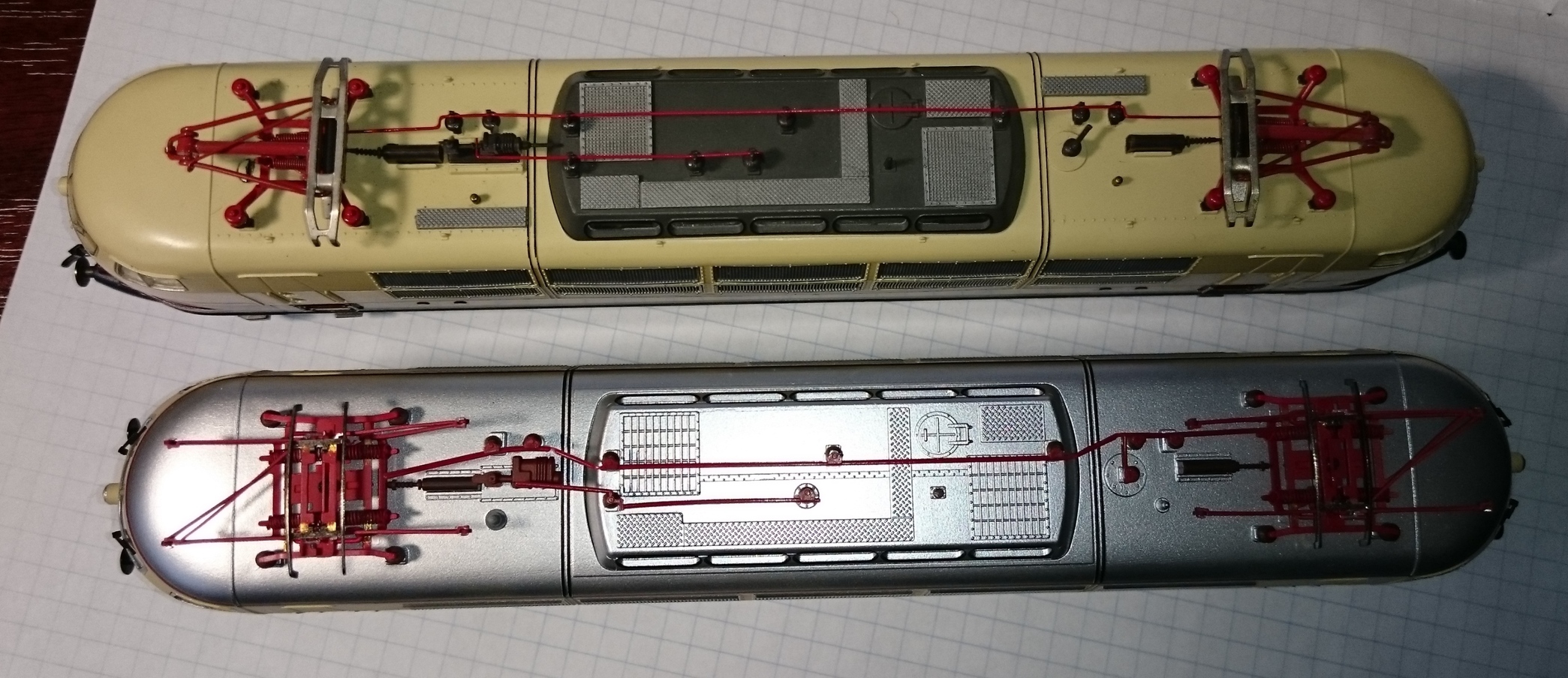 Вашему вниманию представляю модель последнего прототипа Е03 004 (в дальнейшем 103 004-8). Модель выполнена фирмой Риваросси. Отличная деталировка и качество исполнения. От завода на модель установлен один парадный метельник (второй в накладных деталях). Модель оборудована 5-ти полюсным двигателем и 8-ми пиновым разъёмом под декодер, а также съёмными НЕМ-шахтами, что тоже очень удобно. Привод на 4 оси из 6. Уверенный токосъём и весьма приличный вес. Этот прототип весьма сильно отличается от серийных в первую очередь пантографами и однорядными решетками охлаждения на бортах.