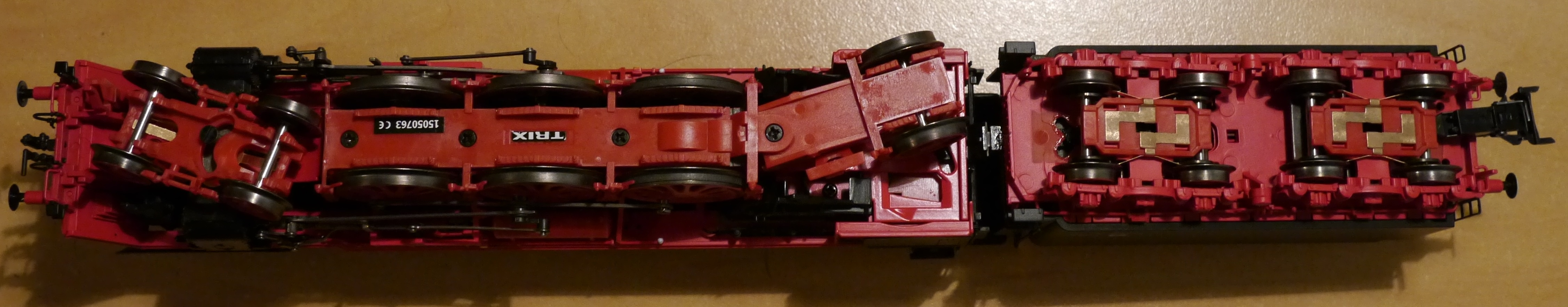 Мне очень понравилось, что большинство деталей выполнено из металла, а привод находится в самом паровозе. При этом поручни, генератор и прочие мелкие элементы выполнены накладными деталями, а не отлиты вместе с корпусом (то, за что иногда ругают TRIX / "Марклин"). Ходовая часть: Бегунки подпружинены и имеют свободный ход в обе стороны и вверх/вниз. Среднее ведущие колесо также может свободно "выбегать" на несколько миллиметров влево-вправо. Как и думалось, модель отлично себя ведет в малых радиусах, а также на стрелках и S-образных кривых. Не было обнаружено ни затрудненного движения, ни шума. К сожалению, сегодня не могу снять видео - SD-карта старого образца не дружит с фотоаппаратом