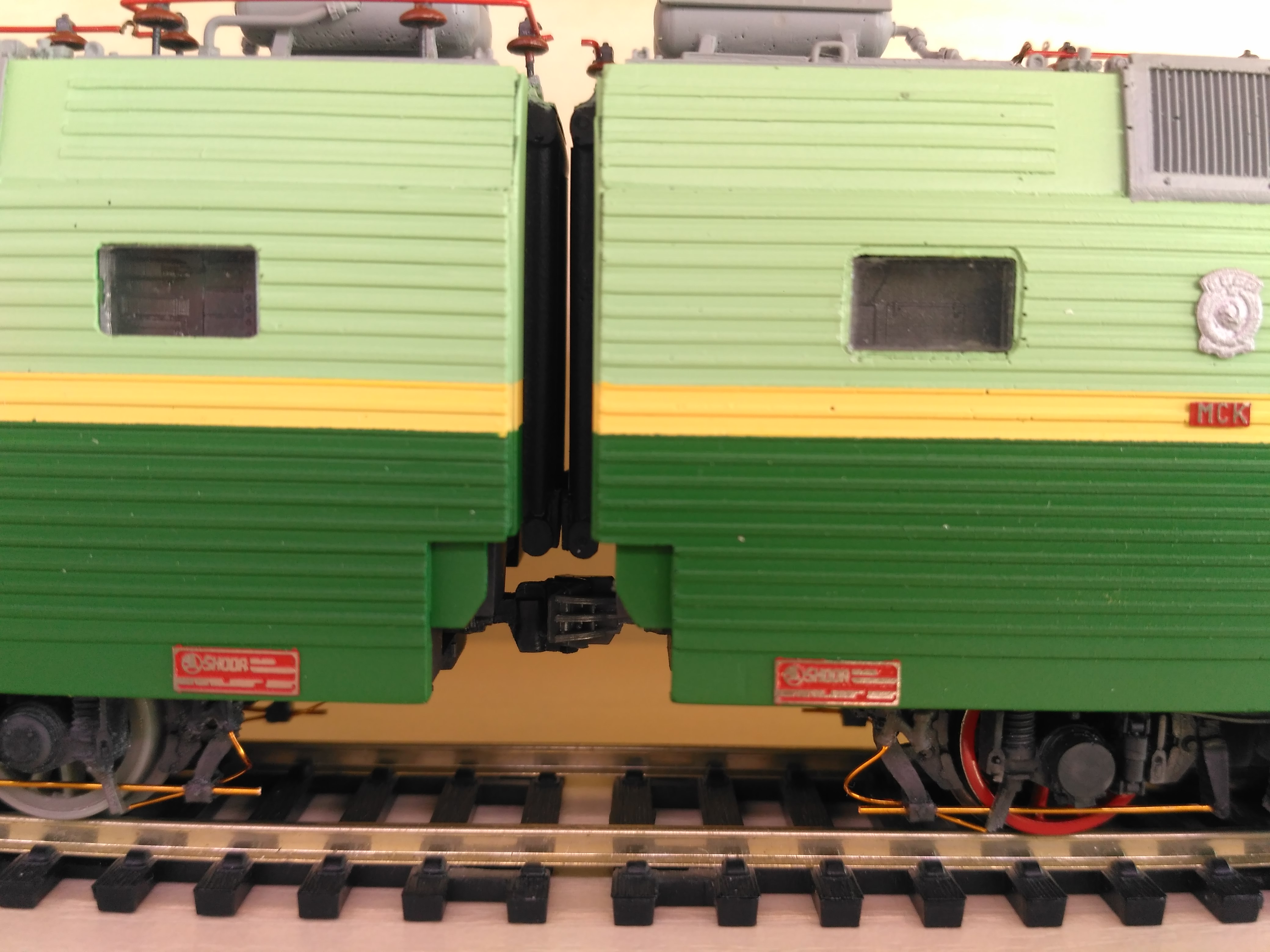Тут вопрос эстетики: "палка" между секциями смотрится несомненно хуже, чем СА3 на примере. Но обеспечивает надежное сцепление и прохождение малых радиусов. Автосцепки для НЕМ-шахты у меня нет, чтобы посмотреть, как будет выглядеть (и как будет ездить). Все остальные сцепки (и "селедка" от "Роко", и "профи" от "Фляйшмана") не дают близкого сцепления, между суфле секций около 2 мм зазора. Есть подозрение, что имитатор СА3 даст ту же картину.