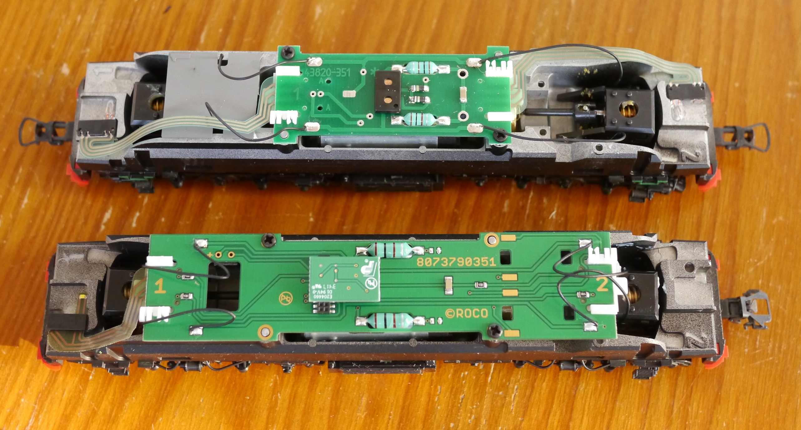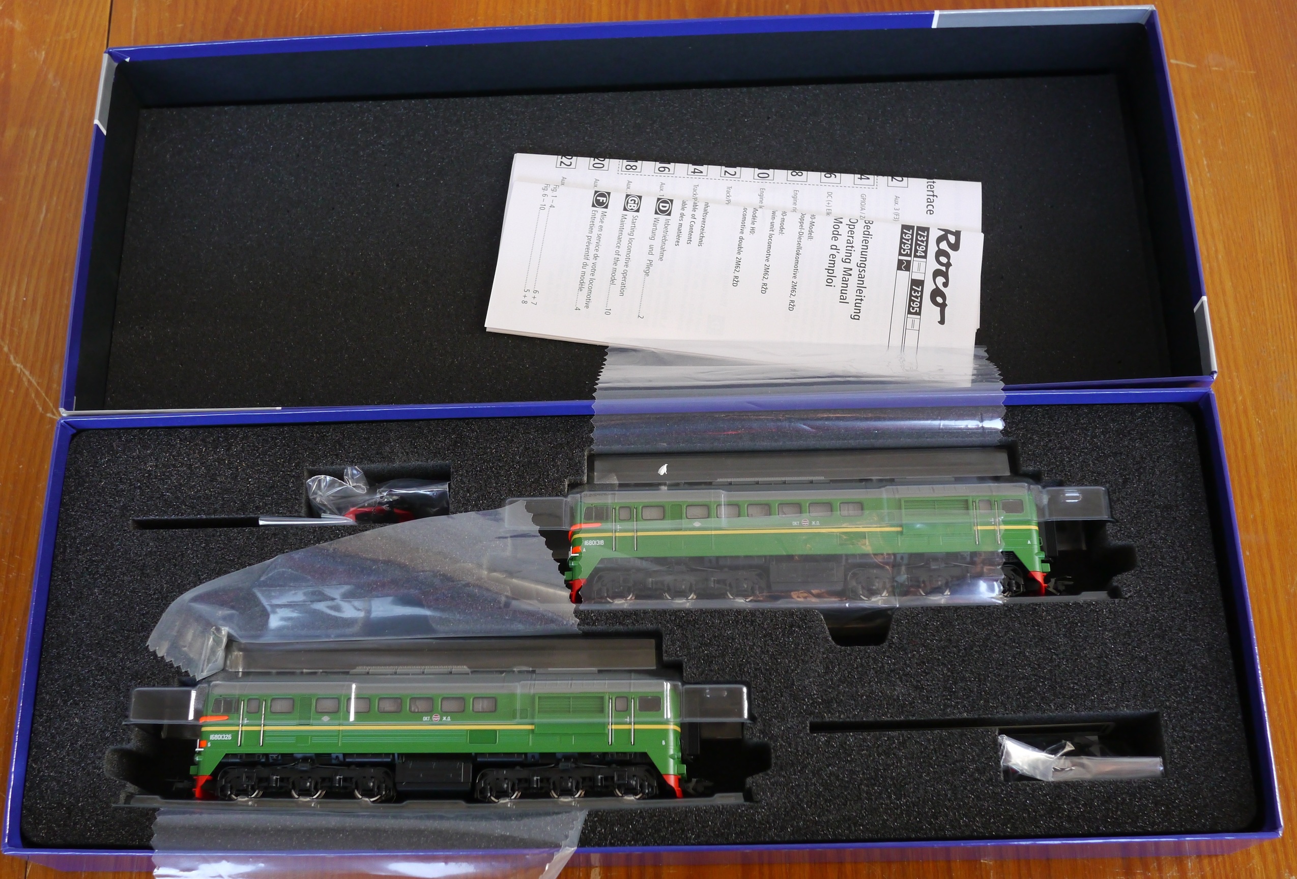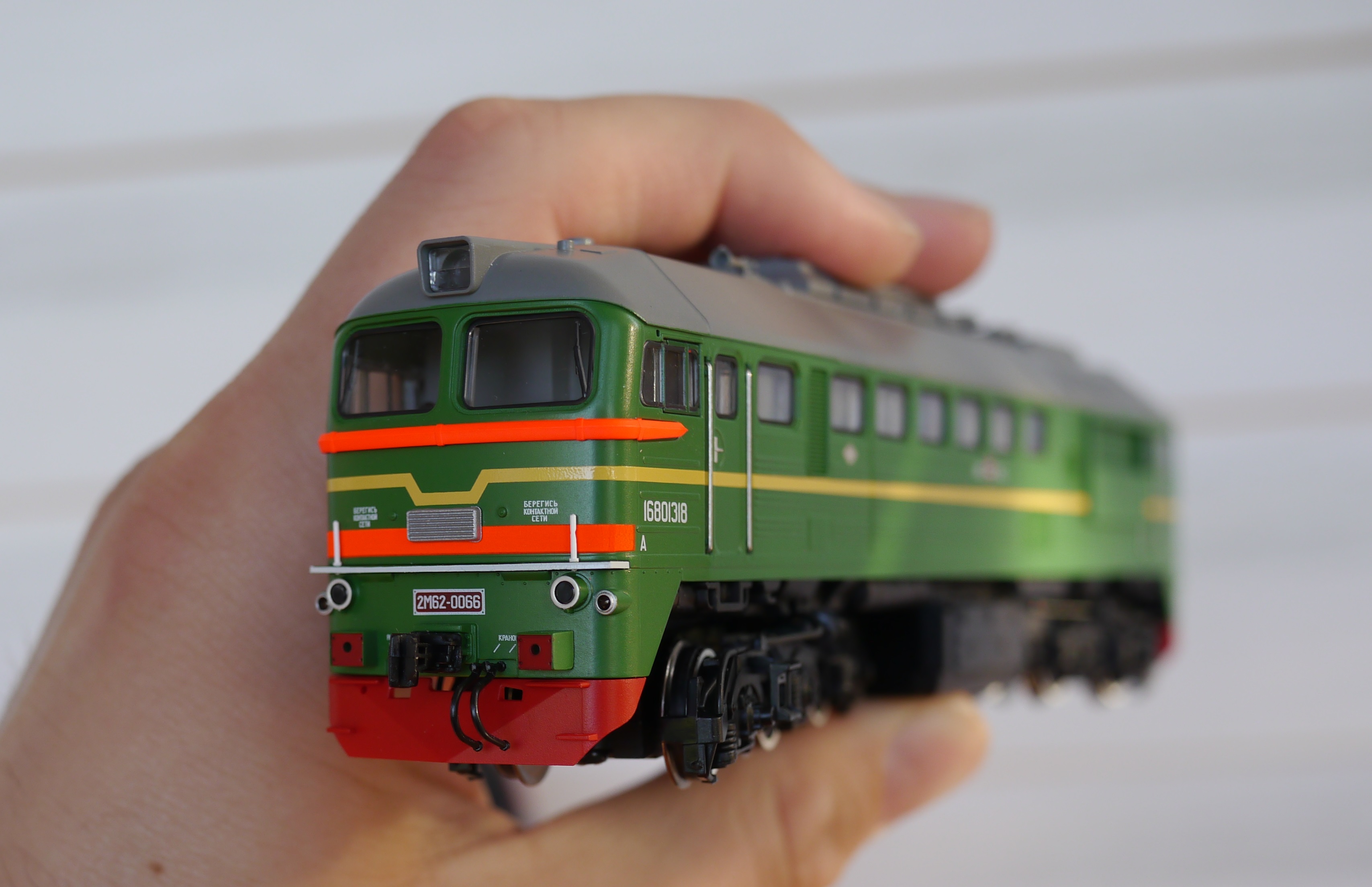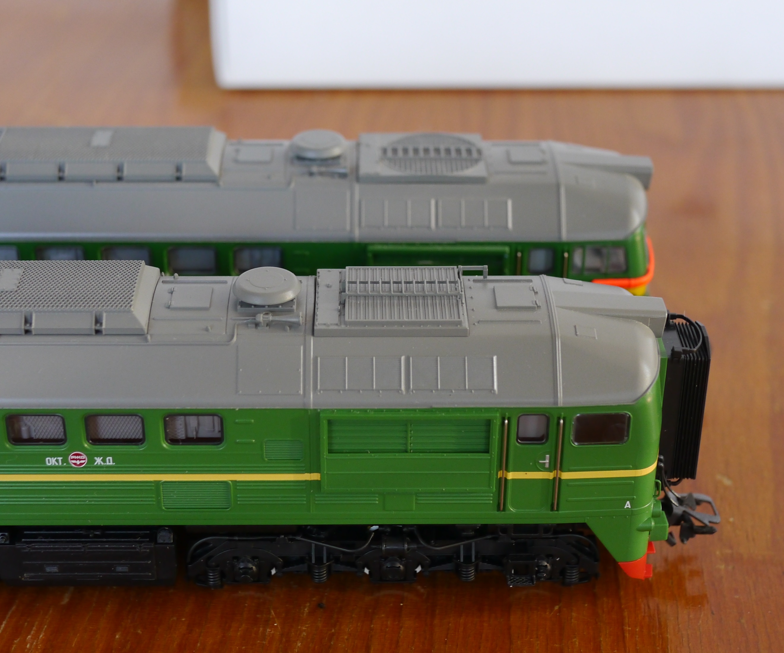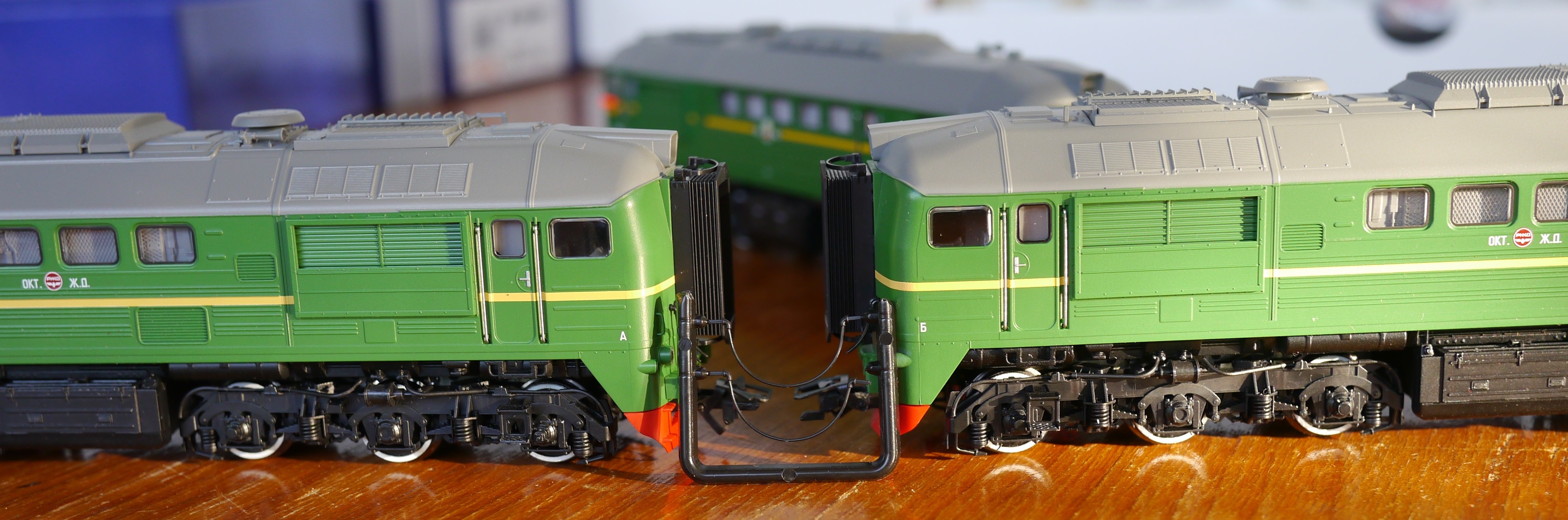 К сожалению, фотографий 0066 номера в сети не нашлось. Но есть немало картинок других 2М62 ранних выпусков. Многие из них были списаны сравнительно недавно, в 2000-х, отдельные продолжают службу и сегодня. Итак, открываем коробку с моделью. Видим ложемент под две секции, выемки под накладные детали. «Роко» на сей раз постаралась отобразить на модели именно советские особенности тепловозов. Первое на что обратил внимание – это тормозные цилиндры. Наконец-то на телеге цилиндр один, по центру, как положено. На «Фляйшмане» - два, по краям (еще и отображены половинками). Переработали холодильник: жалюзи, как и положено «двойной машке», двурядные, а не тройные. Вентилятор на крыше также сделан в соответствии прототипу. Трап над вентилятором отлит отдельной деталью. Возле буферных фонарей установлены поручни для составителя поездов (торчащие вертикально белые «палочки»). Обе секции тепловоза – моторные. Ходовая часть в целом осталась такой же (рама, редукторы, двигатель). А вот над электрической составляющей поработали. Изменилась печатная плата. Ламповое освещение заменили на диодное. Разъем декодера с 8-пин поменяли на 16-пин в одной секции, и 21-пин во второй (?). Честно признаюсь: в оцифровке моделей понимаю чуть менее, чем ничего. Потому пускай знающие товарищи подскажут, хорошо это или плохо.