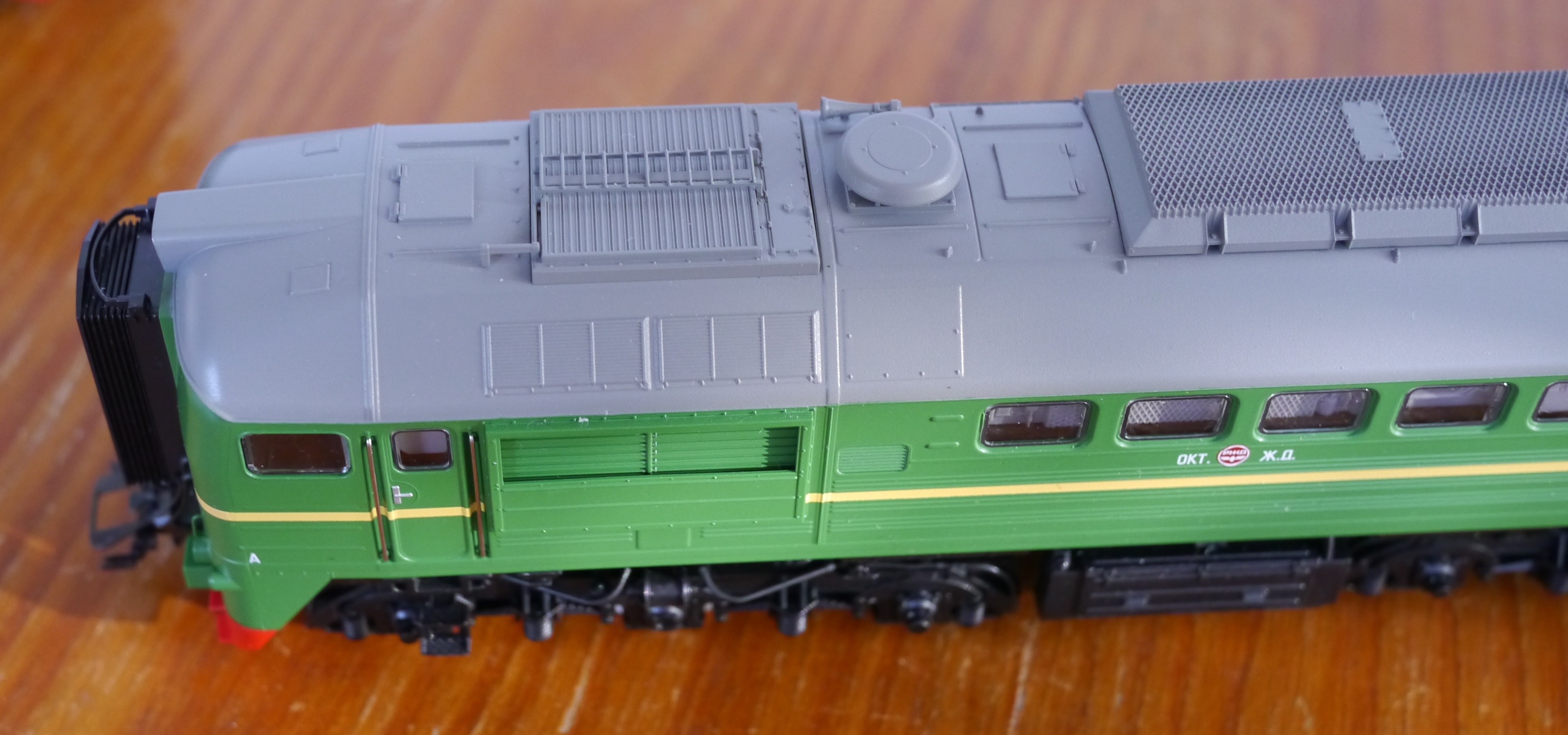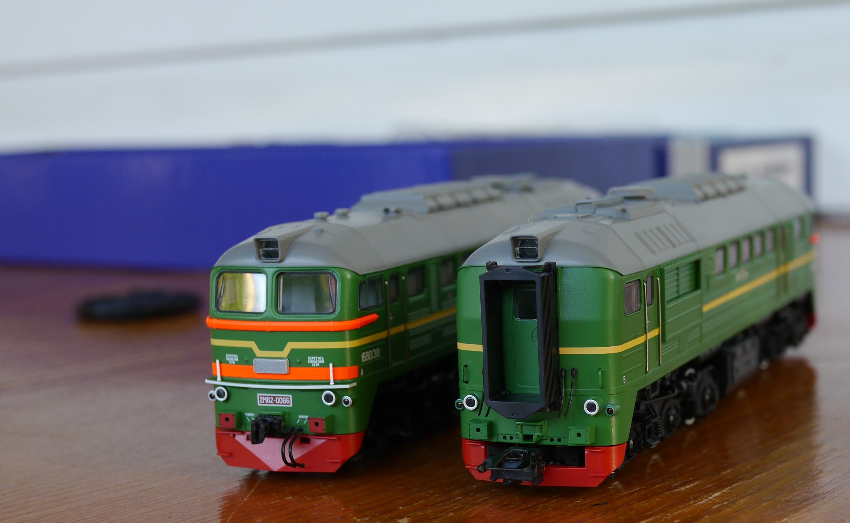 Как бы там ни было – тепловоз пошел в серию, машина узнаваема и любима многими фанатами СЖД, а «Роко» по этому поводу запилила модель. Она отображает тепловоз ранних выпусков (в процессе 2М62 дорабатывали и вносили некоторые внешние изменения). Дабы не перегружать текст, отмечу основное отличие: на первых 70-ти тепловозах не были убраны двери в заглушенную заднюю кабину. Мое мнение, что «роковцы» выбрали ранний прототип из-за меньшего количества переделок исходника – одиночной М62. Если упразднить двери в хвосте, то надо убирать и их подножки. Однако этот элемент отлит на металлической раме, т.е. надо вносить изменения и в литье рам, а не только кузова.