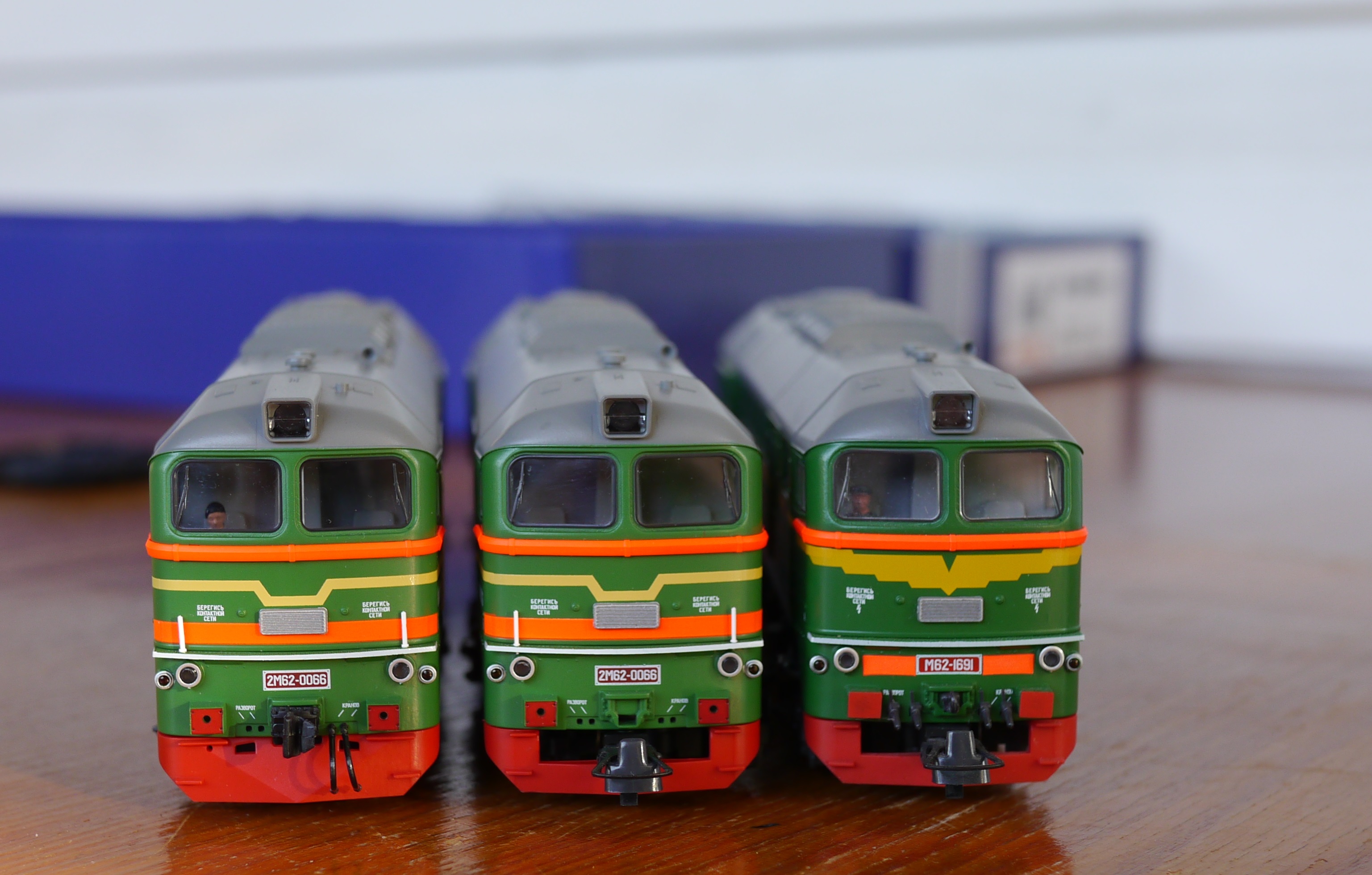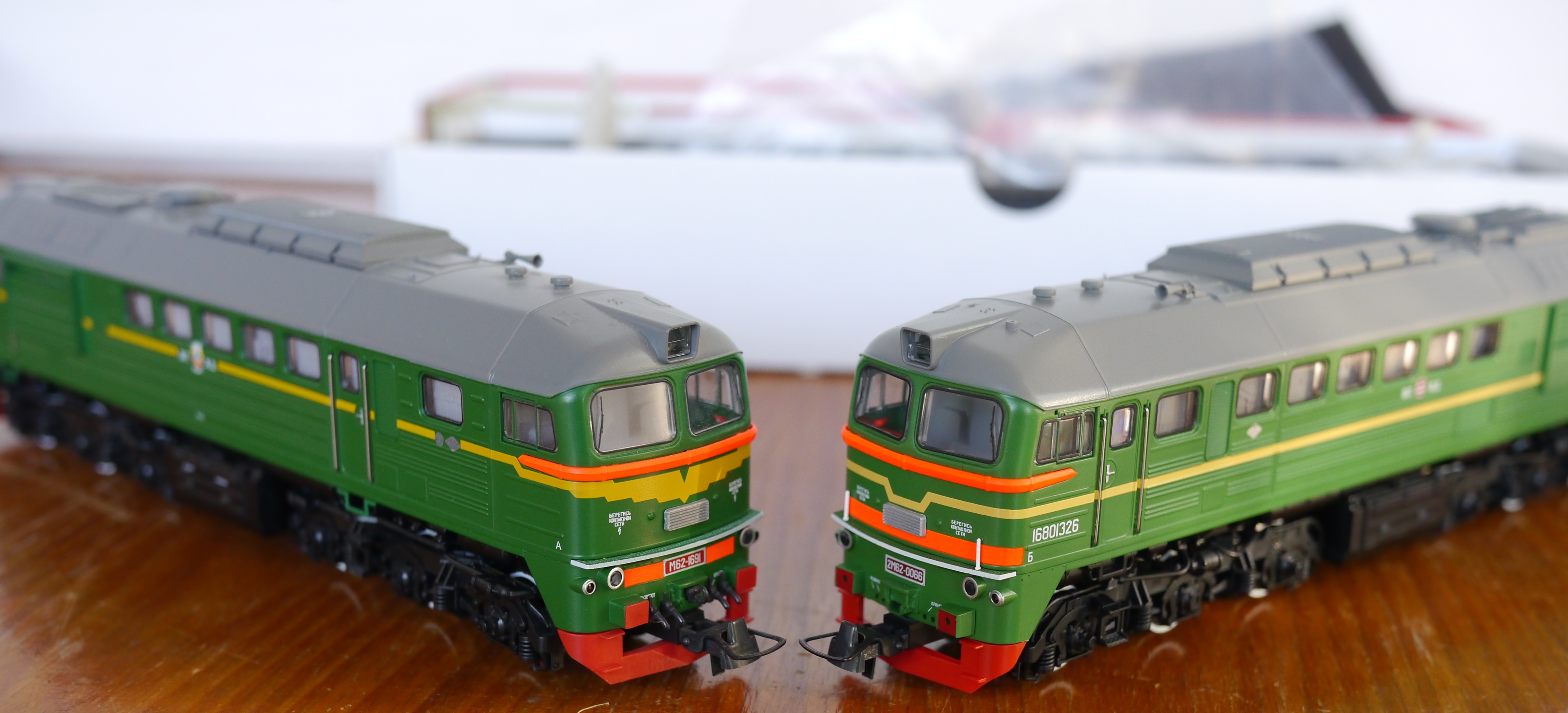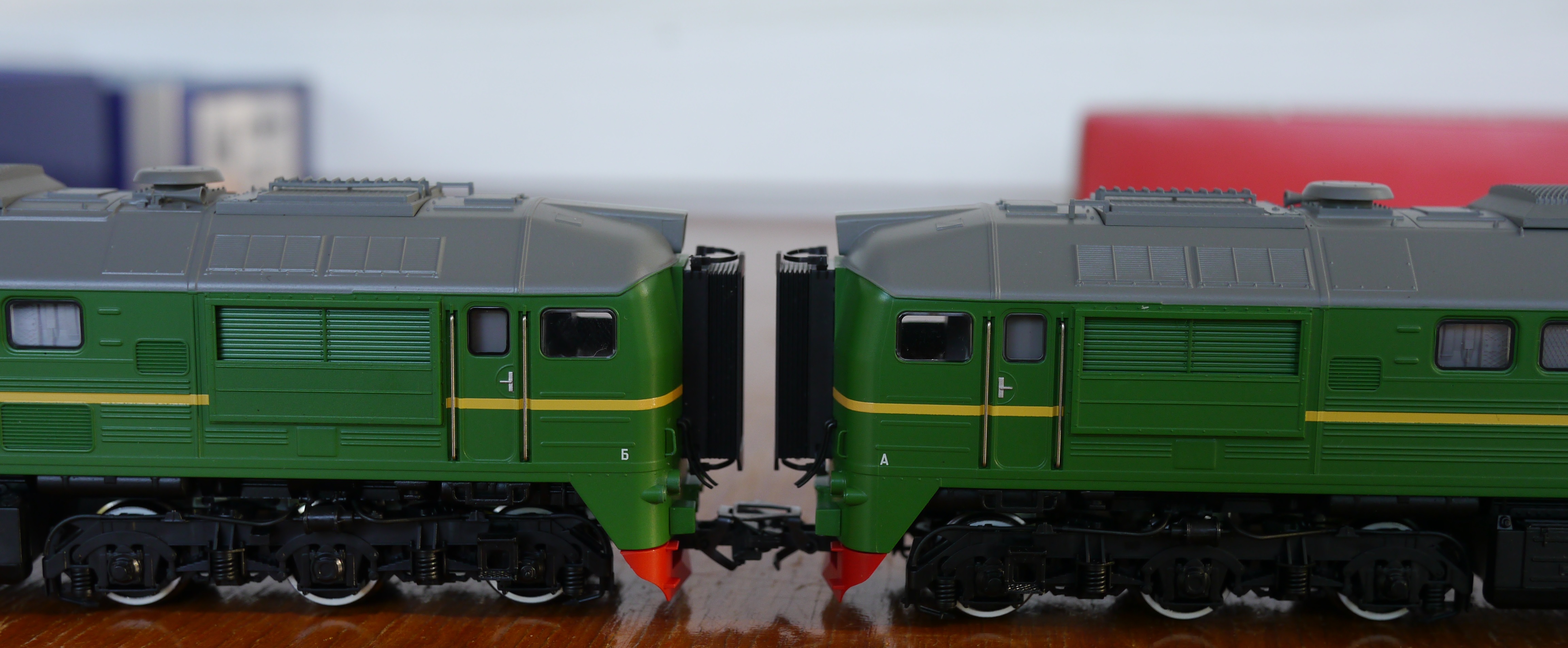 Наконец дождался новинку – двухсекционную версию тепловоза М62, известную в народе как «двойная Машка» или 2М62. Нельзя сказать, что данная модель сделана «с нуля»: одиночные М62 производитель уже лет 10-12 выпускает. Однако первые модели в советской ливрее были перекрашенной немецкой версией тепловоза. Производитель оставлял тормозную систему европейского образца, буфера, винтовую упряжь и т.п. Несмотря на это, многие любители «нашей» темы радовались покупке. Отличия не сильно влияли на узнаваемость тепловоза, и при желании модель можно доработать без значительных трудозатрат. Теперь посмотрим, насколько хорошо австрийцы справились в этот раз. Для сравнения взял односекционный М62 от «Фляйшмана» (тот же «Роко», просто перепакован в коробку «Фляйша). Было бы интереснее сравнить с еще более ранним вариантом модели, но увы - в коллекции есть только эта одиночная «Машка».