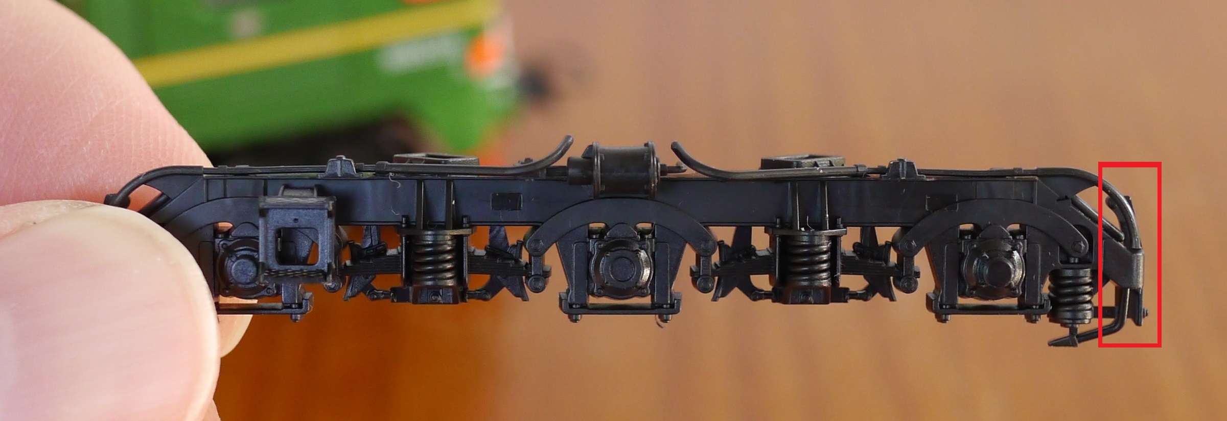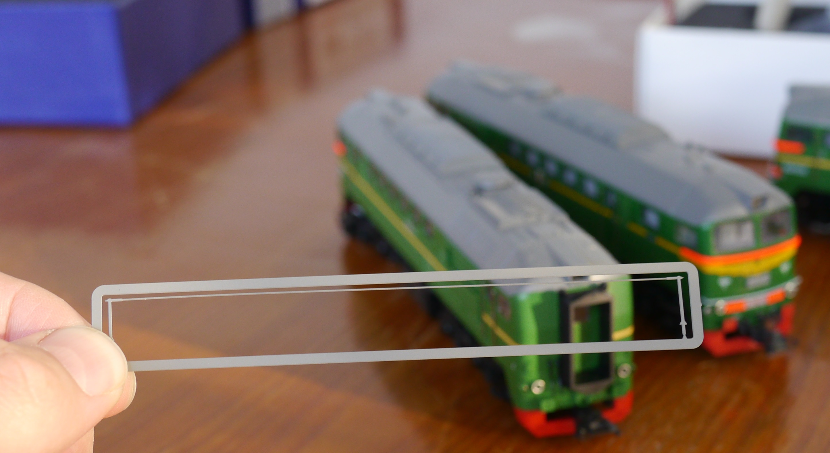 К сожалению, в ходовом варианте расстояние между секциями великовато, даже с короткими сцепками вроде «селедки» от «Роко» или петли от «Марклина» (на фото как раз «марклиновские»). В комплекте есть два варианта жестких сцепок (длинная и короткая), но мне такими пользоваться неудобно. Тепловоз доставать с полки и ставить на макет явно удобнее по одной «машке», а не обе скопом. Накладные шланги тормозной магистрали сделали заново. Раньше в комплект к тепловозу шли типичные европейские. Для 2М62 сделали новые, другой формы. Рассматривая фотки модели в интернете (до покупки), так и не понял, из чего сделана антенна на крыше локомотива. Оказалось – «травленка». И, думаю, это хорошее решение для тех, кто берет модель в руки. Явно лучше тонкого пластика. Также добавили накладные зеркала заднего вида (на моей модели пока не установлены). Есть и накладные таблички, травленка.