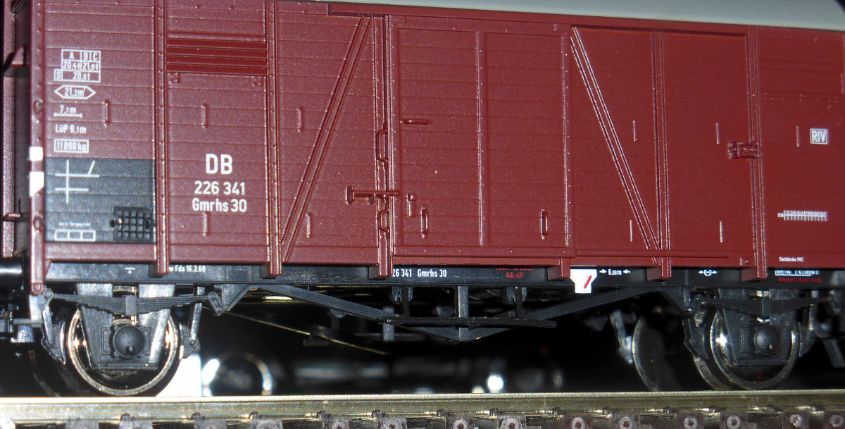 Из того, что видно сразу. Никаких подвижных частей, кроме колес и кинематического механизма, у вагона нет. Прилагаются навесные детали, как то держатели сигналов, поручни, крюки, рукава. Подножки куда более ажурные, чем у Лилипута, много нанесенных трафаретов. Борта явно покрыты лаком: отблескивают нещадно при фотографии со вспышкой, из-за чего вживую модель смотрится куда лучше, чем на фотографиях.