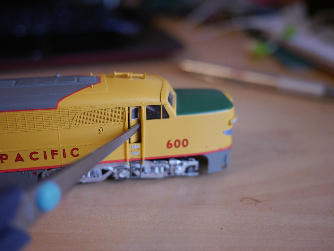 Однако снял я их не для того, чтобы сделать еще одну фото: тепловозы катаю без фальшборотов. Дело в том, что у модели весьма хлипко сделано крепление корпуса к ходовой. На ходовке - 4 металлических очень маленьких штырька (по 2 с каждого борта), которые входят в пазы пластикового кузова. Последний сделан из довольно тонкого пластика, и когда тепловоз берешь в руки - корпус немного "гуляет". В результате штыри раздалбывают пазы. Корпус снимается с ходовой без всяких усилий. Потому модель нужно брать за бак, за когда снимаешь с полки. А если к корпусу присоединены борта бака - то и взяться не за что.