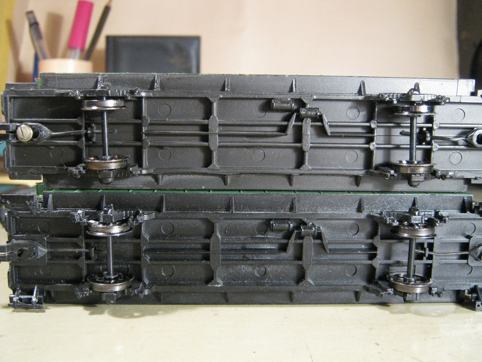 Начнем с мнения автора: вагон можно считать достаточно редким экземпляром, учитывая что те комплекты которые сейчас можно найти в продаже - или убиты в грязь или стоят по 350$ за сет (и тоже нередко убиты не менее). Мной было проведена реконструкция основных компонентов а так же сборка накладных деталей. Родные колпары (с диаметром кстати 12.5мм) были заменены на металлические (пр-тво Fleischmann), кроме того покрашены "по канону" колпары. Родные сцепные механизмы были вырезаны бормашинкой а пространство под вагонами отполировано для установки NEM-шахты. Анекдот: шахта сцепки посажена на модельный клей и идеально вписывается по высоте сцепки в общие стандарты, более того (!) установка сцепки типа "селёдка" создает в итоге почти идеальное соприкасание демпферов вагонов между собой.