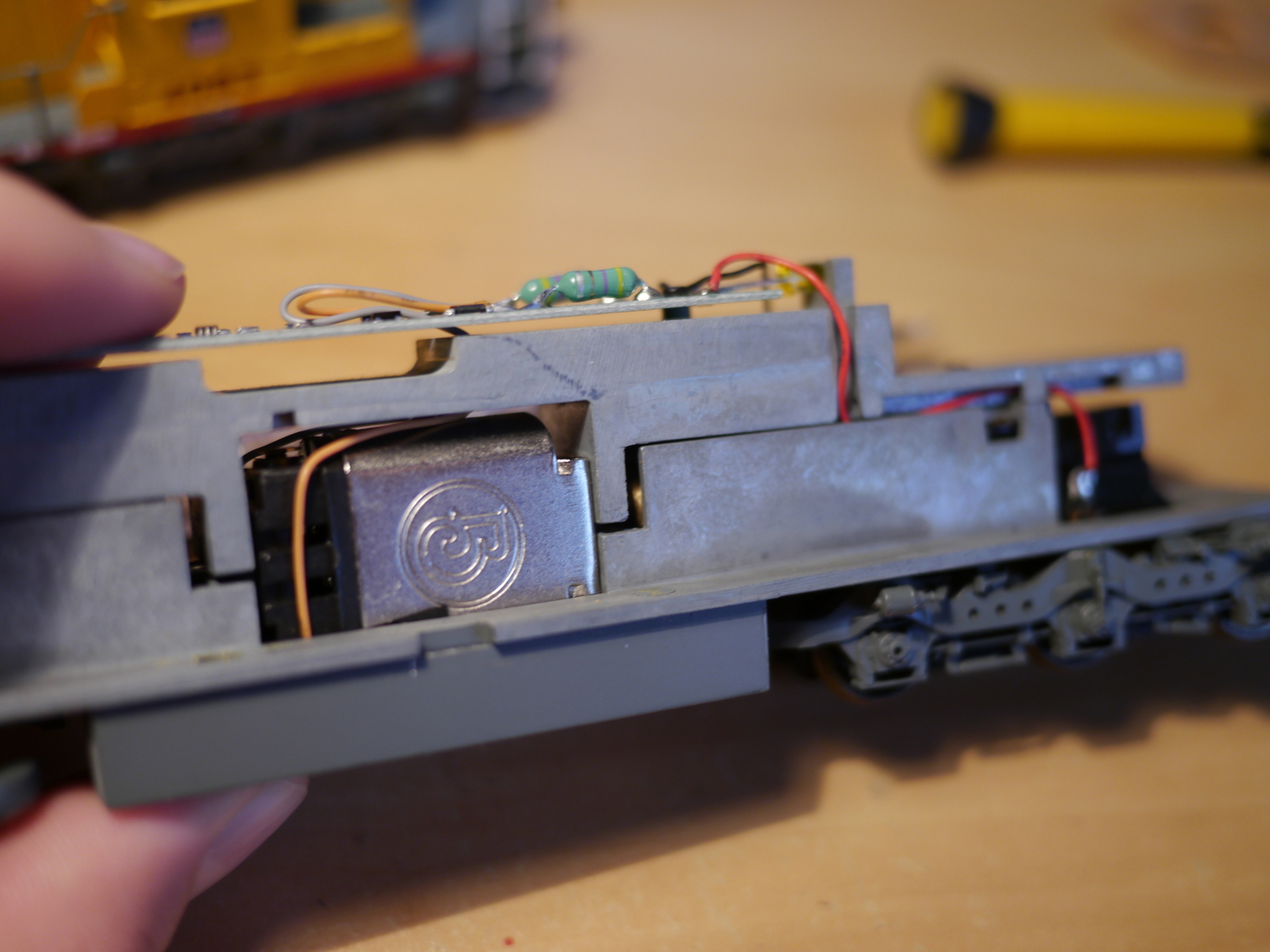 А вот внутри уже отнюдь не старье. Давайте разберем тепловоз. Для этого нужно отщелкнуть накладную на бак, под ней скрыты два винтика. Снимаем кузов. Видим плату, со встроенным цифровым декодером. Да-да, за 900 грн. (пр курсе доллара - 12 грн.) покупается цифровой лок. О качестве работы декодера ничего сказать не могу, потому что катаю локомотивы исключительно на аналоге. Как видим, балласта много, модель увесистая. Двигатель пятиполюсный, с двумя большими маховиками (их видно плохо, но по блеску латуни в щели балласта можете убедится в их наличии