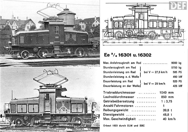 Быстро распространяющаяся электрификация железных дорог привела к увеличению потребности в маневровых электровозах, которые бы заменили маневровые паровые локомотивы. В 1922 г. был заказан прототип, получивший обозначение класса Ее 3/4 и имевший рабочую ось, что позволяло обходить ограничение железных дорогах Швейцарии по нагрузке на ось до 15 тонн. Однако локомотивы, запущенные в серийное производство в 1928 г., уже не имели рабочей оси. Эти локомотивы были классифицированы как Ее 3/3. Изначально кабина машиниста в этих локомотивах находилась сзади, благодаря чему электровоз получил прозвище «утюг».