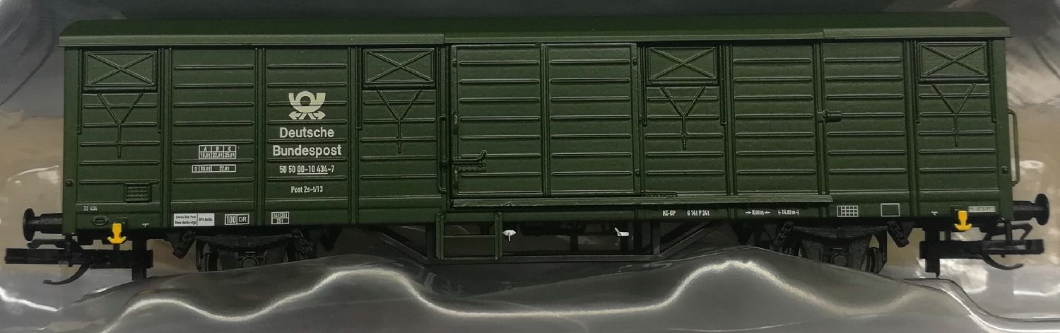 После объединения двух Германий в 1990 году, DR и DB продолжали функционировать, как два различных ведомства до 31 декабря 1993 года. И, напротив, ГДР-овская Deutsche Post, стала частью Deutsche Bundespost, практически сразу - в 1990 году. Поэтому, как предподожение, вагон относится именно к указанному периоду времени - с конца 1990 года, когда восточно-германская Deutsche Post была уже упразднена и соответственно на вагоне уже имеется лого Deutsche Bundespost, обслуживающая обе части единой ФРГ и до 1 января 1994 года, когда DR и DB ещё не были упразднены и структурно не преобразованы в единое Deutsche Bahn AG. По этой причине, возможно и наблюдается некий сумбур в обозначениях на вагоне - логотип почты уже общий в обеих частях Германии, но DR ещё была актуальной в восточной части ФРГ.