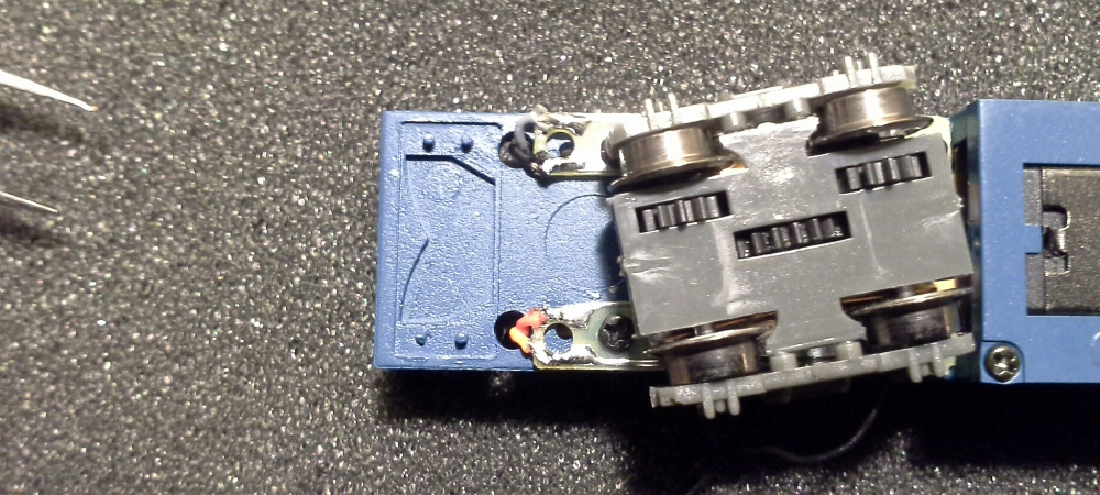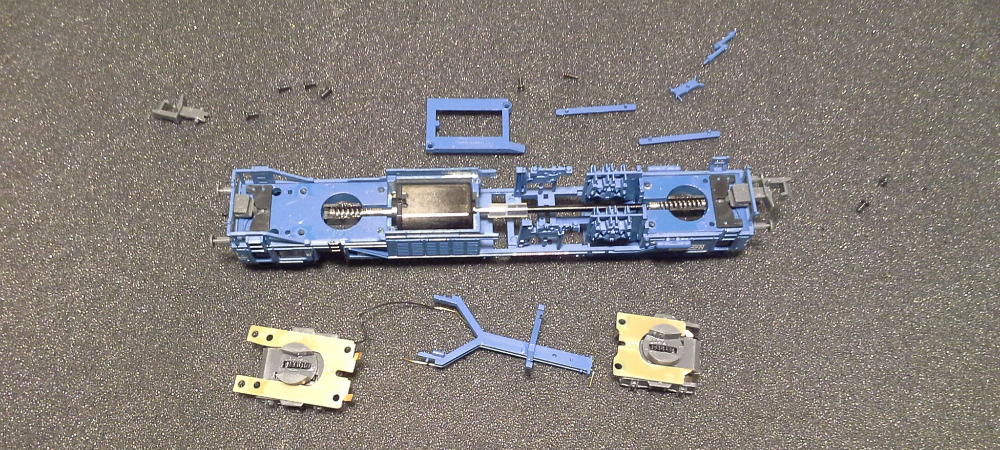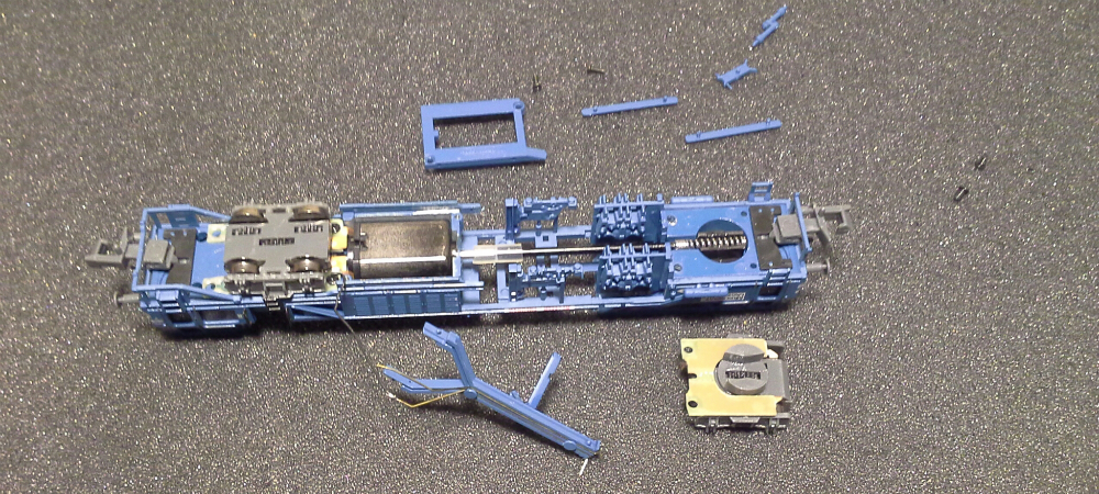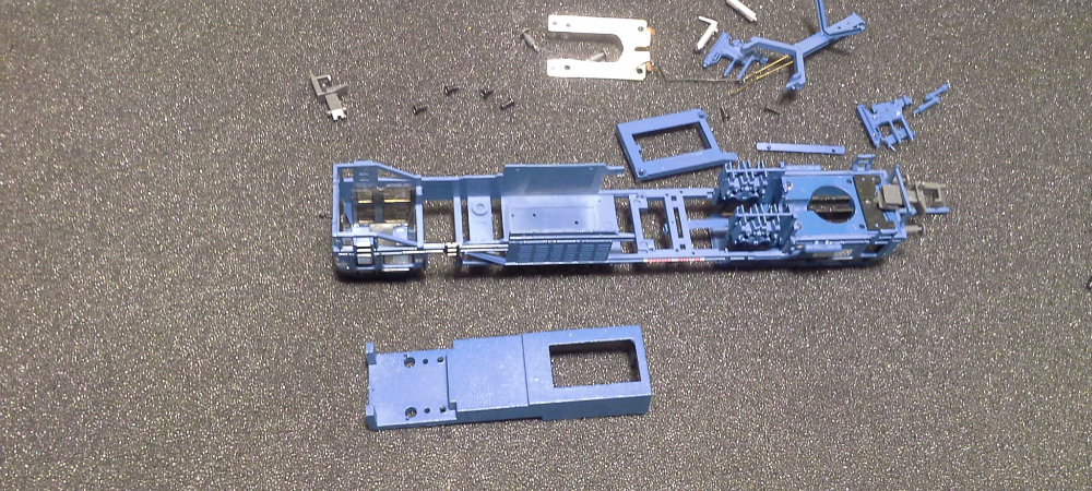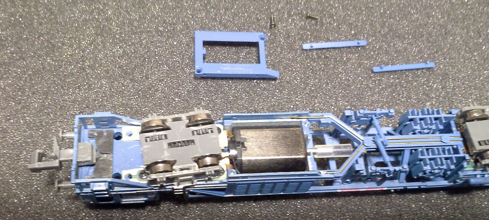 Откручиваем крепление двигателя и вынимаем два боковых резервуара которые являются фиксаторами кузова относительно груза (рамы). Должен заметить, что эти самые резервуары изначально имеют очень плохую фиксацию, поэтому руки так и чешутся их приклееть. выводим из зацепления балку внутри которой расположены токонесущие шины ко второй тележке откручиваем два винта крепления задней тележки и четыре винта передней.