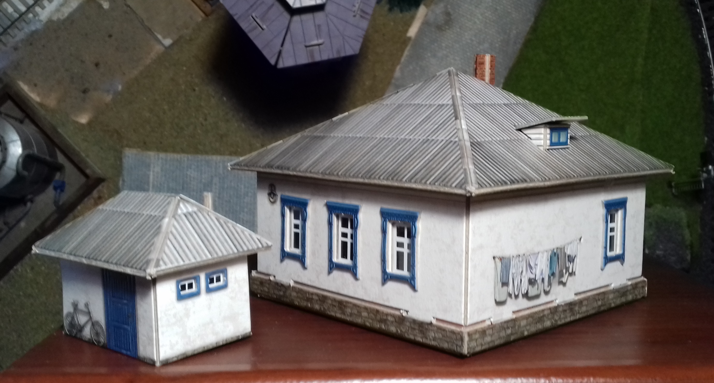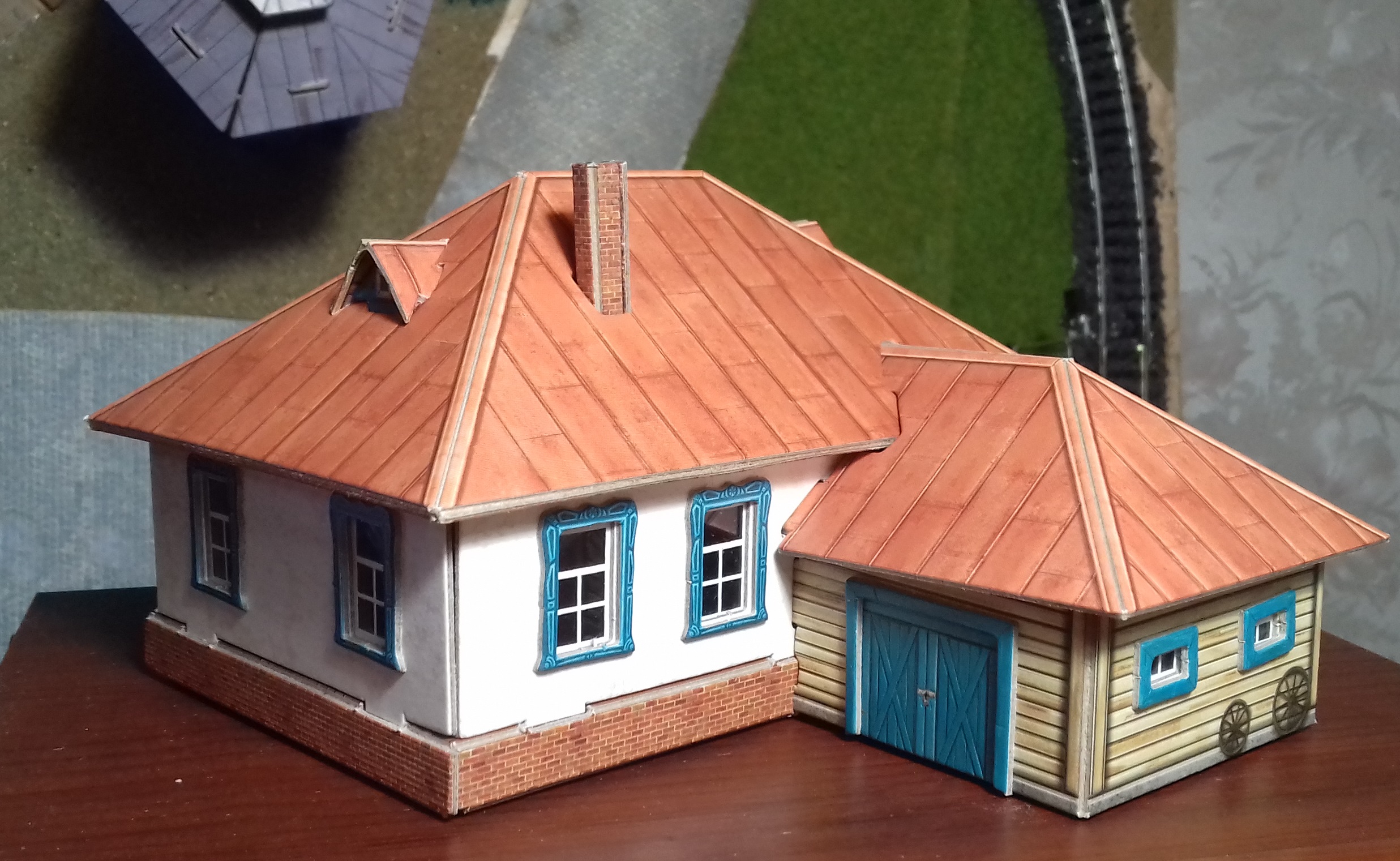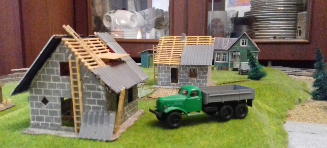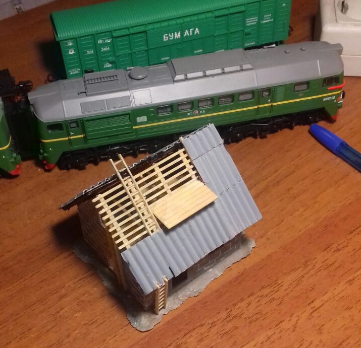 Затем нарезаем на сегменты и клеим на домик получившийся "шифер": Вот такие строящиеся дачки вышли: Шифер крупноват. Но тут та же ситуация, что и с углем в паровозных тендерах: если делать куски угля в масштабе, он будет выглядеть как черный песок. Шифер правильного размера есть на домиках "Умбум", и лично для меня он выглядит невзрачно.