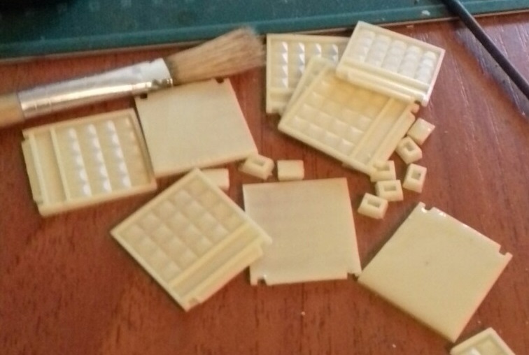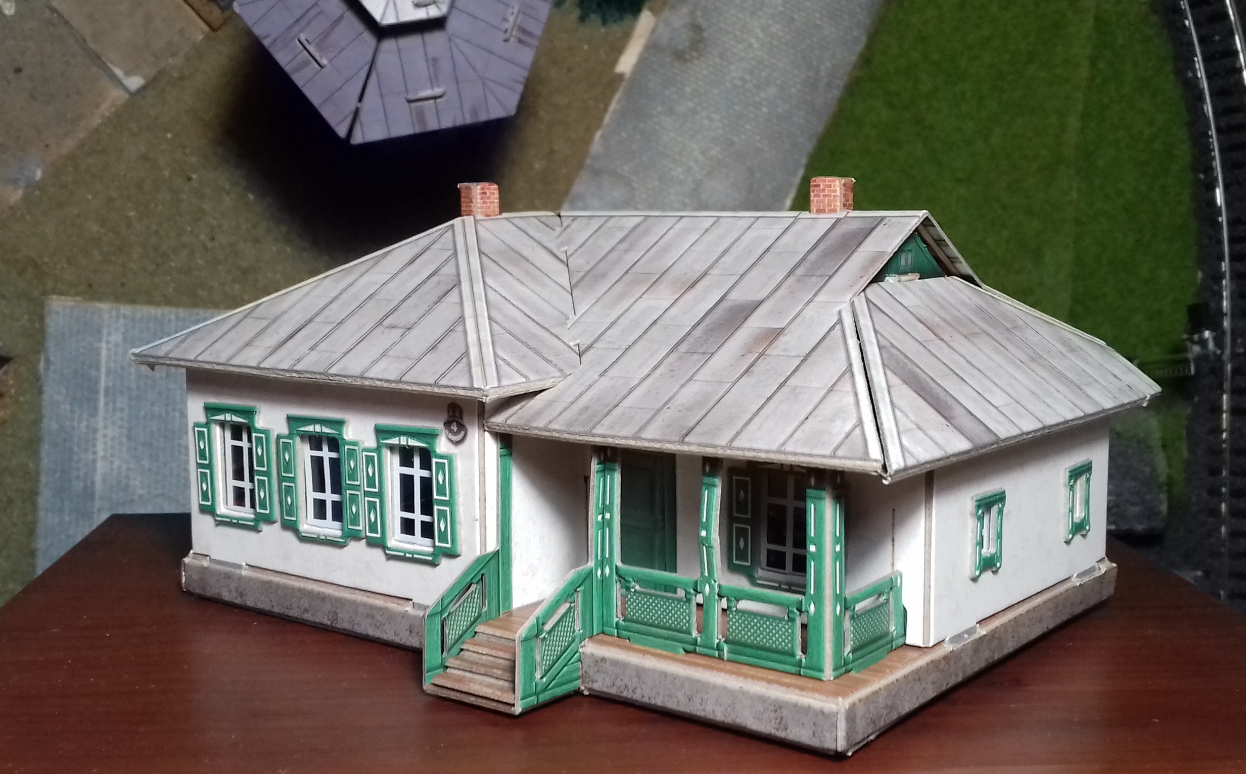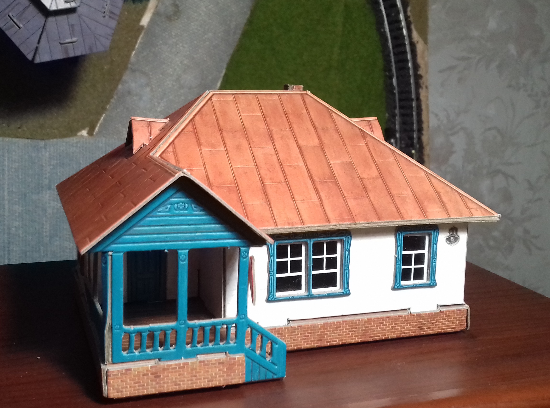 Затем нарезаем на сегменты и клеим на домик получившийся "шифер": Вот такие строящиеся дачки вышли: Шифер крупноват. Но тут та же ситуация, что и с углем в паровозных тендерах: если делать куски угля в масштабе, он будет выглядеть как черный песок. Шифер правильного размера есть на домиках "Умбум", и лично для меня он выглядит невзрачно.
