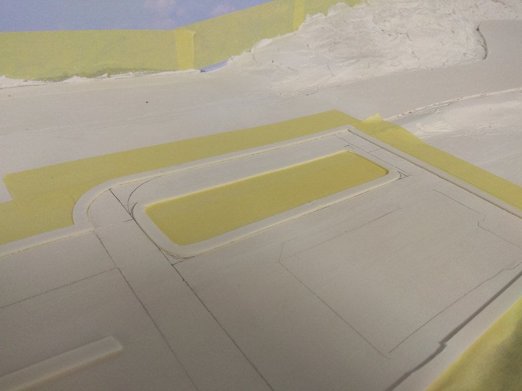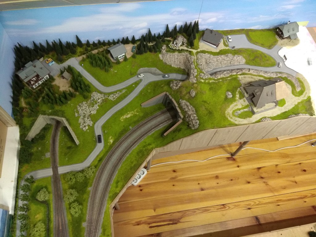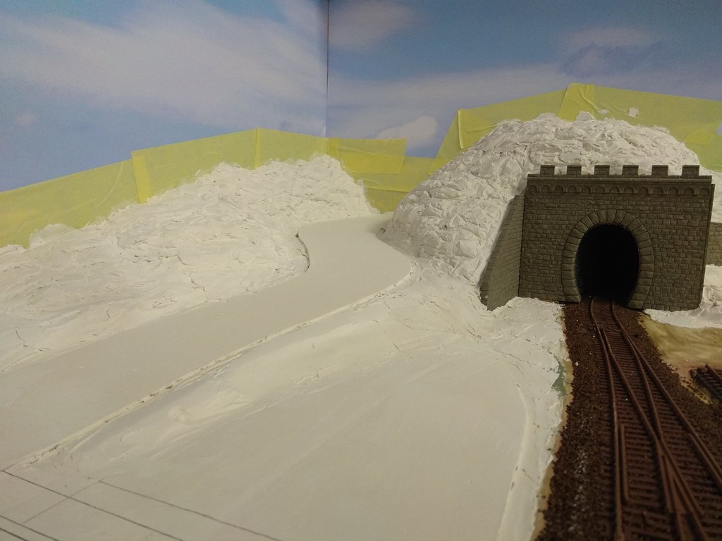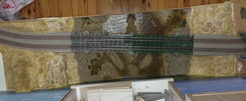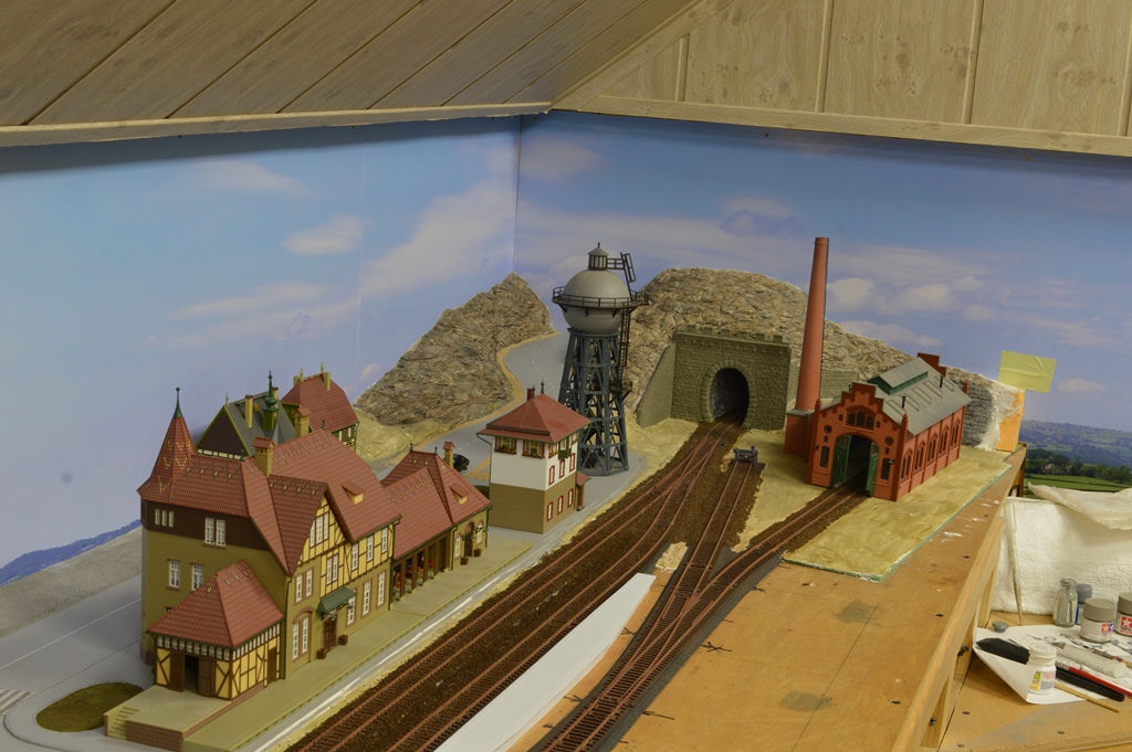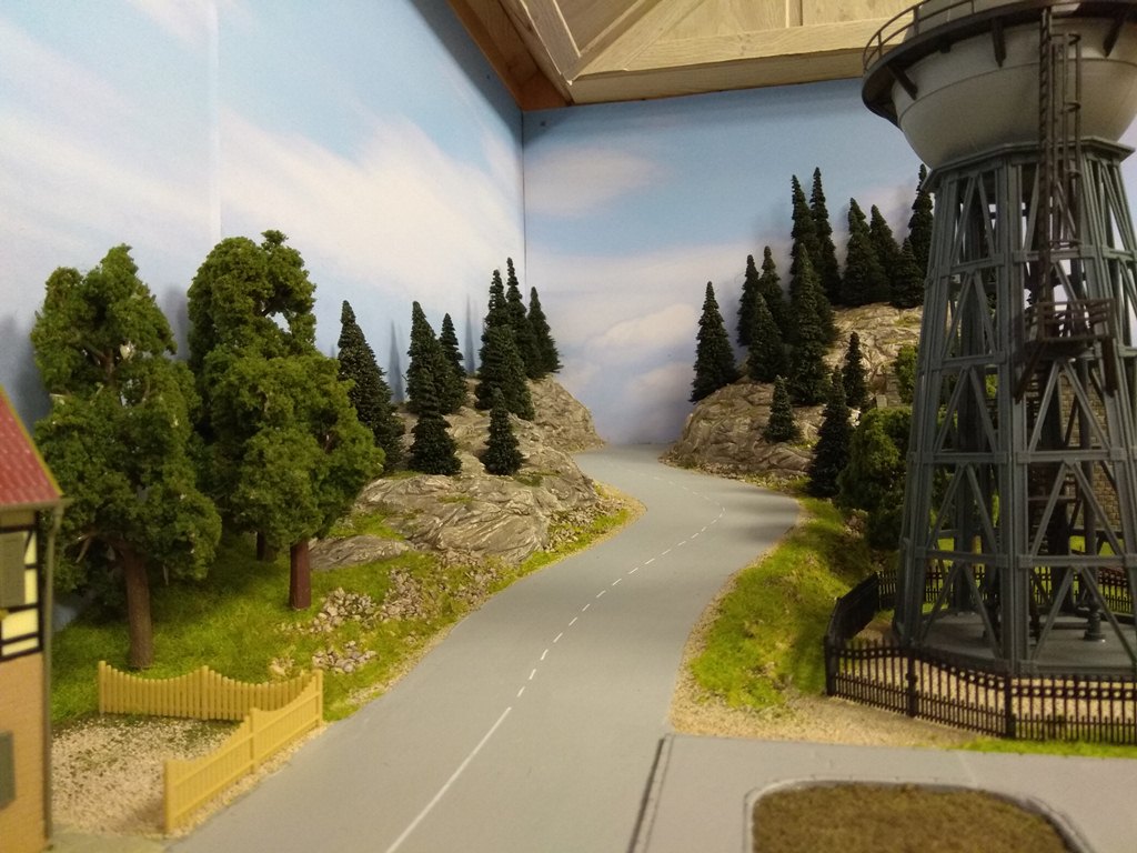 На сегодня в городе сделаны дорога и тротуары, дорога в горах за городам, уложены и частично забалластированы пути. Тротуары сделаны из моей любимой гипсовой шпаклевки вторым слоем над слоем дороги.