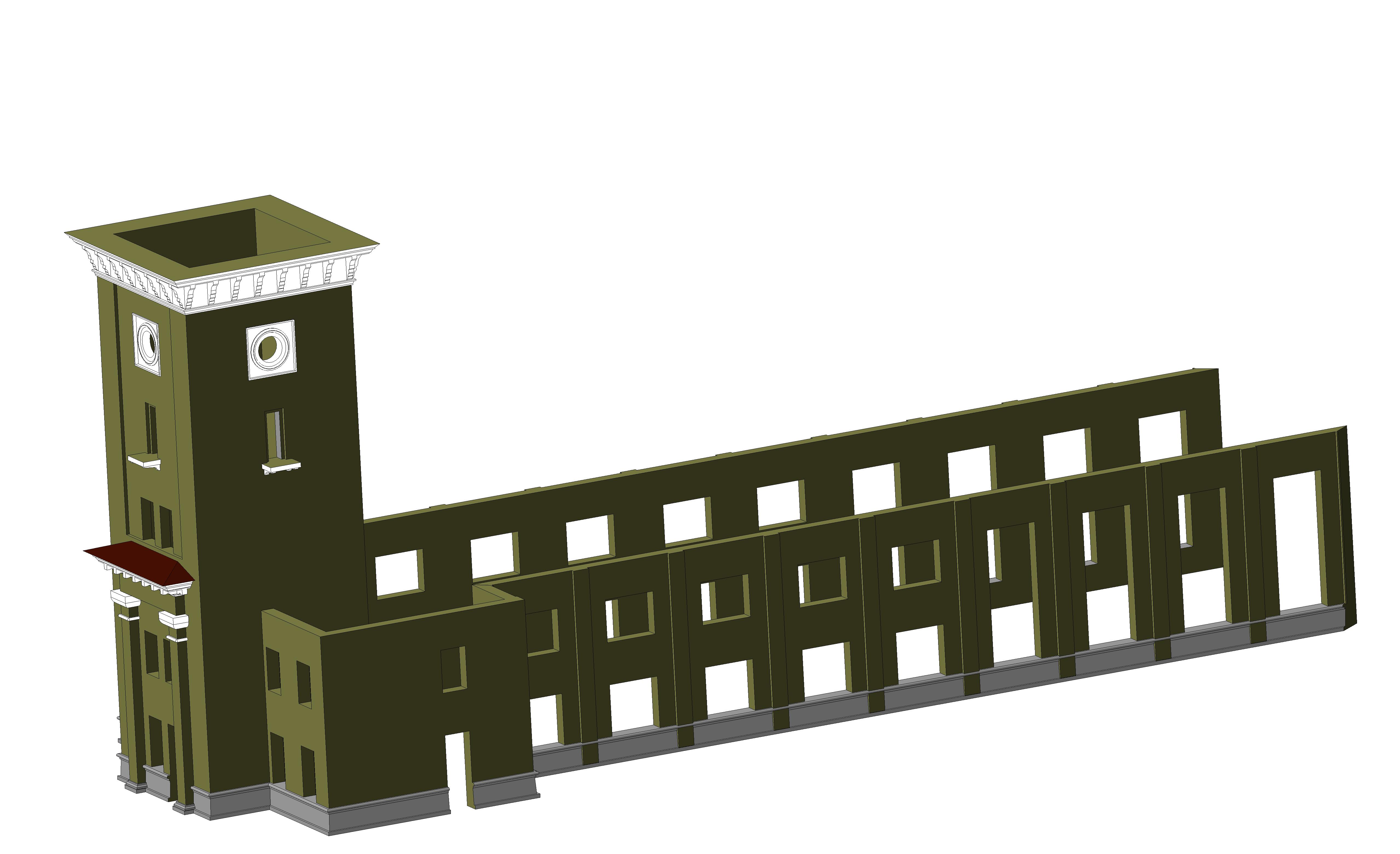 Здание вокзала практически симметричное. Проработал вопрос стыковки деталей. Все должно помещаться в рабочее поле с максимальной длинной по одной из сторон до 140мм.