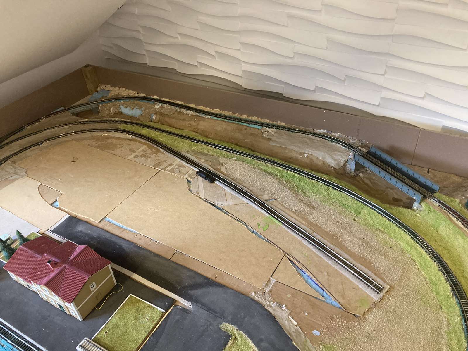 Мається на увазі стінка від самого ламінатового бортика на верхньому ярусі. Заодно і з задніком простіше буде.Винт 757 писав:[едине не впевнений чи потрібно підпорні стінки - може нехватить відстані між коліями .і верх стіни може оказаться близько до шпал колій верхнього яруса , тому "посадить" там дерева не вийде- на бетоні дерева не ростуть. А от невеличкий сегмент підпорної стінки на кінцях правого мосту технічна необхідність- щоб було по "феншую"