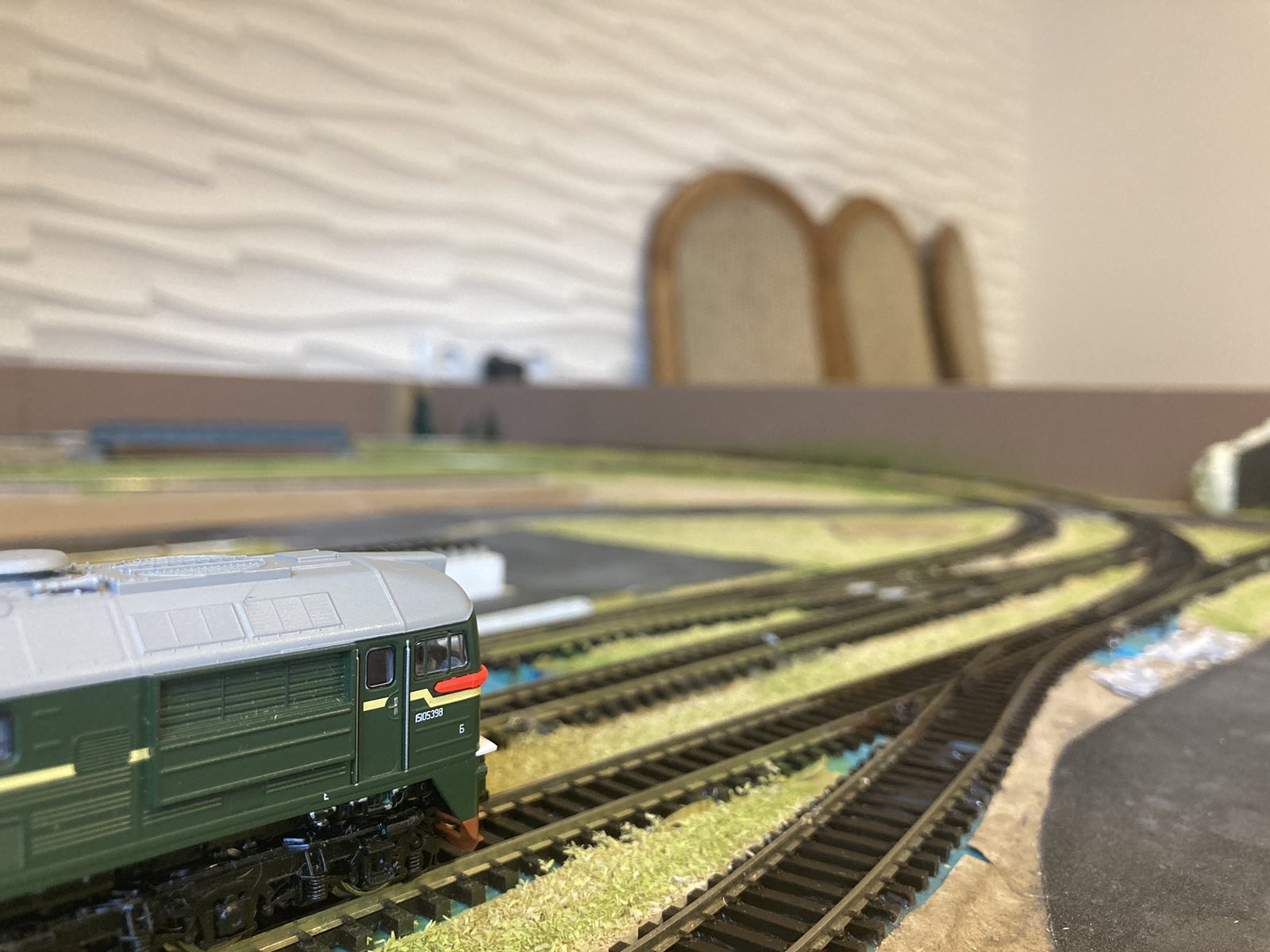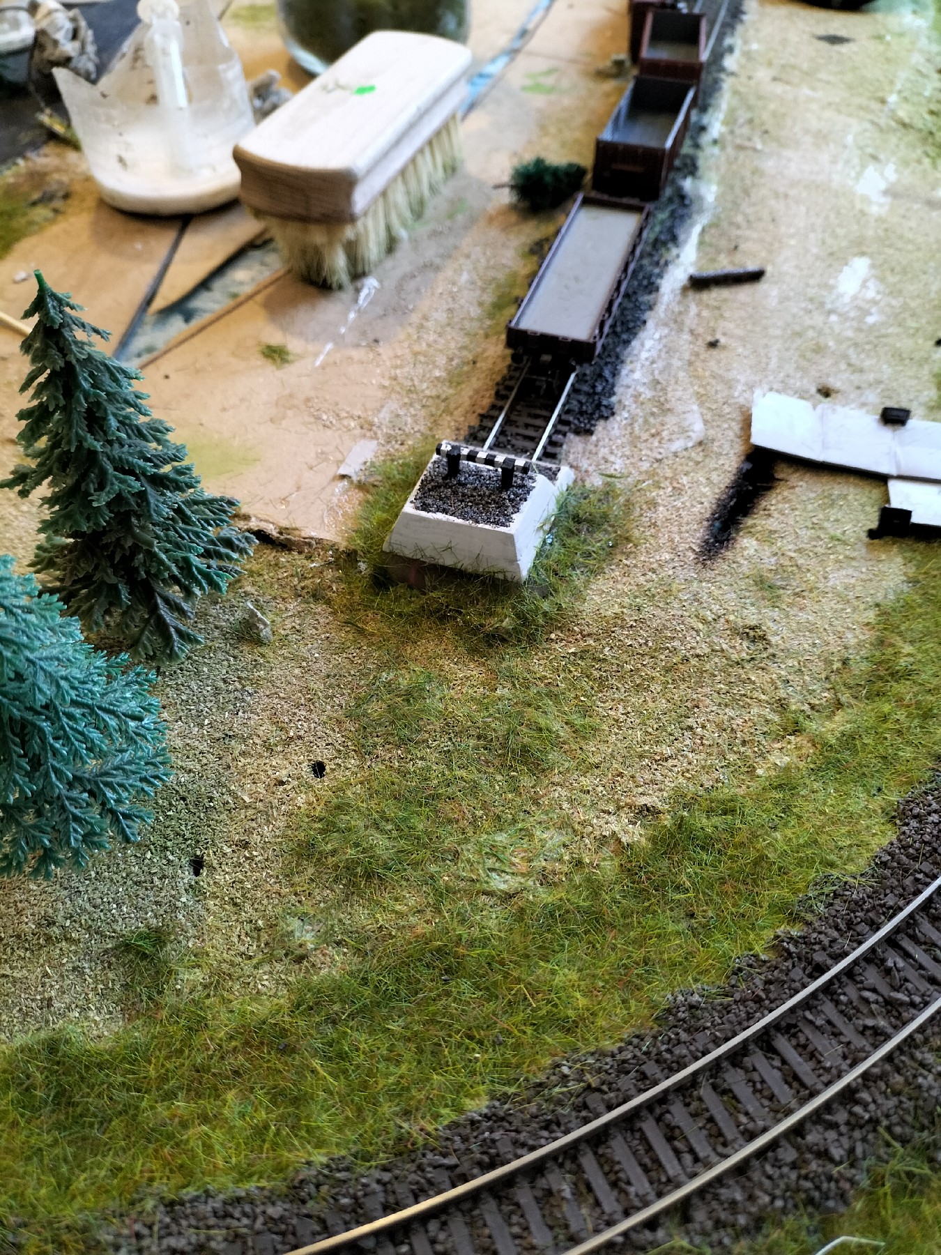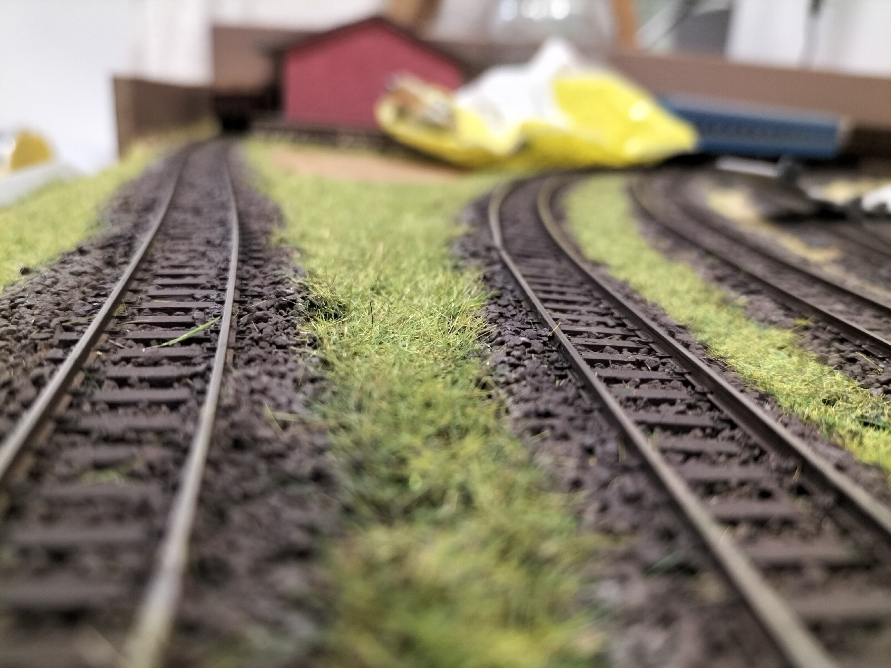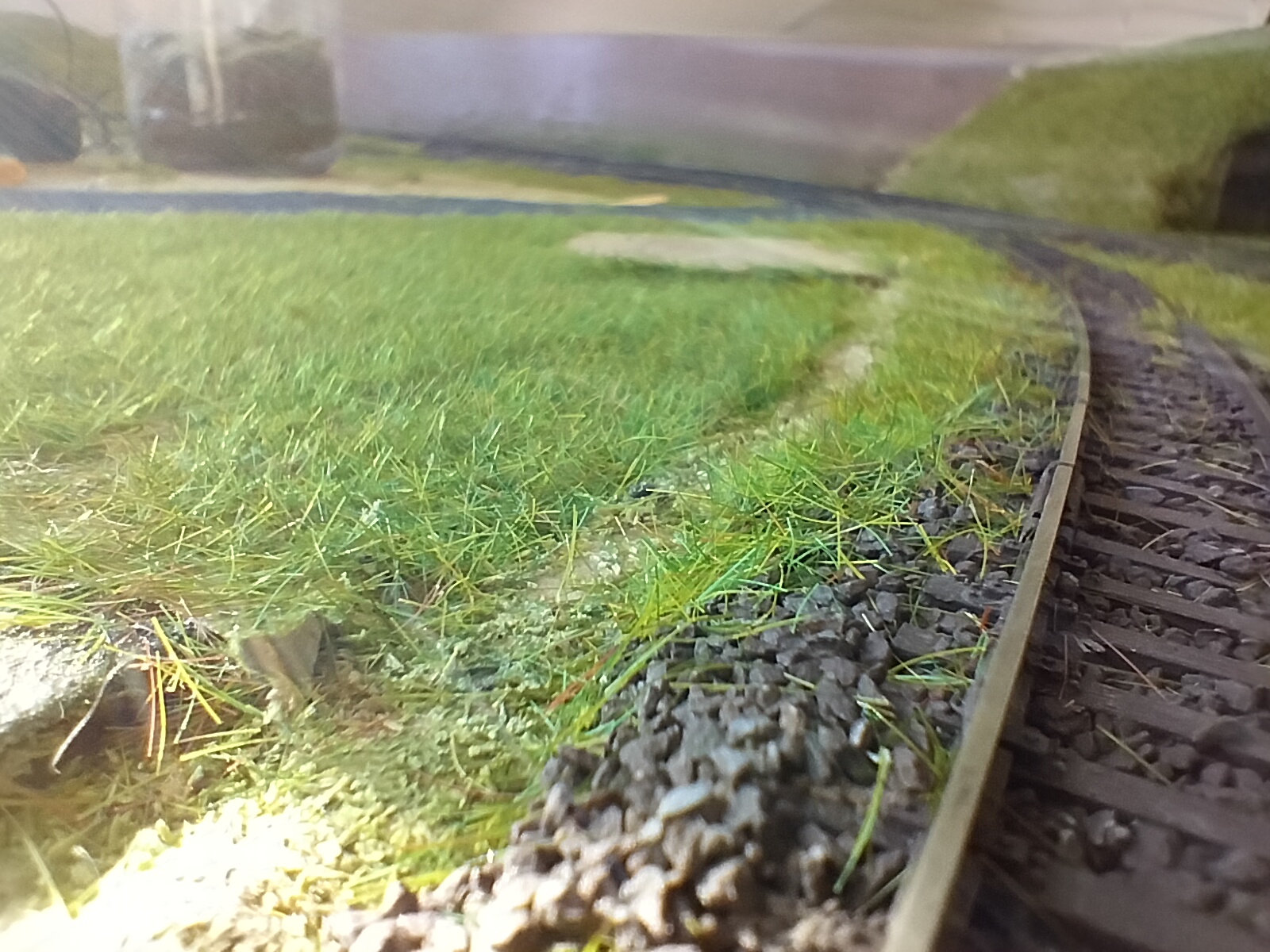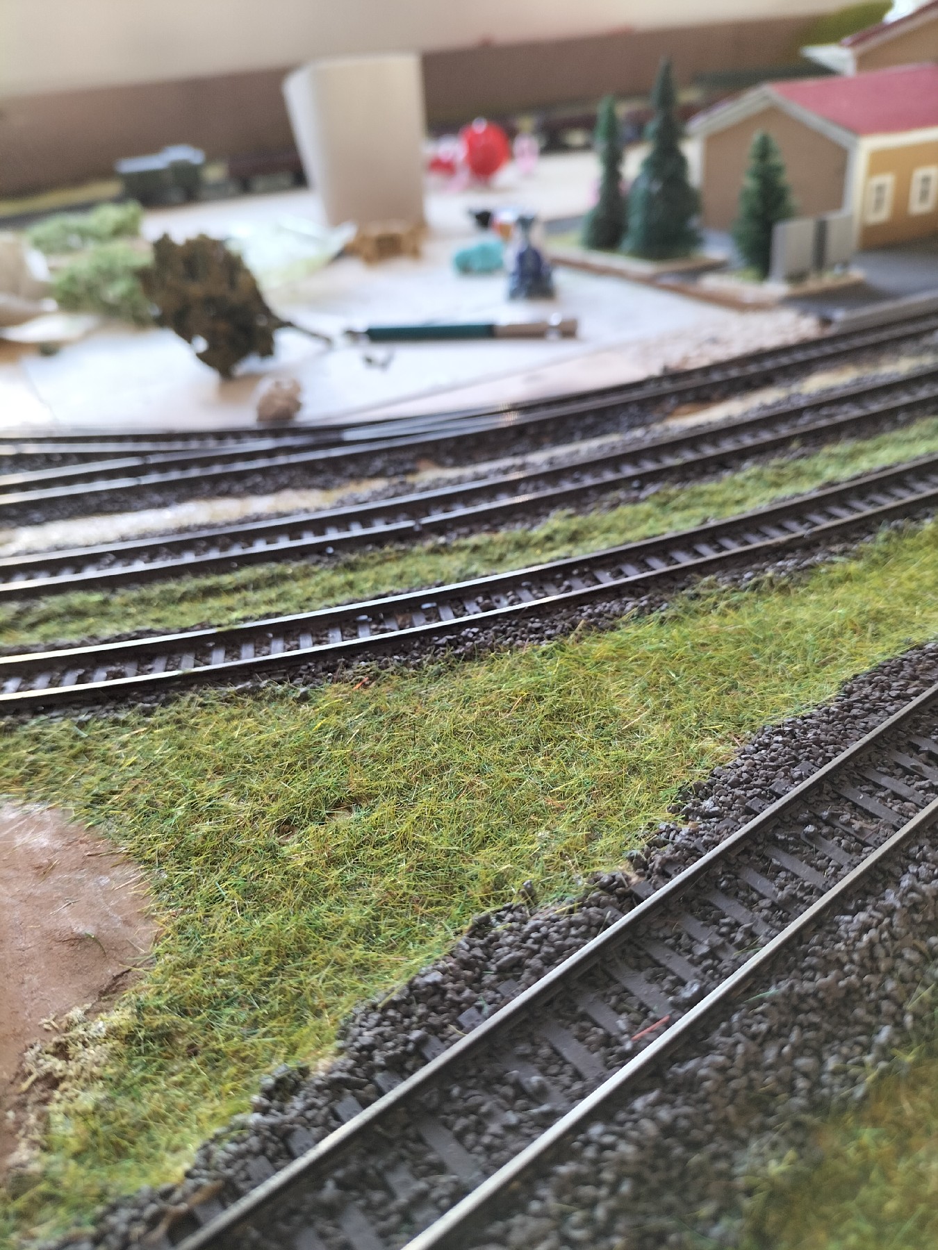 Давно не писав про макет - кинувся у перепил локомотивів. За той час відсипав балласт, пофарбував рельси емаллю Humbrol та врчра почав засаджу вати травку. Результат на фото. Після висихання клею пилосошу траву портативним автомобільним пилососом та повторно використовую.