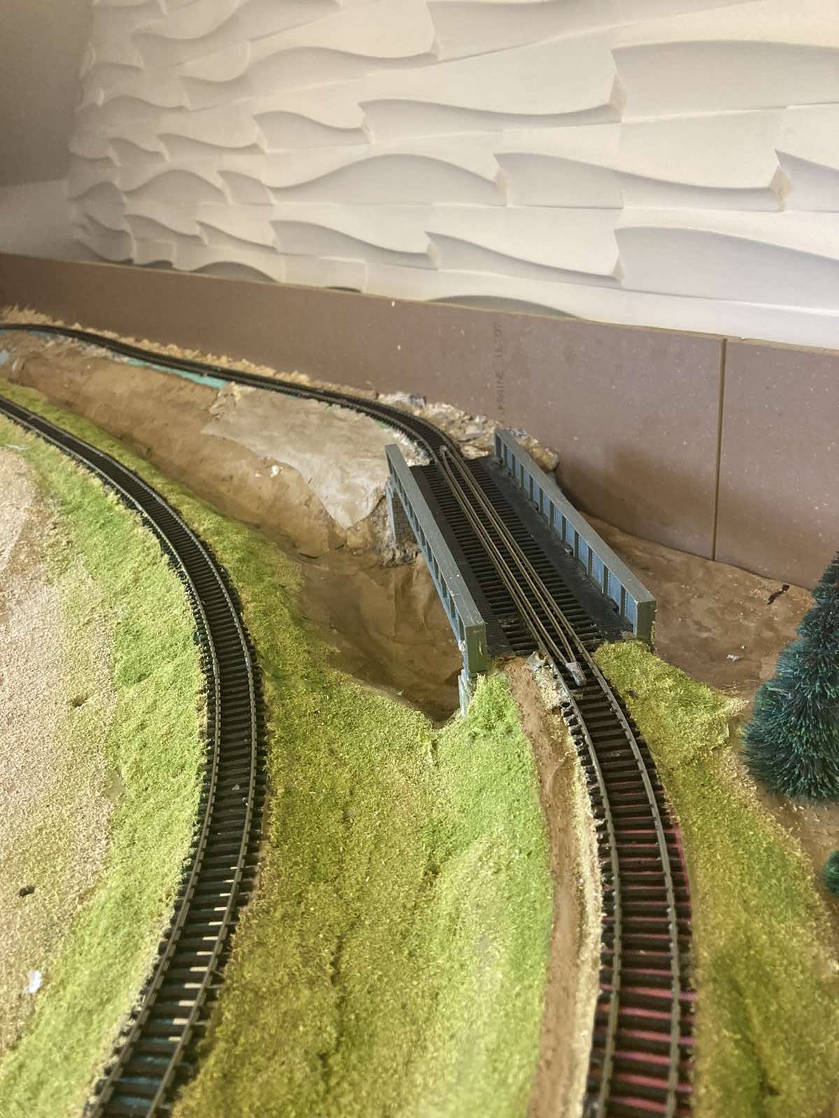 Не дуже гарний варіант, буде сильно іграшковістю віддавати, бо відстань між мостами не велика , і якби при прокладанні справжньої залізниці була б така ситуація то такий виступ гірського кряжу просто підірвали б динамітом ,а залишками підірваної породи засипали б сухі балки під мостами піднавши насип до рівня прокладки рельс замість побудови мостів. Так було б набагато дешевше і швидше ніж будувати два мости і длубати тонель на якусь сотню метрів. Тим більше що любий міст на дільниці прокладки рейок -це автоматичне зниження швидкості проходу поіздом ціеї дільниці в майбутньому . Тож мости строїли лиш в разі безвихідної ситуації. (перетин річок,або перпендикулярних рельс, зрідка автошляхів- якщо підняти полотно автодороги до рівня рейок було дорожче за побудову мосту. Зазвичай автомобільні мости автострад підіймають над залізницею так як як це дешевше в будівництві.Але якщо річку засипати і насипати гору, а мости тоді будуть через балки - цілком можна зробити тунель від мосту до мосту. Внутрішня колія тоді буде іти попід горою.