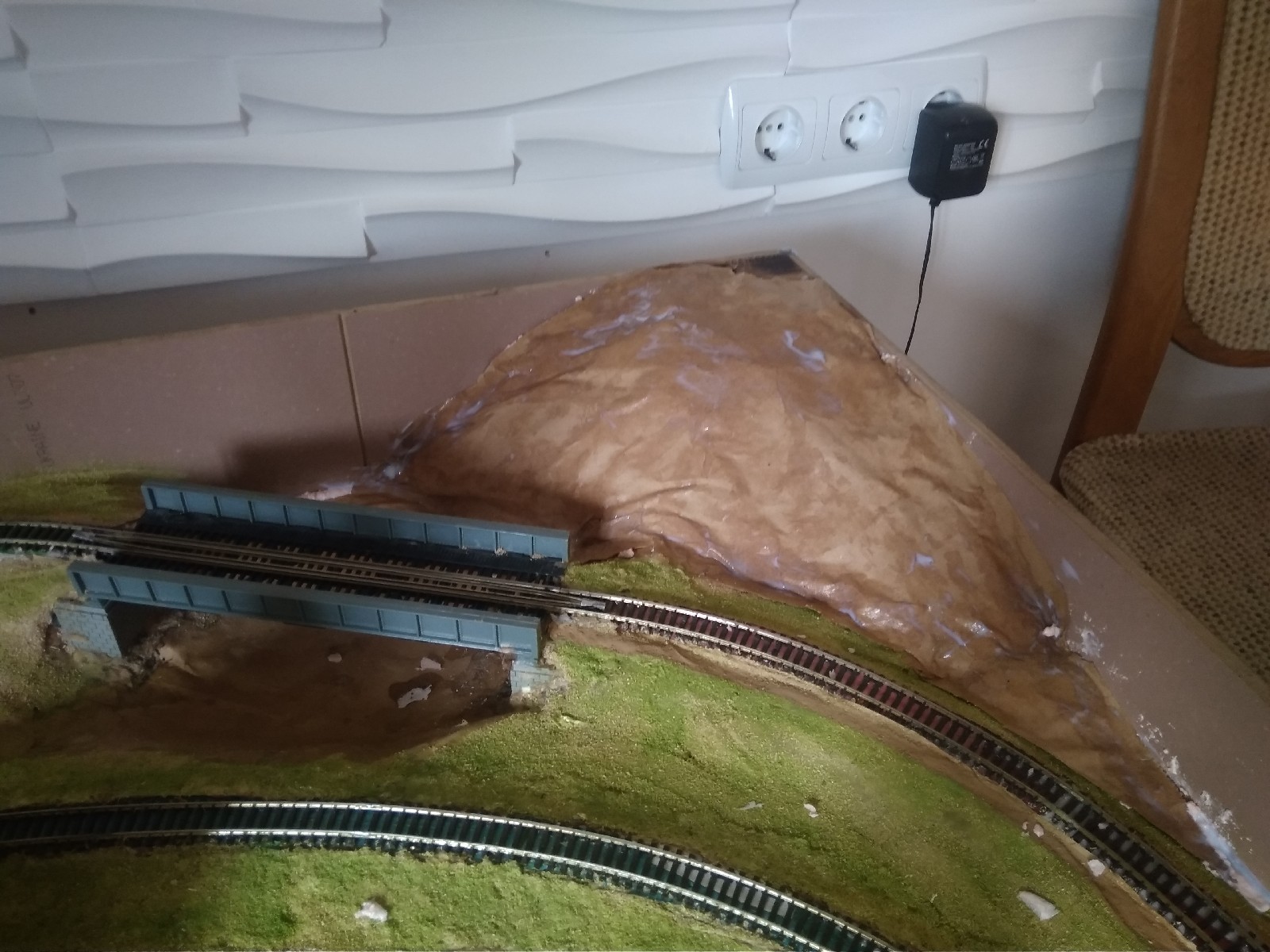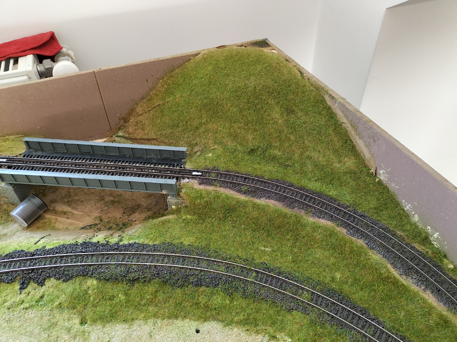 Дійсно, Ви праві, тунель по дальному перегону не буде правдоподібним. Почав щось там городити, але плюнув та вернув як було. Спуск між мостами насправді не дуже виглядає - зразу за великим знаходиться відносно різкий "перелом" на рух не впливає, але поїзд помітно вигинає "спину". Вирішив так - велике коло я замаскую "зеленкою". На днях їхав поїздом через Бескидський перевал та занотовував собі у пам'яті що там і як. У багатьох місцях простір між насипом та річкою порослий кущами та деревами. В моїй теорії якщо грамотно засадити береги річки, це візуально розірве вигляд кола і водночас мелькаючий у просвітах поїзд буде досить цікаво виглядати. Особливо у темряві, якщо зробити світло у вагонах. Від бортика можна поставити підпірні стінки - бачив на перевалі бетонні, пофарбовані у біле, на фоні якого поїзд буде краще виглядати. А от у правому краю все ж не робитиму тунеля - чесно кажучи не бачив щоби дві різні гілки входили в один портал, а далі розходились на різні, це все таки не метро. У дальніх кутах зробив гори - по задумці віртуальна гора обходить колії справа по дузі від мосту вниз в знову появляється на макеті там де портал.