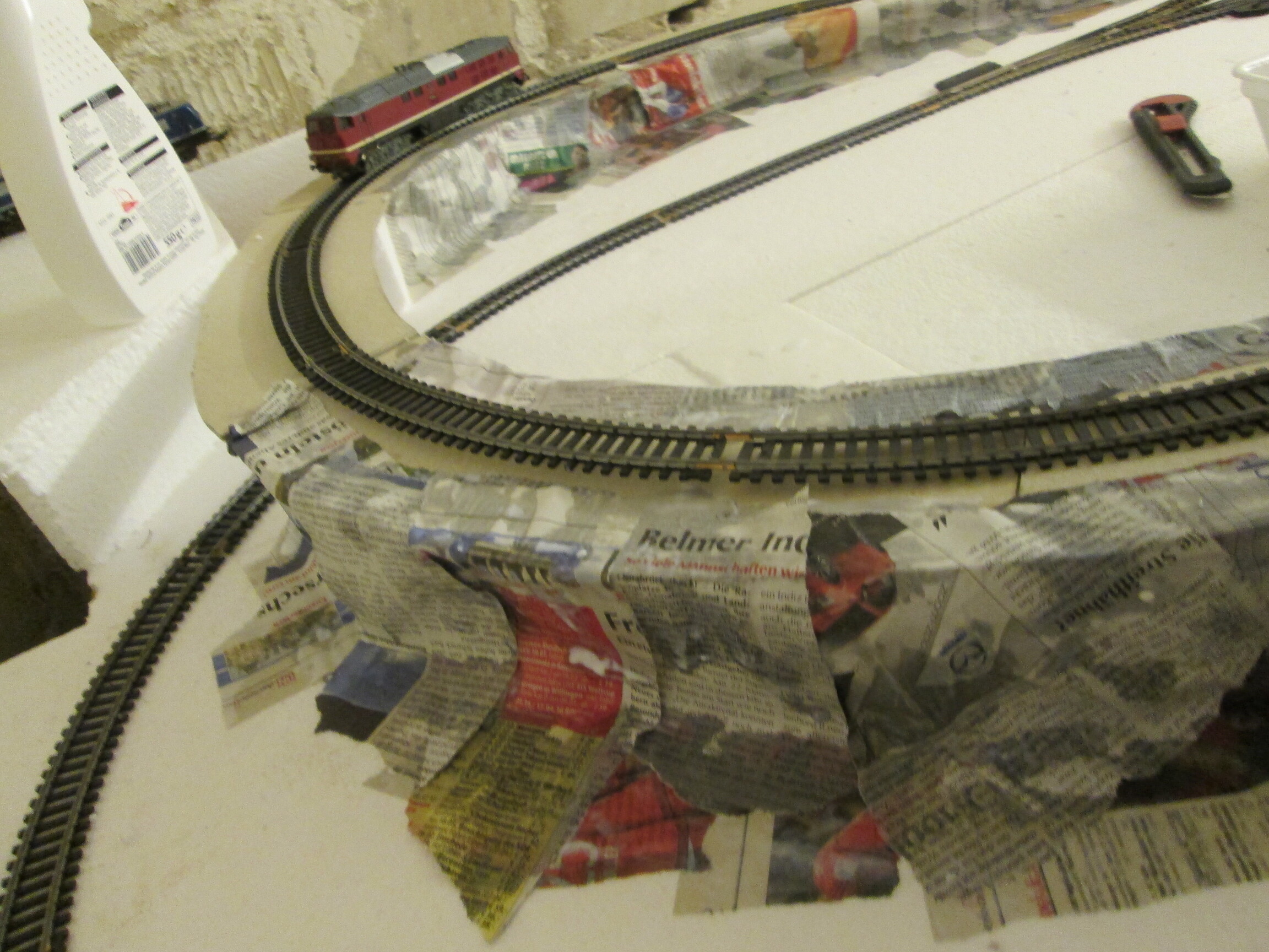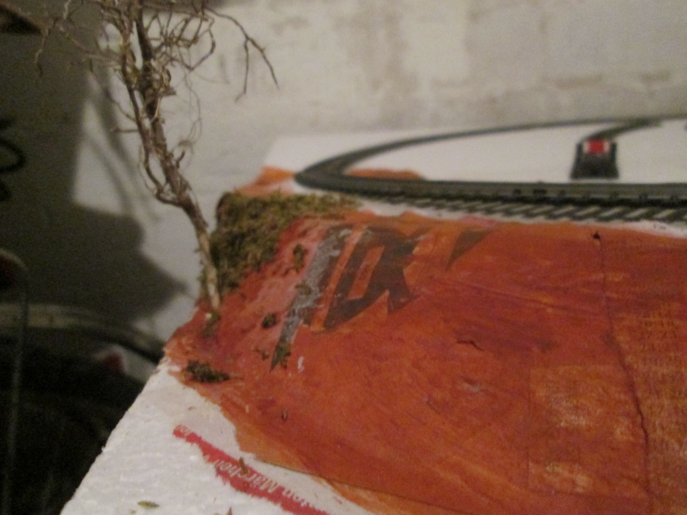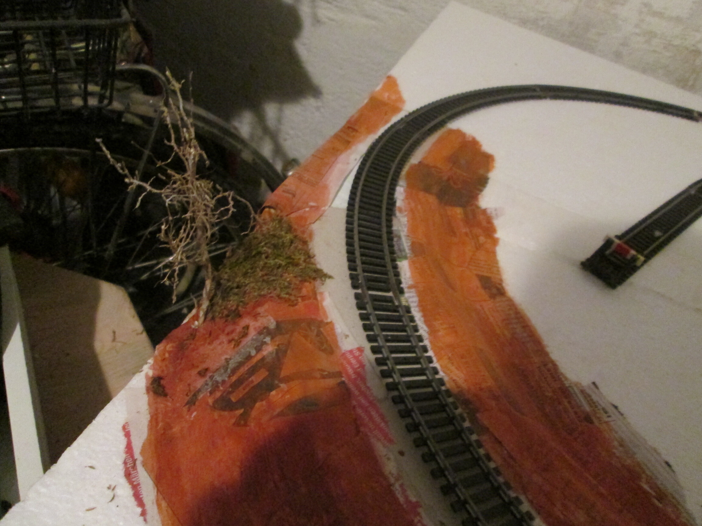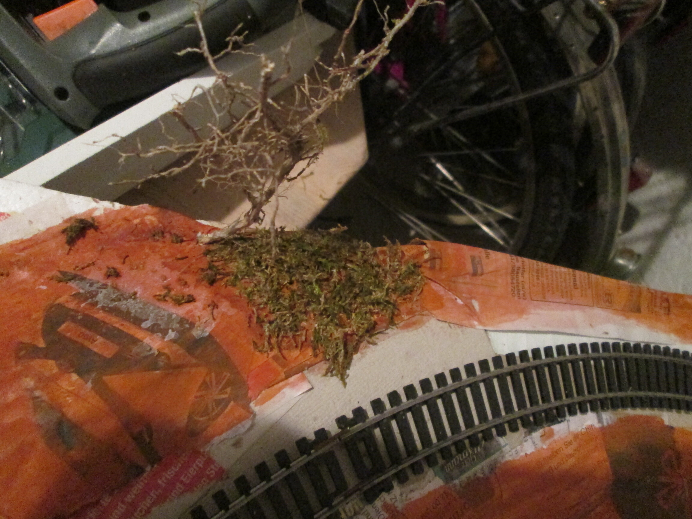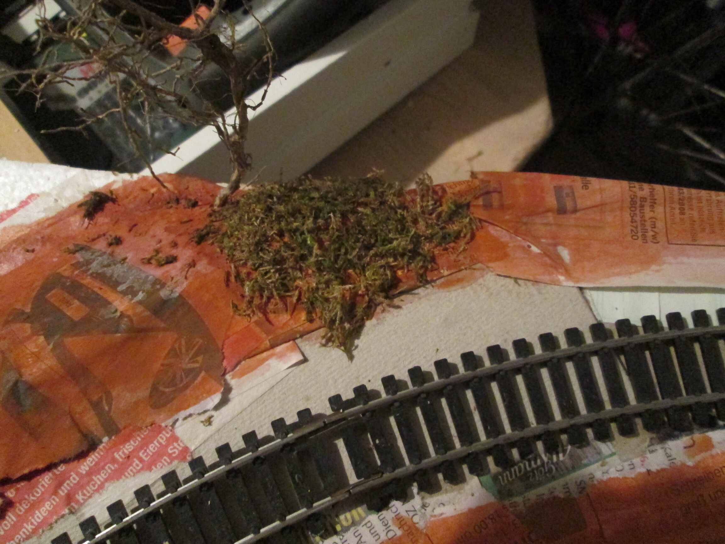 за отпуск был склеен из картона и бумаги вокзал немецкий также малость покрасил горки и попробовал сделать растительность из мха, который сушился с весны. что скажете по поводу его использования?