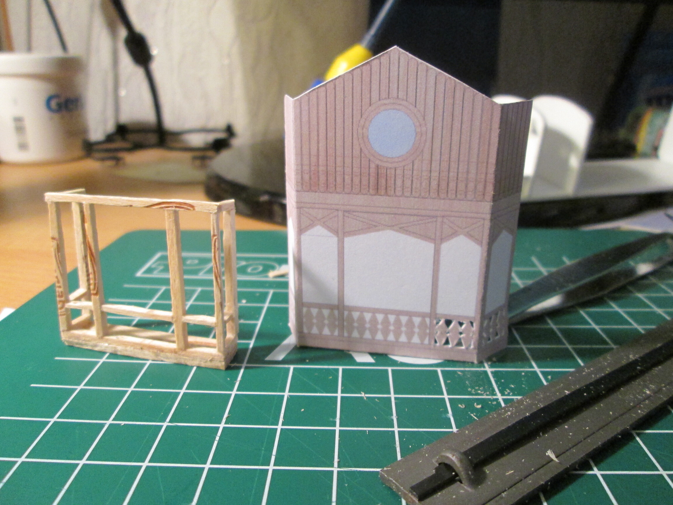 попытался оживить здание. сделал балкончик из спичек и шпона