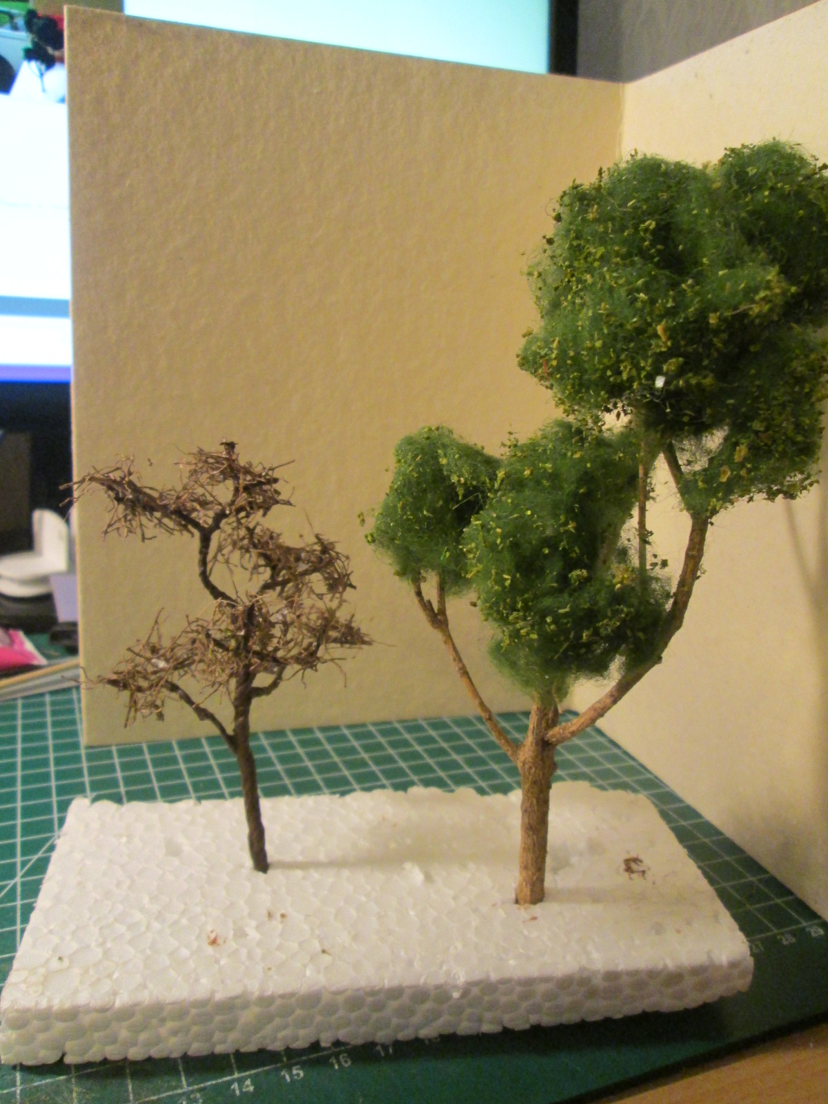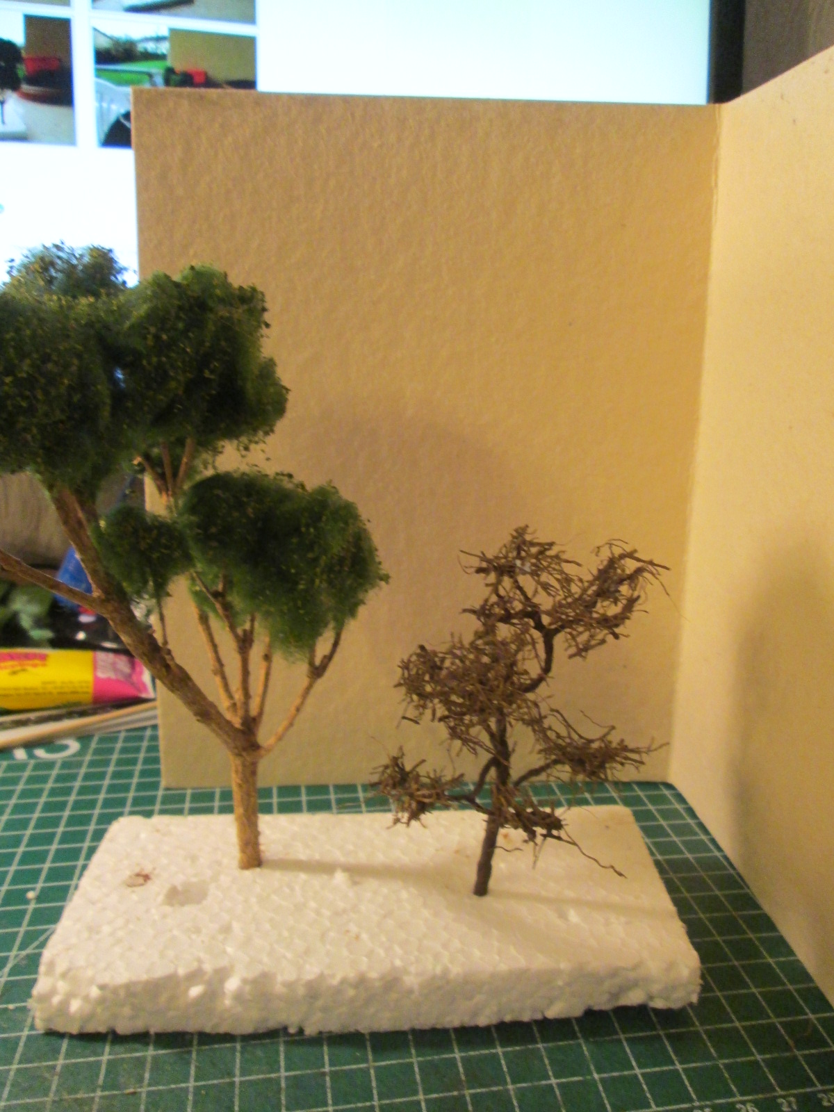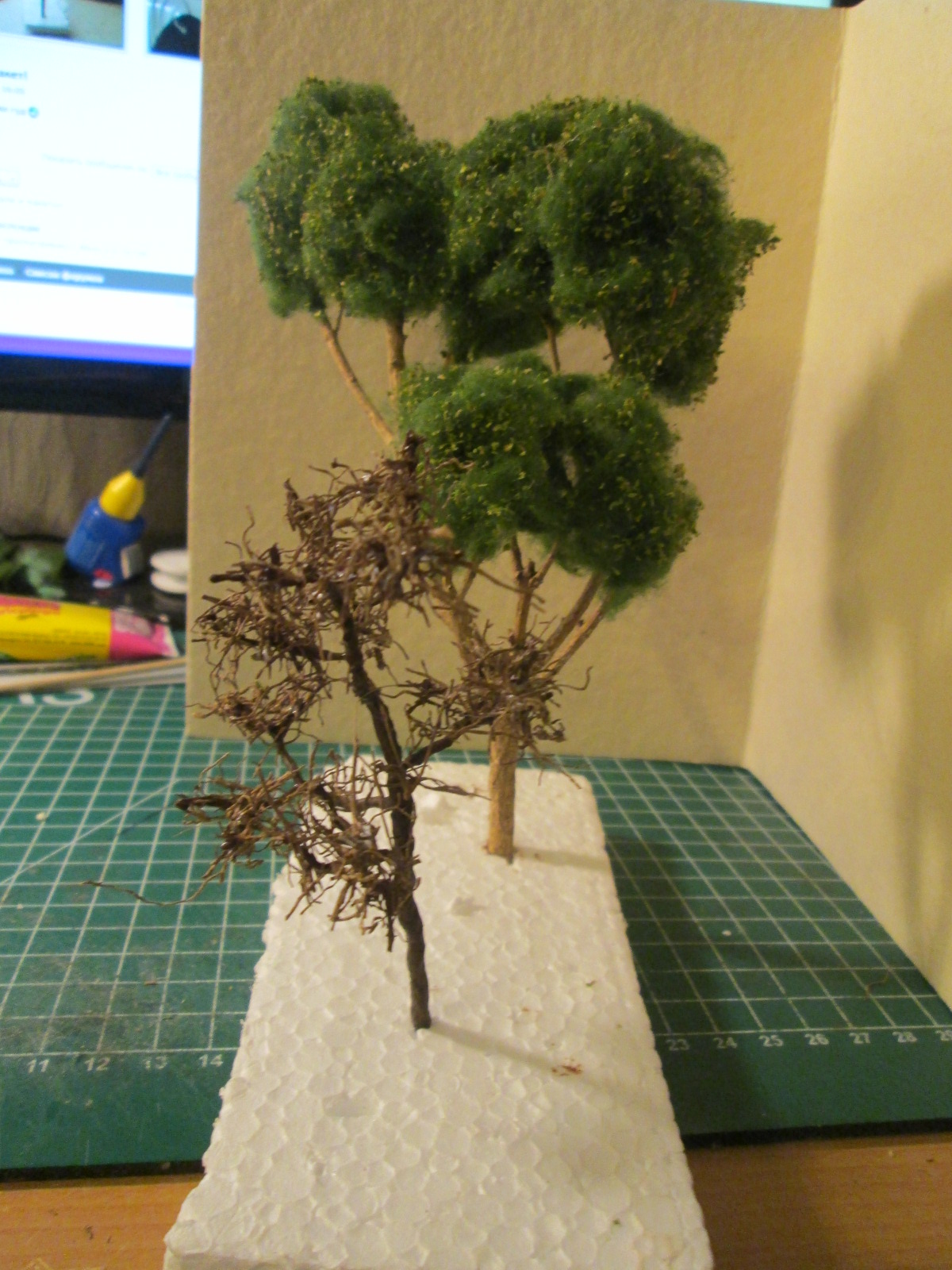 на поролоне со старого макета была присыпка. я аккуратненько с одного поролона все это снял и присыпал деревце вот так выглядит сейчас