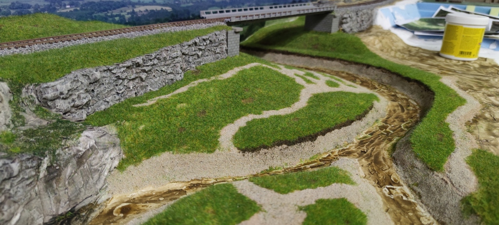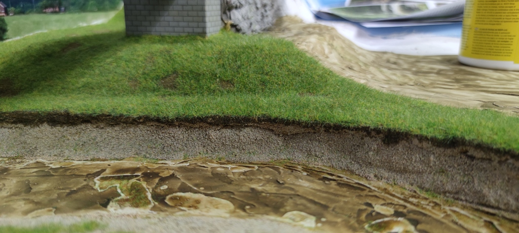 водопад. Здесь я долго думал, как сделать обрывистый песчаный берег. Речка круто заворачивает, поэтому один берег пологий, а другой подмывается водой. В итоге не стал заморачиваться, а поступил что называется "в лоб". Из гипсовой шпаклевки сформировал рельеф, затем на клей Gras-Kleber от Noch насыпал песок. На вертикальные стенки сыпал с избытком в несколько заходов. Затем пролил клеем Scenic Cement. На вертикальных стенках процедуру повторил. Затем на верхнюю кромку обрывов по такой же технологии нанес Fine Turf земляного цвета.