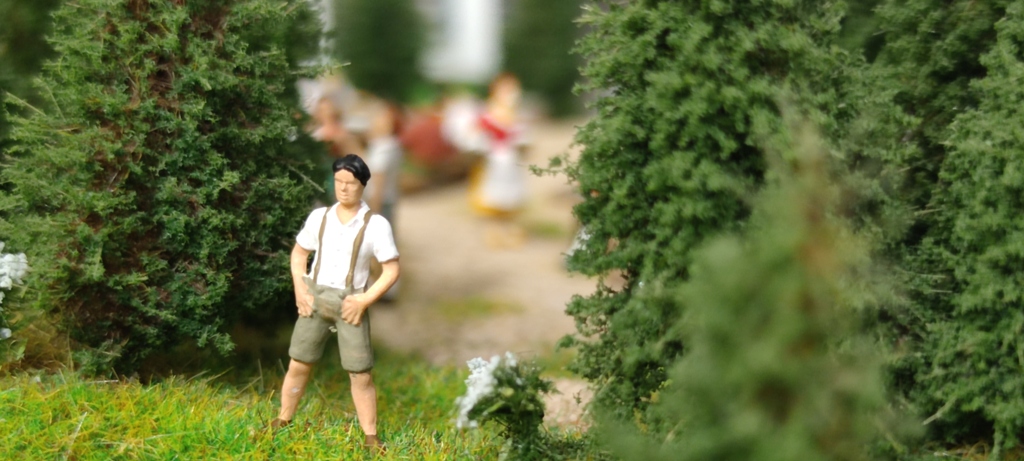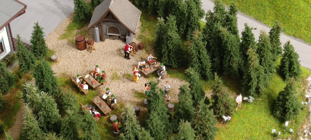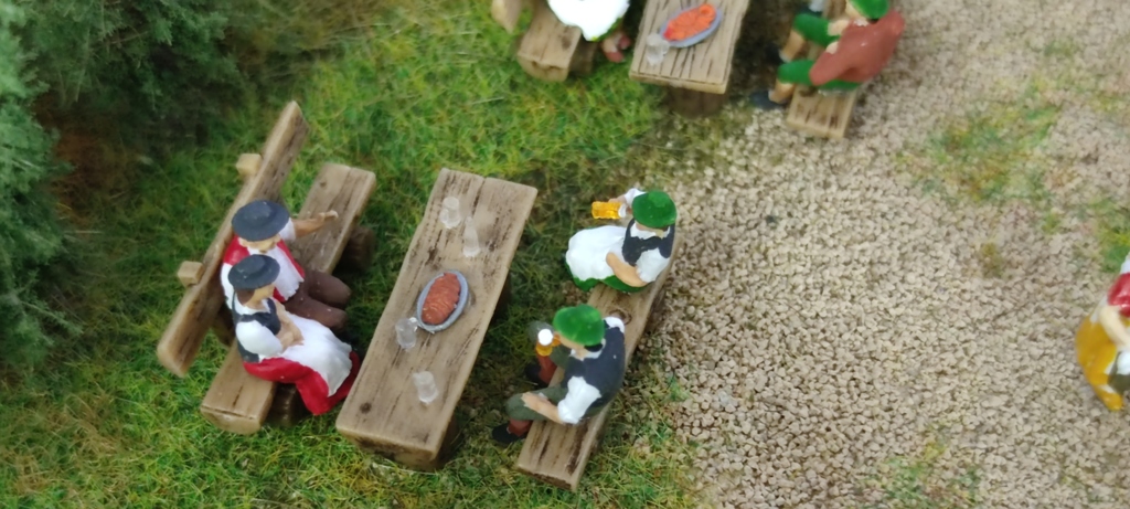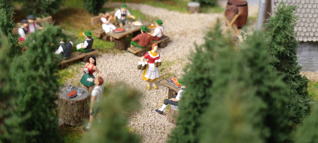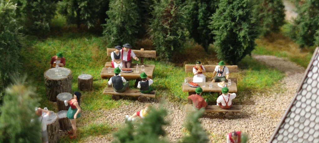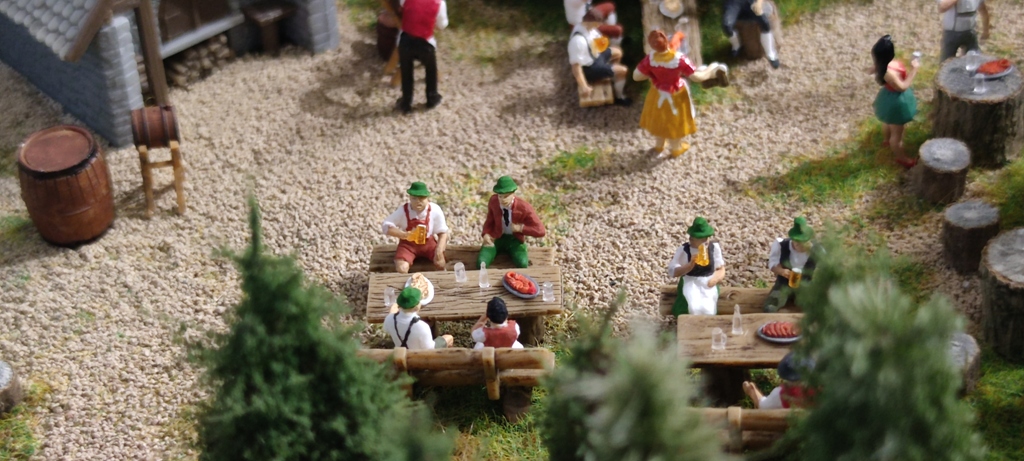 Но ничего, есть чем другим заняться по макету. Давно лежал у меня набор фигурок Preiser 16356 Im Biergarten. Наконец-то собрался, склеил и покрасил фигурки, добавил к ним несколько уже готовых фигурок Preiser, столики, скамейки, пеньки, бочки, кружки, бутылки, закуску. И вот что получилось: