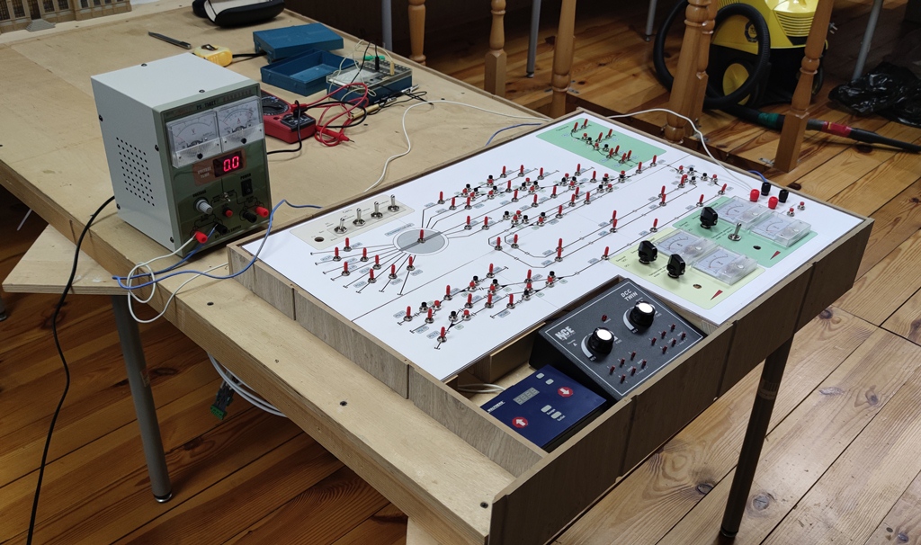 Итого на сегодня готов сам пульт. К нему подведены кабели питания для для 30 рельсовых цепей. Для остальных 30 не хватило кабеля для "последней мили". Кабели подведены и оконечены разъемами к месту установки пульта. Осталось только спаять кабель от самого пульта к этим разъемам. Аналоговые тяги запитываются от внешнего источника (лабораторный блок питания), цифровые - от пульта DCC Twin фирмы NCE. Предусмотрено подключение внешнего цифрового пульта. Также в дальнейшем будут встроены два аналоговых блока питания - отдельно для промзоны и основного макета.