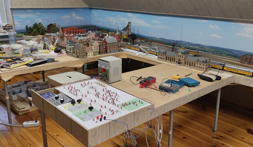 С ноября прошлого года практически все усилия на макете были направлены на создание полноценного пульта управления. Поскольку у меня бОльшая часть тяг аналоговая, задача была обеспечить совместное использование на макете и аналога и цифры. Для этого пульт управления должен иметь возможность независимого подключения к источнику питания каждой рельсовой цепи. Их у меня на макете всего 60. Поэтому самая трудоемкая часть работы - это прокладка кабелей от каждой рельсовой цепи к пульту управления. А учитывая, что для повышения надежности я припаивался к каждой рельсе (снизу к подошве рельсы - самый внешне незаметный способ), объем работ был весьма немаленький. Особенно учитывая, что все пришлось делать ползая под макетом, что совсем непросто в моем возрасте... :D Всего двухпроводного кабеля ушло около 500 м, и то не хватило примерно 20 м... :(
