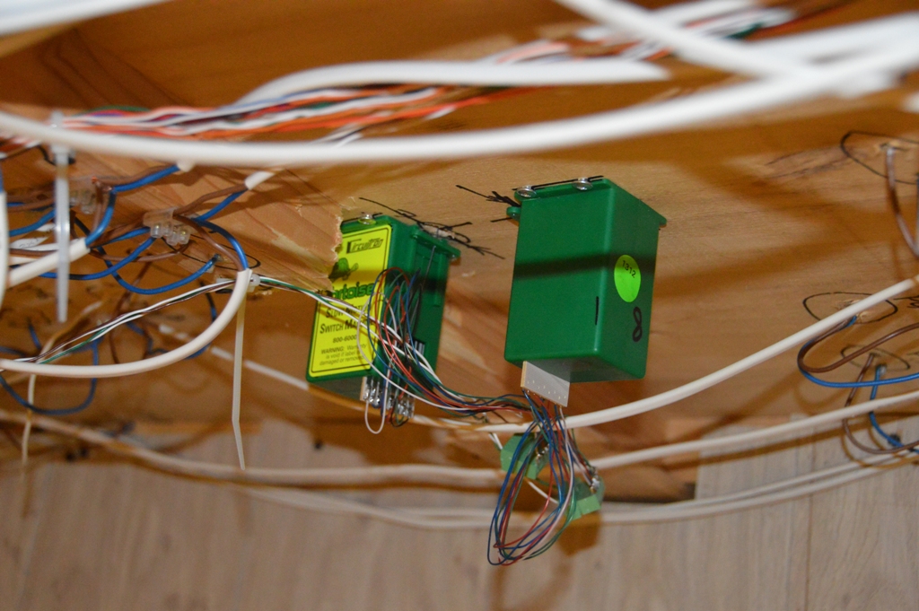 Работа над пультом управления макетом продолжается. Подключил все рельсовые цепи, установил все имеющиеся подмакетные приводы Tortoise, подключил их к пульту. На сегодня установлено 15 приводов. На 8 стрелок приводов не хватило (в свое время мало купил... :( ). С трудом нашел, где их можно сейчас заказать. Но таки нашел! Привода мне очень нравятся. Скорость перевода стрелки регулируется напряжением, подаваемым на двигатель постоянного тока. Я пробовал от 6 до 12 В, остановился на 10. Сила прижима остряков к рамным рельсам тоже регулируется. Кроме того, в приводе есть два переключателя, которые я в дальнейшем планирую использовать для управления светофорами. Особенно мне нравятся два фактора: