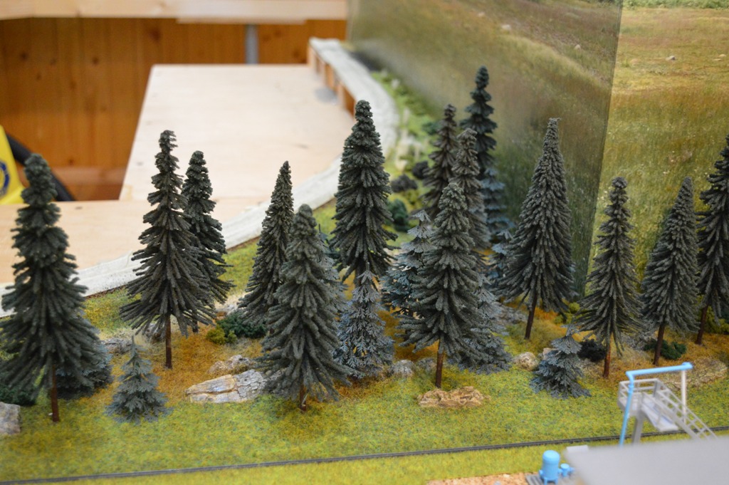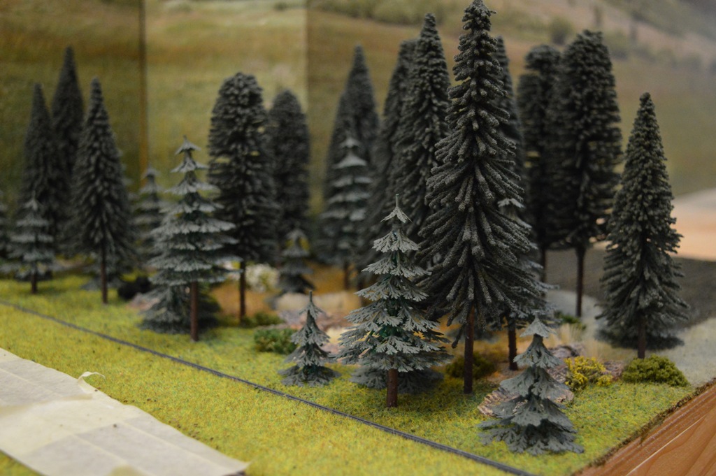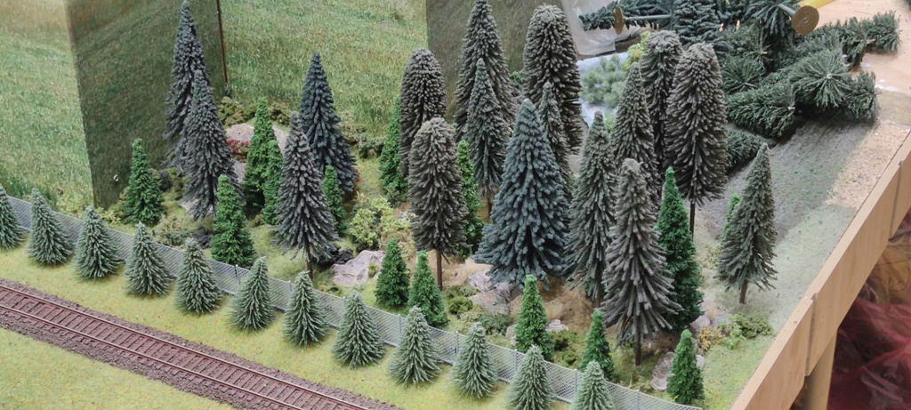 Вот уже несколько лет при взгляде на лесок возле завода меня мучила мысль заменить пластиковые ёлочки на что-то более подходящее. Этот участок был одним из самых первых на макете. Я его делал еще до попыток сделать деревья самому. Поэтому использовал покупные - несколько видов хвойных от Bachman и пластиковые ёлочки, которые у меня остались еще со старых времен. Единственное, что я с ёлочками сделал, - это родной ядовито-зеленый цвет закрасил темно-зеленым, похожим на цвет деревьев Bachman.